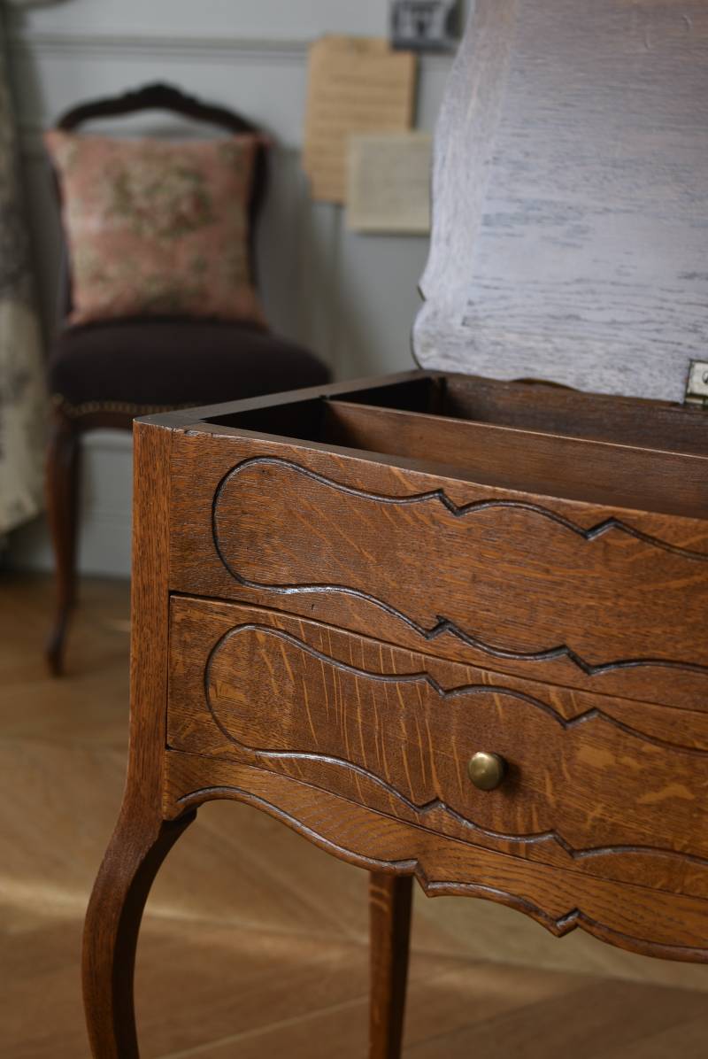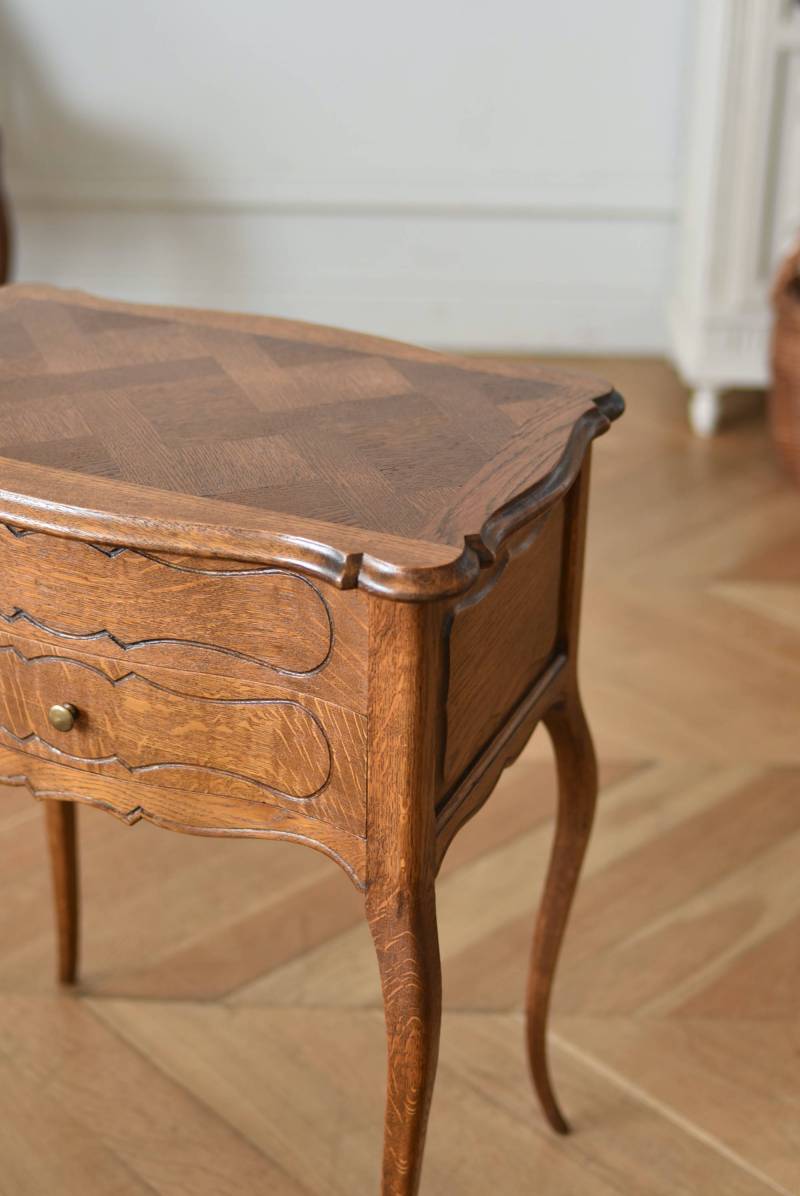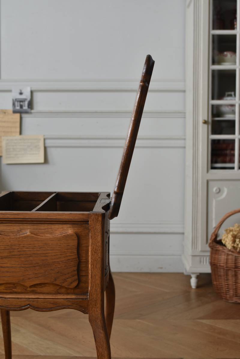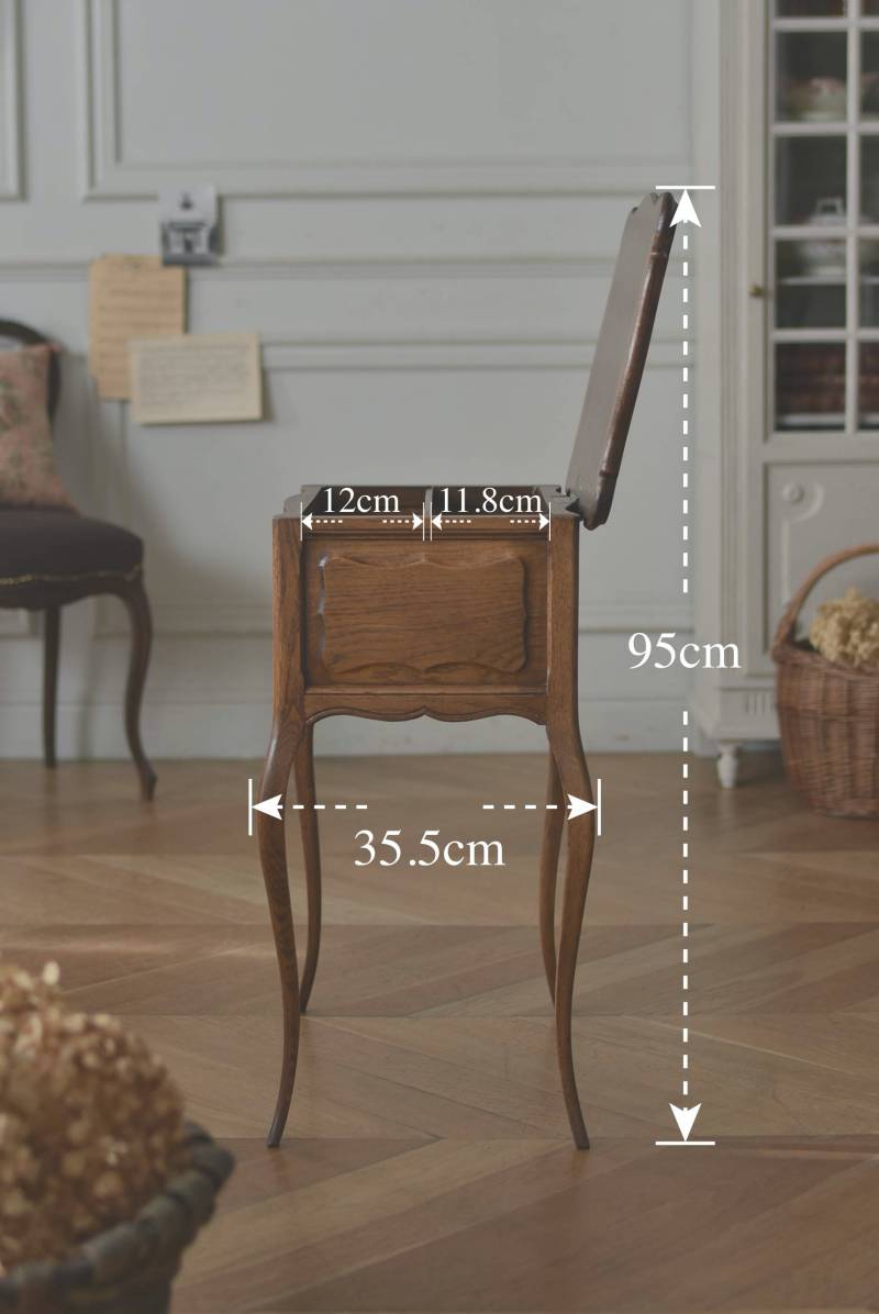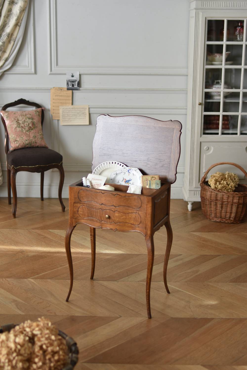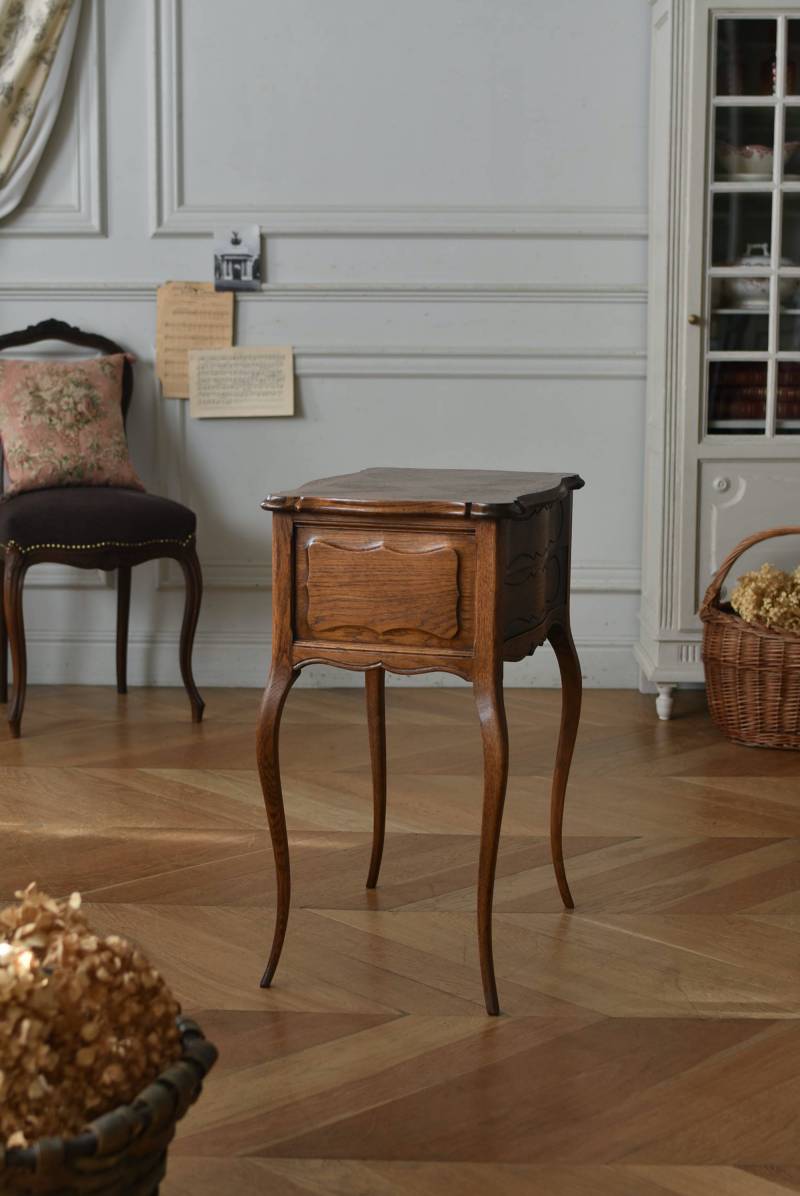 フランス1930年頃のサイドテーブル。 ミルクチョコレートのような柔らかなブラウンカラーでまとまった落ち着きある姿で、小ぶりなボディとすらりと伸びる華奢な脚元が特徴的。細やかな造形の縁ラインや表面に施されたシンプルな彫り装飾が、フランスらしい優雅なイメージをもたらしてくれます。突板模様が美しい天板を開くと仕切りのついた収納スペースが顔を出し、2段の引き出しのように見える正面は上段がダミー、下段に引き出しが1つ設けられたユニークな作りに。 コンパクトなサイズ感でお部屋にも取り入れやすく、再塗装を行った艶やかな質感でクラシカルテイストの空間にも映えるアイテムです。 W 約50.5cm D 約35.5cm H 約65cm 内寸 W約40cm×D約24cm×深さ約7cm 引き出し内寸 W約36cm×D約21.5cm×H約7.3cm こちらの商品の配送について