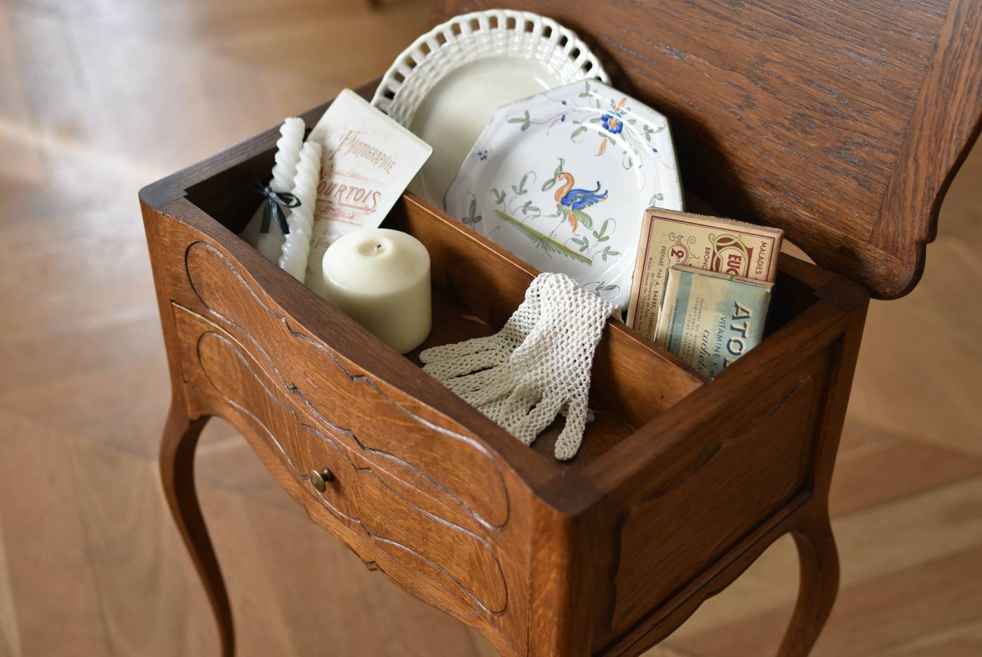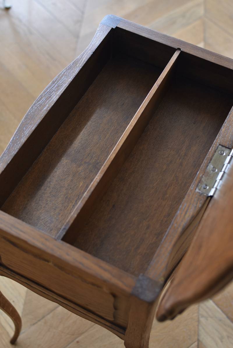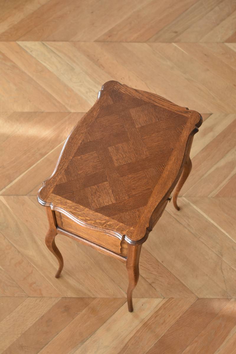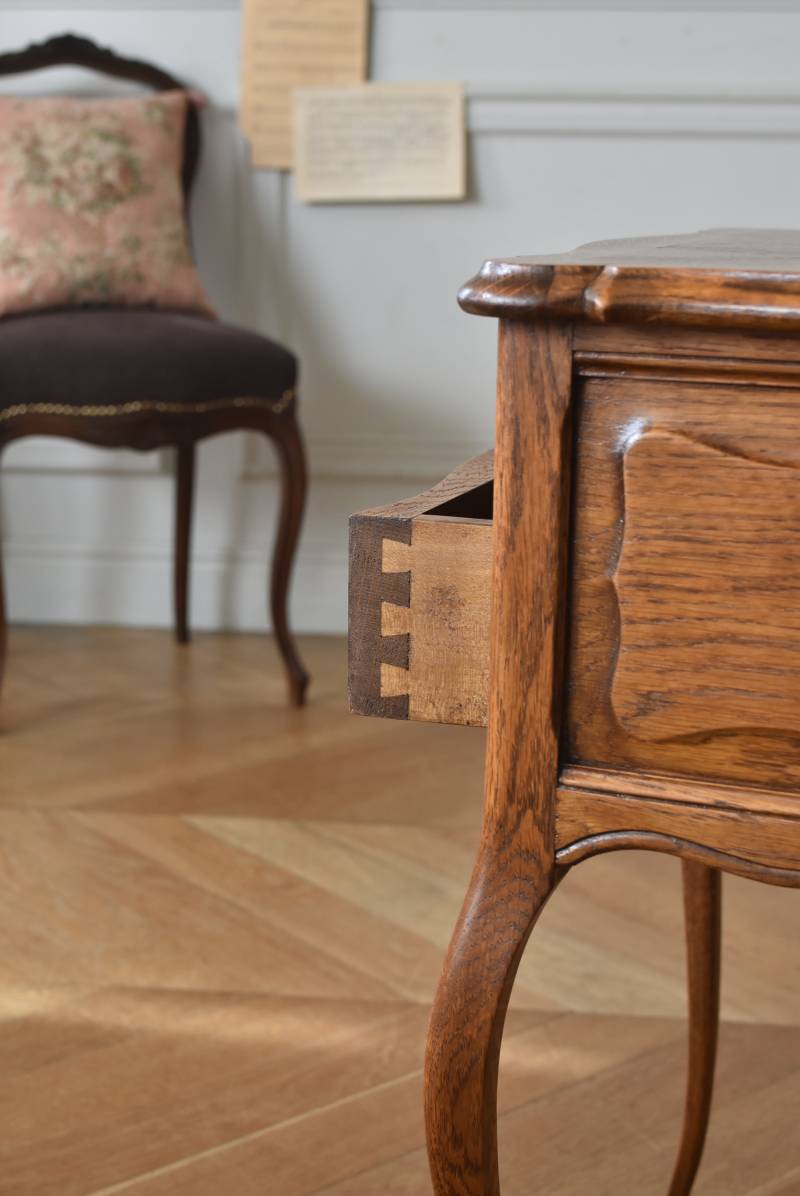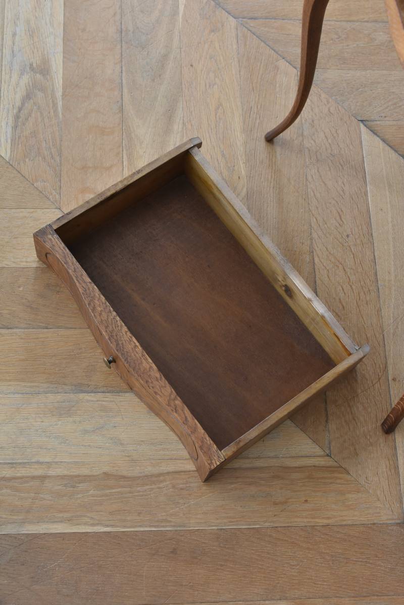 フランス1930年頃のサイドテーブル。 ミルクチョコレートのような柔らかなブラウンカラーでまとまった落ち着きある姿で、小ぶりなボディとすらりと伸びる華奢な脚元が特徴的。細やかな造形の縁ラインや表面に施されたシンプルな彫り装飾が、フランスらしい優雅なイメージをもたらしてくれます。突板模様が美しい天板を開くと仕切りのついた収納スペースが顔を出し、2段の引き出しのように見える正面は上段がダミー、下段に引き出しが1つ設けられたユニークな作りに。 コンパクトなサイズ感でお部屋にも取り入れやすく、再塗装を行った艶やかな質感でクラシカルテイストの空間にも映えるアイテムです。 W 約50.5cm D 約35.5cm H 約65cm 内寸 W約40cm×D約24cm×深さ約7cm 引き出し内寸 W約36cm×D約21.5cm×H約7.3cm こちらの商品の配送について