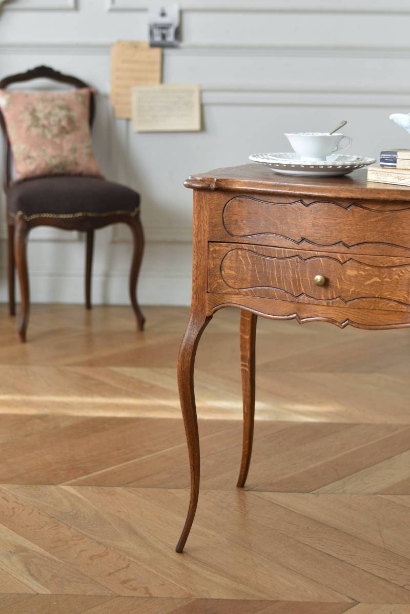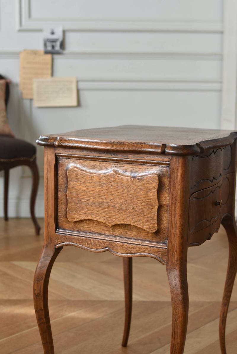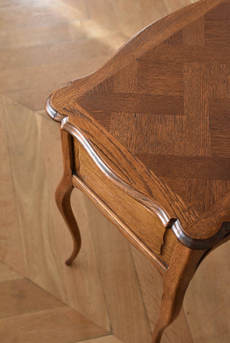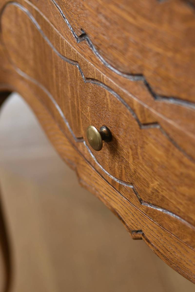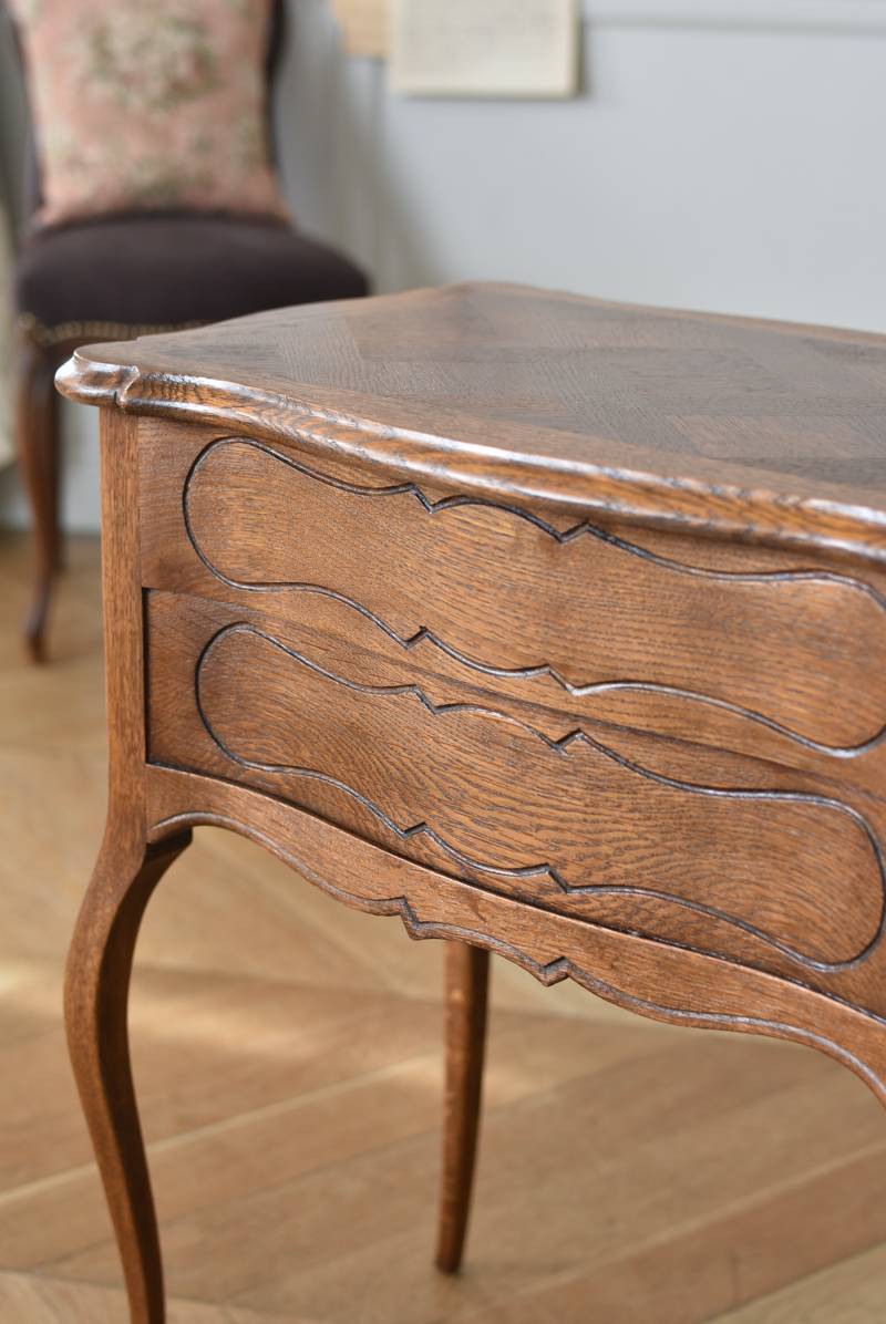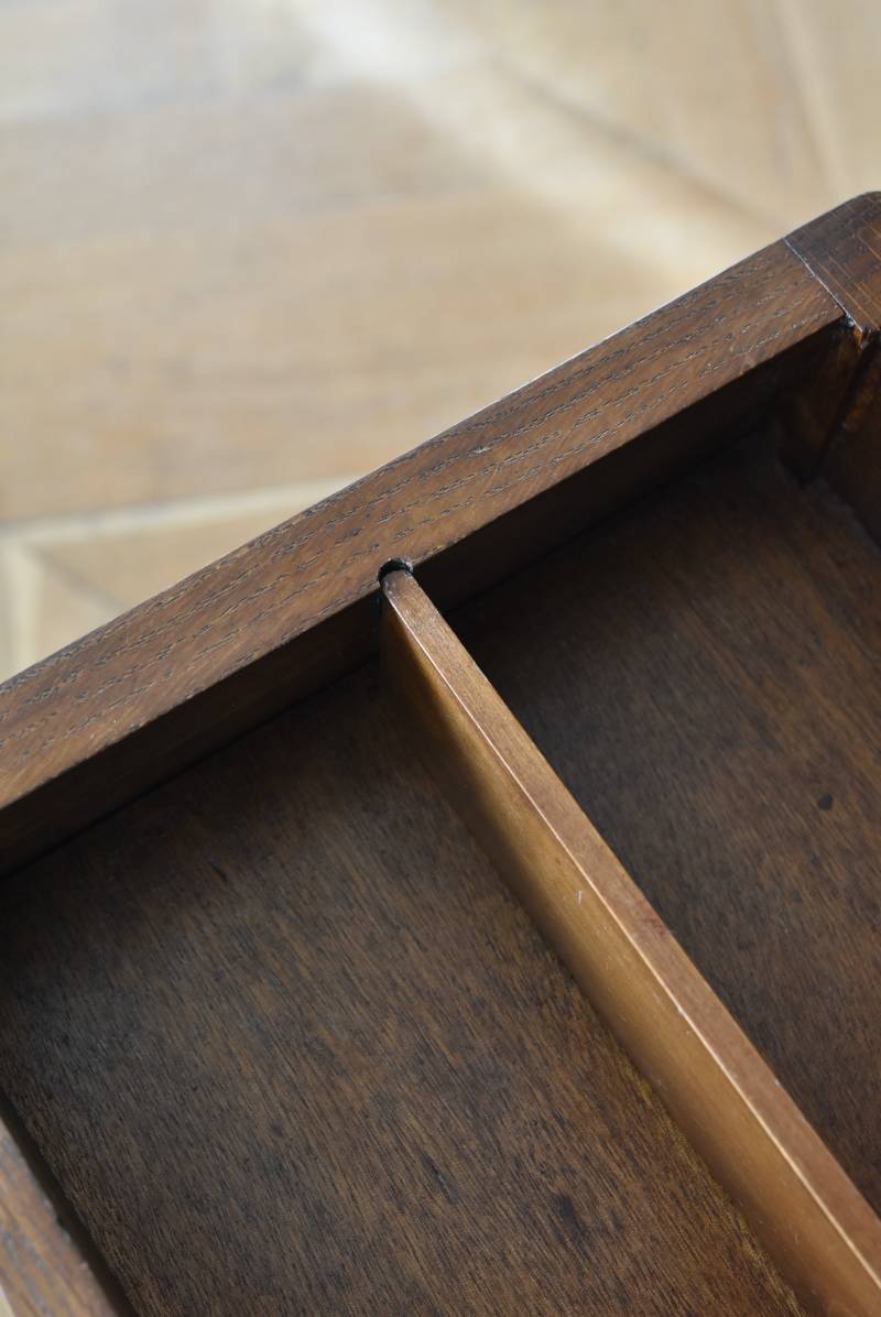 フランス1930年頃のサイドテーブル。 ミルクチョコレートのような柔らかなブラウンカラーでまとまった落ち着きある姿で、小ぶりなボディとすらりと伸びる華奢な脚元が特徴的。細やかな造形の縁ラインや表面に施されたシンプルな彫り装飾が、フランスらしい優雅なイメージをもたらしてくれます。突板模様が美しい天板を開くと仕切りのついた収納スペースが顔を出し、2段の引き出しのように見える正面は上段がダミー、下段に引き出しが1つ設けられたユニークな作りに。 コンパクトなサイズ感でお部屋にも取り入れやすく、再塗装を行った艶やかな質感でクラシカルテイストの空間にも映えるアイテムです。 W 約50.5cm D 約35.5cm H 約65cm 内寸 W約40cm×D約24cm×深さ約7cm 引き出し内寸 W約36cm×D約21.5cm×H約7.3cm こちらの商品の配送について