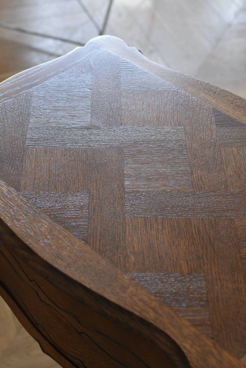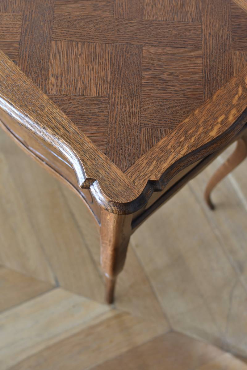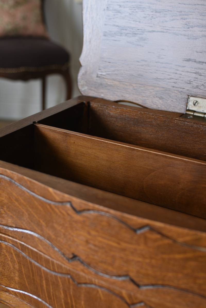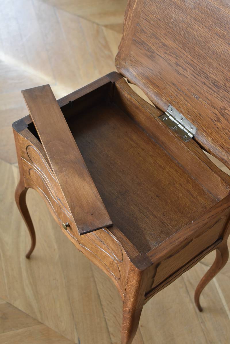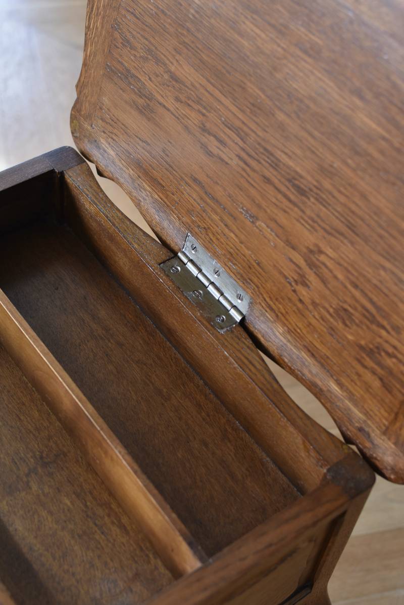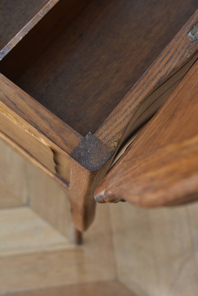 フランス1930年頃のサイドテーブル。 ミルクチョコレートのような柔らかなブラウンカラーでまとまった落ち着きある姿で、小ぶりなボディとすらりと伸びる華奢な脚元が特徴的。細やかな造形の縁ラインや表面に施されたシンプルな彫り装飾が、フランスらしい優雅なイメージをもたらしてくれます。突板模様が美しい天板を開くと仕切りのついた収納スペースが顔を出し、2段の引き出しのように見える正面は上段がダミー、下段に引き出しが1つ設けられたユニークな作りに。 コンパクトなサイズ感でお部屋にも取り入れやすく、再塗装を行った艶やかな質感でクラシカルテイストの空間にも映えるアイテムです。 W 約50.5cm D 約35.5cm H 約65cm 内寸 W約40cm×D約24cm×深さ約7cm 引き出し内寸 W約36cm×D約21.5cm×H約7.3cm こちらの商品の配送について