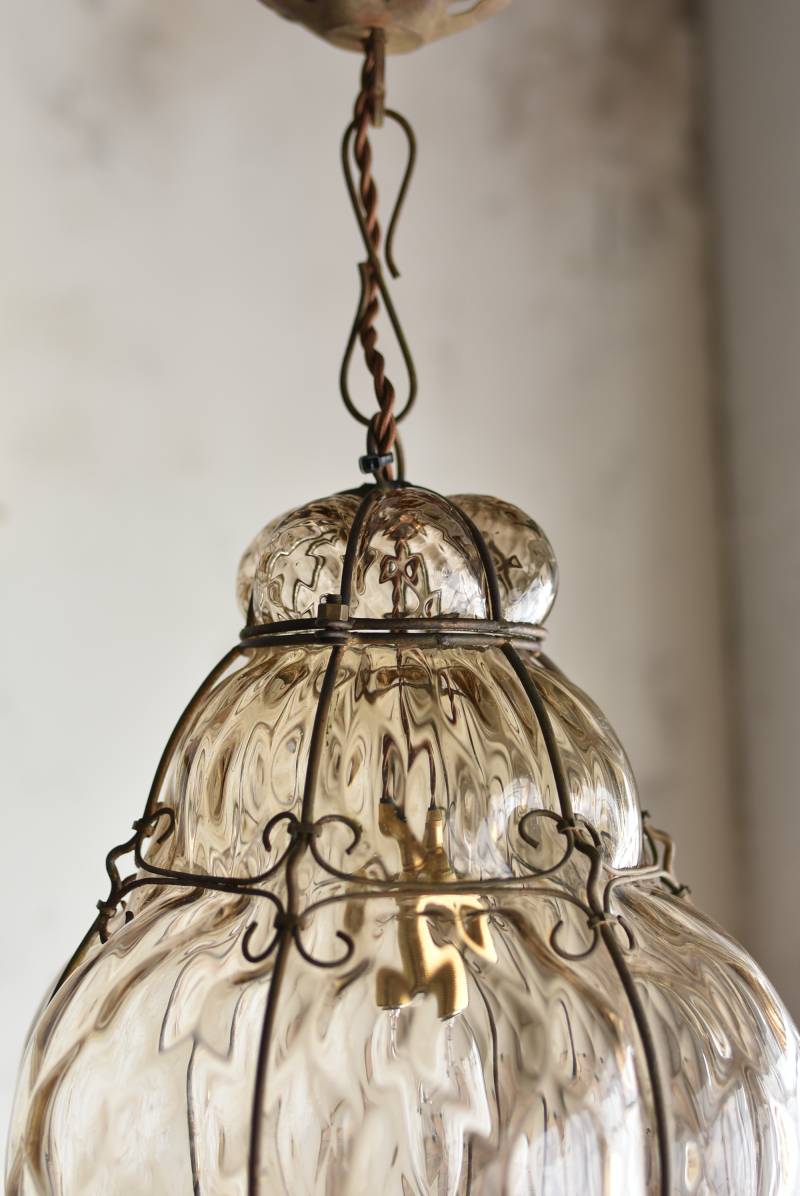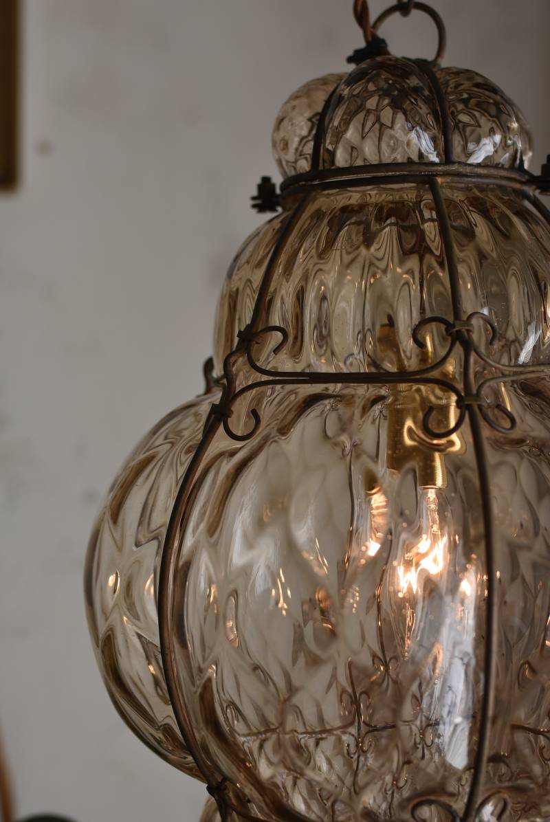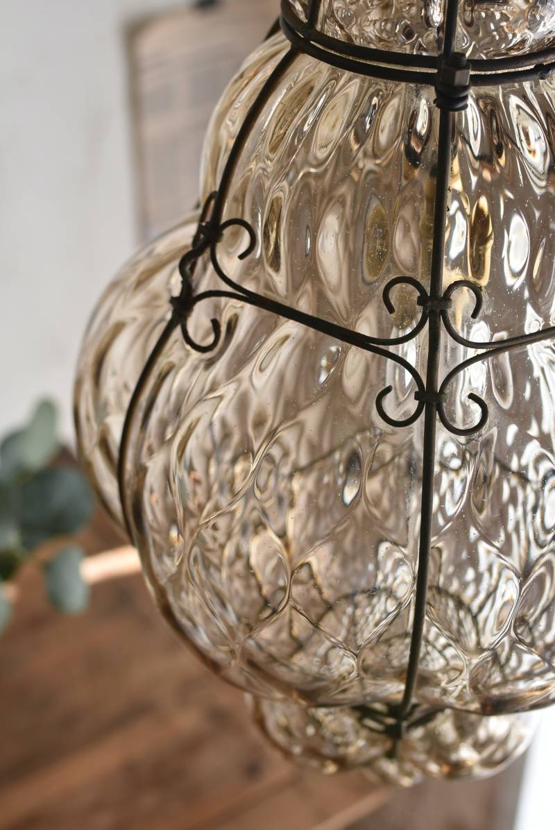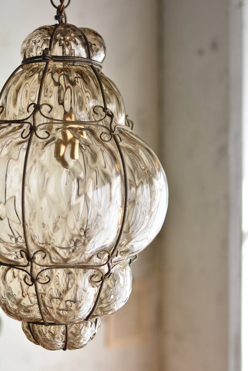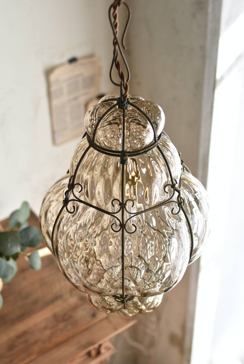 特徴的な造形が目を惹くイタリアのムラーノガラスランプ。 ぷくぷくと膨らんだユニークなシルエットのガラスは表面にもさりげなく凹凸があしらわれ、ゆらぎのある独自の表情が魅力の1つ。淡いアンバーカラーの落ち着きある姿で、くるりと丸まったアイアンホルダーがアクセントとなったシックな印象のデザインです。明かりを灯すとゆらゆらと揺らめく幻想的な見た目を楽しめ、クラシカルな空間演出に活躍してくれそう。 コード・ソケット・シーリングは新しいものに交換済み。こちらの商品は条件を満たしているので引掛シーリングをご使用いただけます。元は直付けで使われていた物で天井カバーが浅い為、天井との間に隙間ができます。天井との隙間が気になられる方は直付け工事をおすすめします。 電球は付属しません。 直径 約25cm H 約40cm コード含む全長 約55cm 重量 約2.1kg 電球口径 E17 *60W以下をご使用下さい。