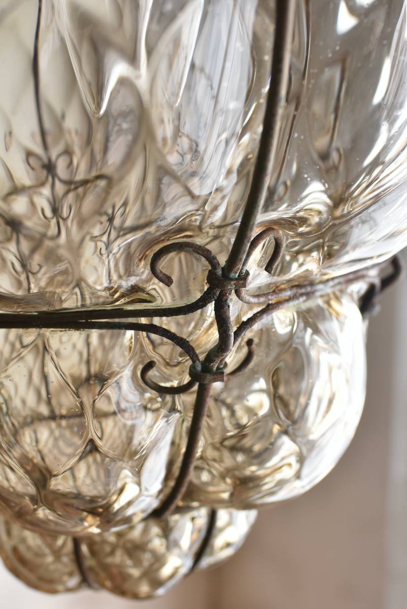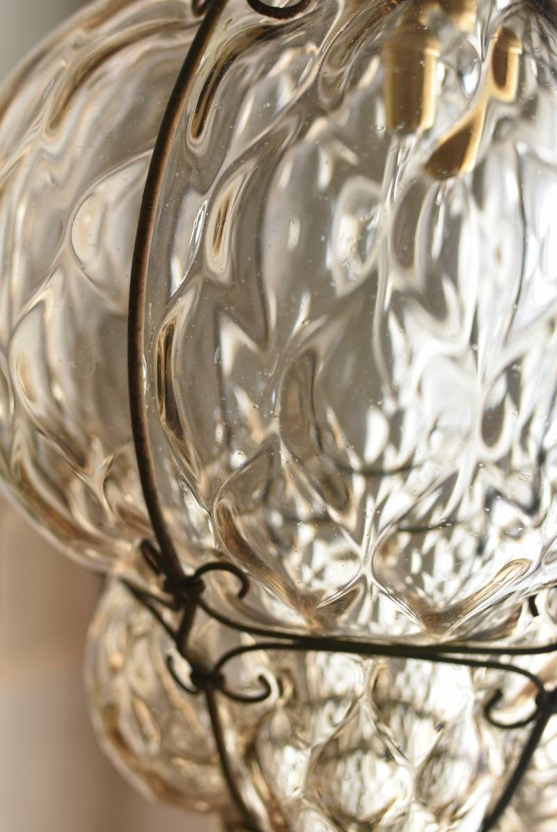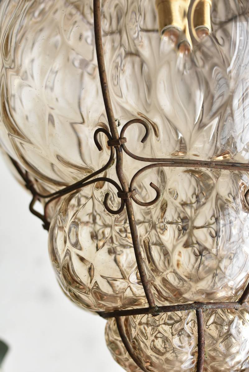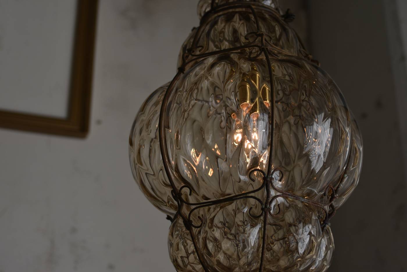 特徴的な造形が目を惹くイタリアのムラーノガラスランプ。 ぷくぷくと膨らんだユニークなシルエットのガラスは表面にもさりげなく凹凸があしらわれ、ゆらぎのある独自の表情が魅力の1つ。淡いアンバーカラーの落ち着きある姿で、くるりと丸まったアイアンホルダーがアクセントとなったシックな印象のデザインです。明かりを灯すとゆらゆらと揺らめく幻想的な見た目を楽しめ、クラシカルな空間演出に活躍してくれそう。 コード・ソケット・シーリングは新しいものに交換済み。こちらの商品は条件を満たしているので引掛シーリングをご使用いただけます。元は直付けで使われていた物で天井カバーが浅い為、天井との間に隙間ができます。天井との隙間が気になられる方は直付け工事をおすすめします。 電球は付属しません。 直径 約25cm H 約40cm コード含む全長 約55cm 重量 約2.1kg 電球口径 E17 *60W以下をご使用下さい。