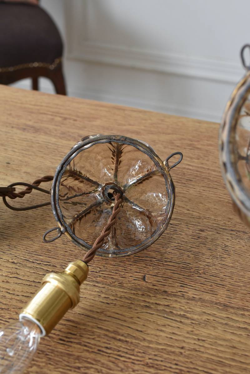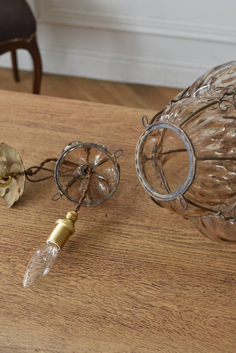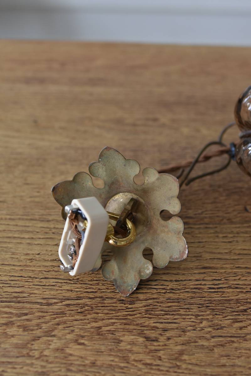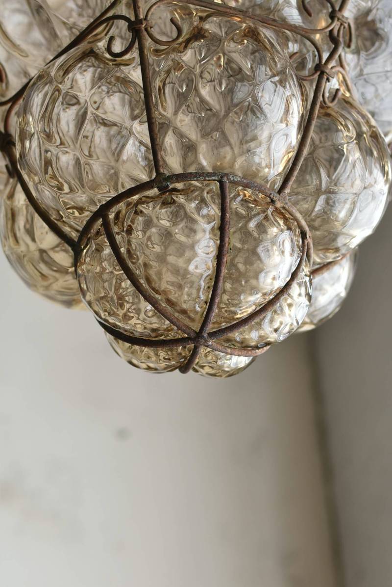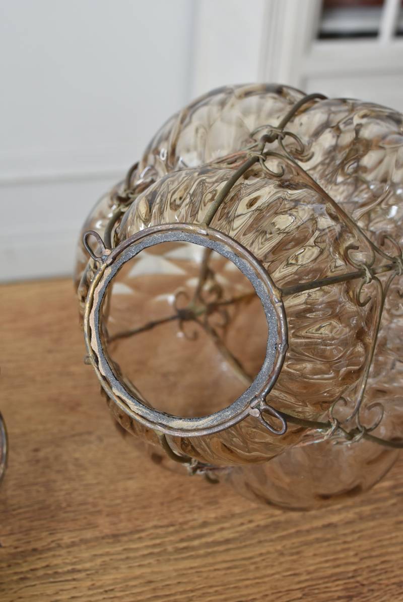 特徴的な造形が目を惹くイタリアのムラーノガラスランプ。 ぷくぷくと膨らんだユニークなシルエットのガラスは表面にもさりげなく凹凸があしらわれ、ゆらぎのある独自の表情が魅力の1つ。淡いアンバーカラーの落ち着きある姿で、くるりと丸まったアイアンホルダーがアクセントとなったシックな印象のデザインです。明かりを灯すとゆらゆらと揺らめく幻想的な見た目を楽しめ、クラシカルな空間演出に活躍してくれそう。 コード・ソケット・シーリングは新しいものに交換済み。こちらの商品は条件を満たしているので引掛シーリングをご使用いただけます。元は直付けで使われていた物で天井カバーが浅い為、天井との間に隙間ができます。天井との隙間が気になられる方は直付け工事をおすすめします。 電球は付属しません。 直径 約25cm H 約40cm コード含む全長 約55cm 重量 約2.1kg 電球口径 E17 *60W以下をご使用下さい。