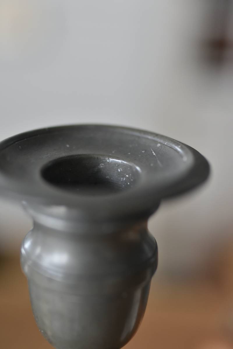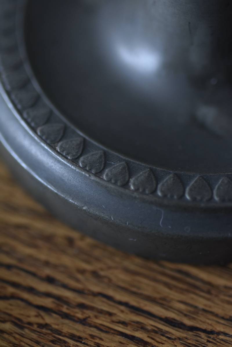マットな質感で深みのあるグレーが印象的なエタン(錫)製で、素材ならではのシックな表情が魅力的。凹凸のはっきりとしたシルエットが美しく、脚元にあしらわれた細やかな連続模様がアクセントとなったデザインです。古いものならではの趣豊かな風合いが独自の存在感を漂わせ、雰囲気あるテーブルコーディネートに活躍してくれそう。