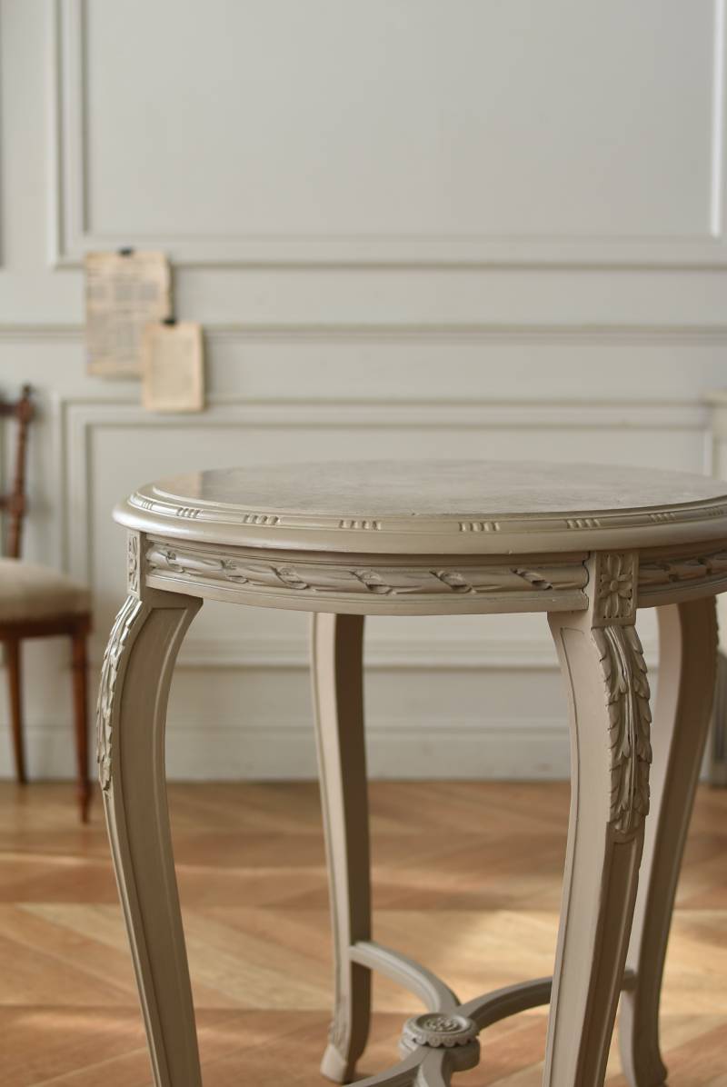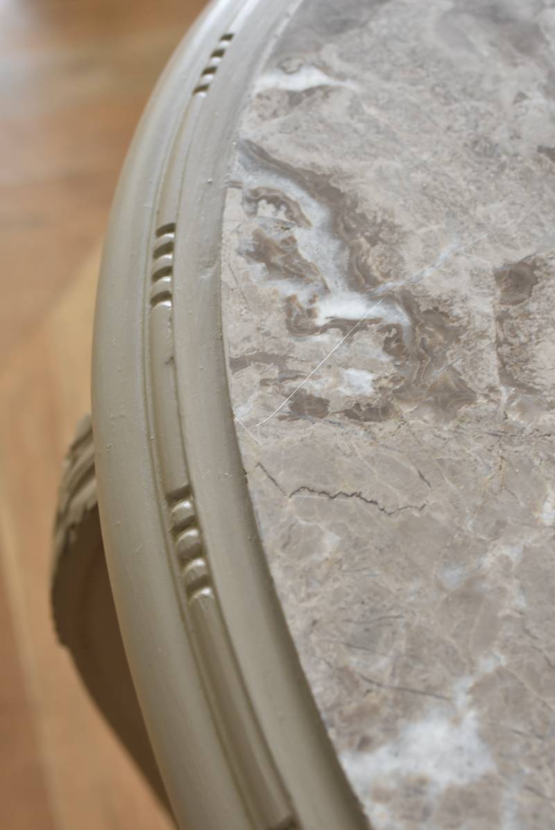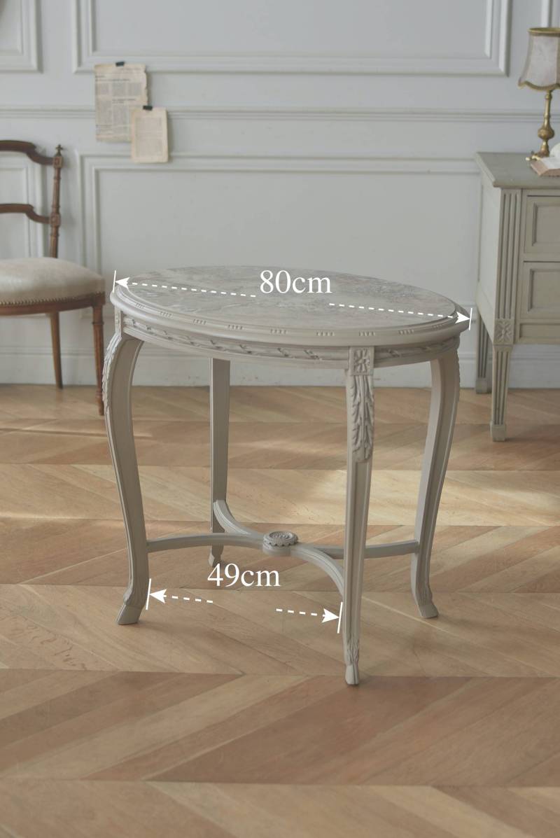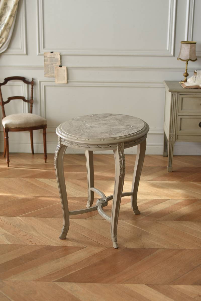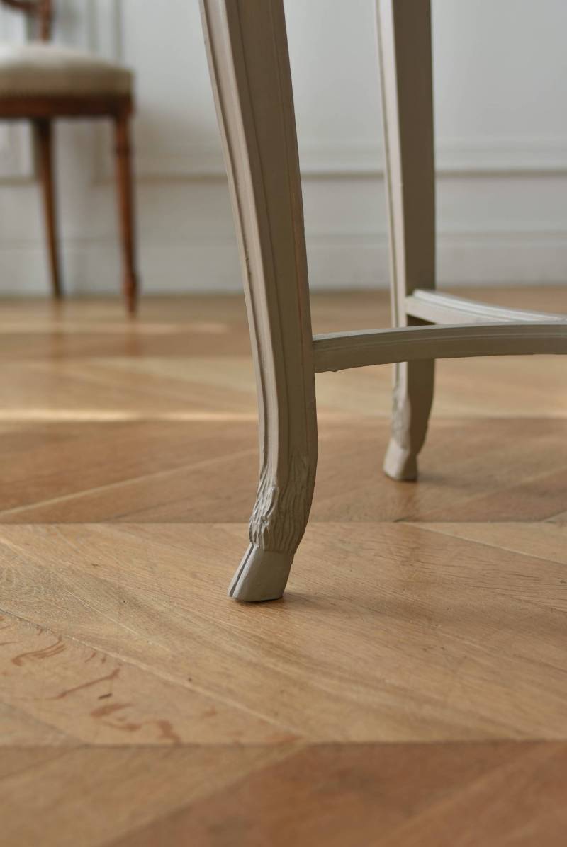 ややベージュがかったグレー調のペイントが施されたボディに、柔らかな色味のマーブルストーン(大理石)が天板としてあしらわれた上品な印象の佇まい。しなやかなラインを描くカブリオールレッグが美しく、脚の付け根にはアカンサスと小花、フット部分には蹄の装飾が丁寧にあしらわれたこだわりたっぷりの造形が魅力的です。貫装飾にも細やかなお花模様が施されており、隅々まで楽しめる見目麗しい逸品に。