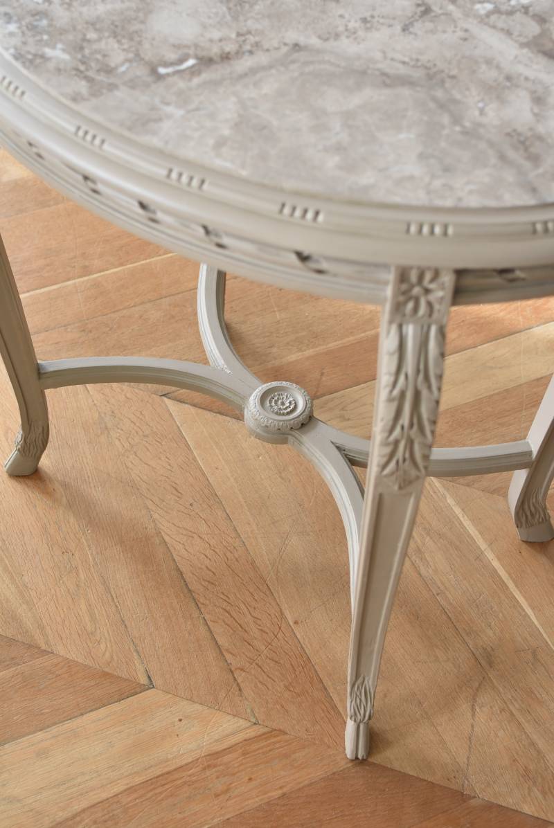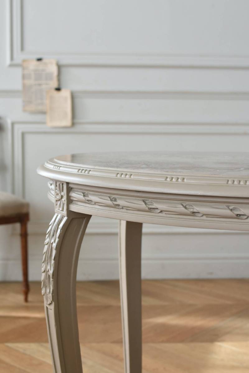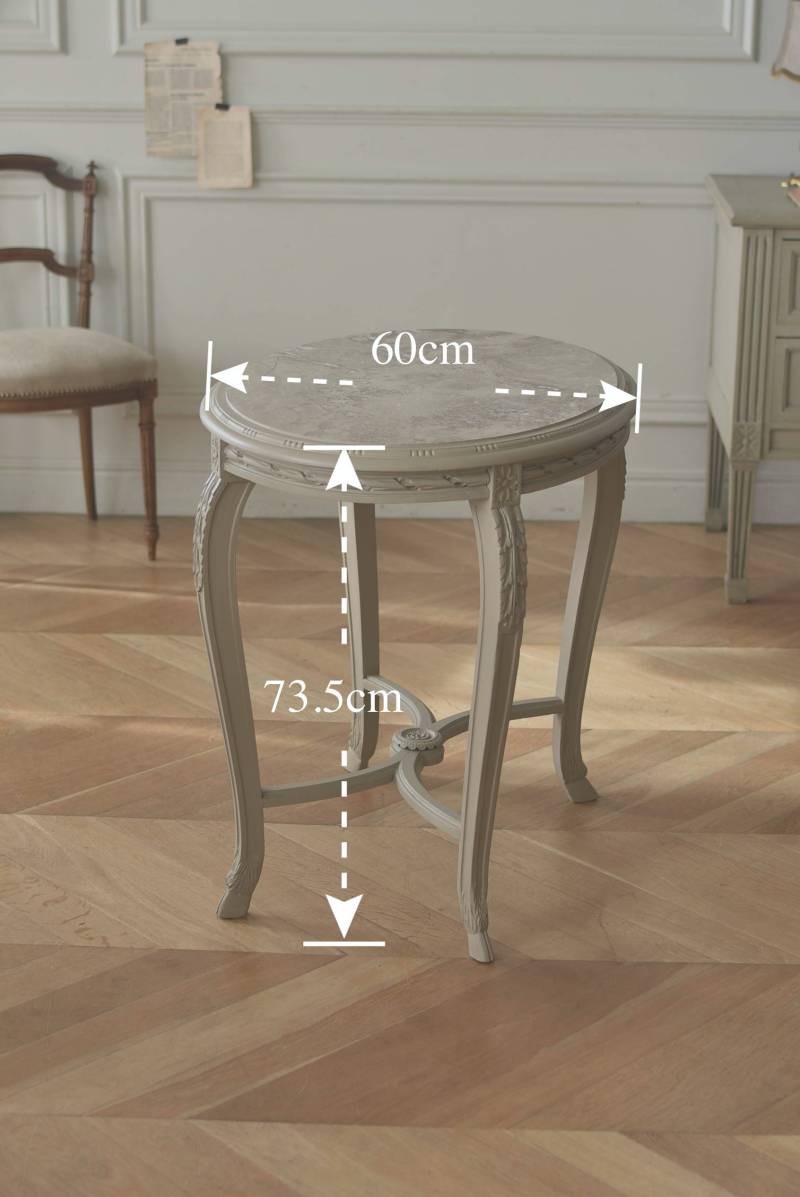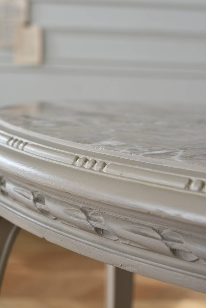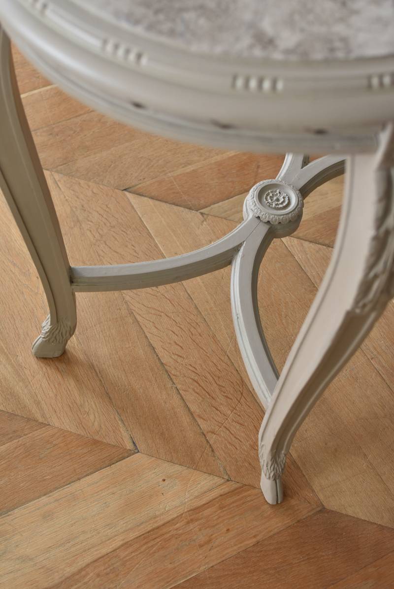 ややベージュがかったグレー調のペイントが施されたボディに、柔らかな色味のマーブルストーン(大理石)が天板としてあしらわれた上品な印象の佇まい。しなやかなラインを描くカブリオールレッグが美しく、脚の付け根にはアカンサスと小花、フット部分には蹄の装飾が丁寧にあしらわれたこだわりたっぷりの造形が魅力的です。貫装飾にも細やかなお花模様が施されており、隅々まで楽しめる見目麗しい逸品に。