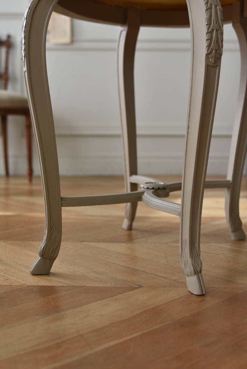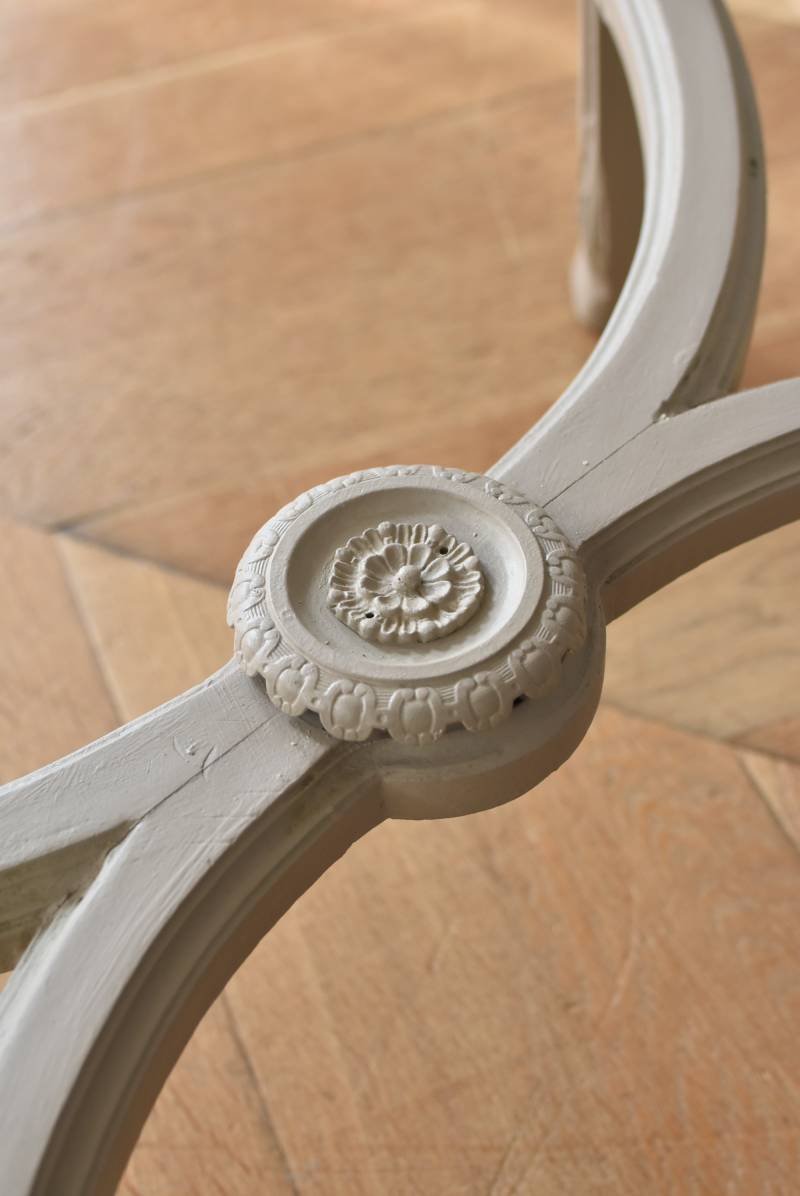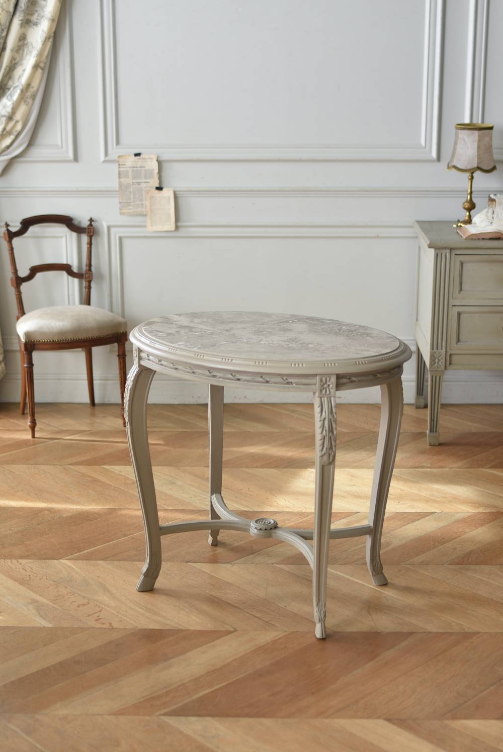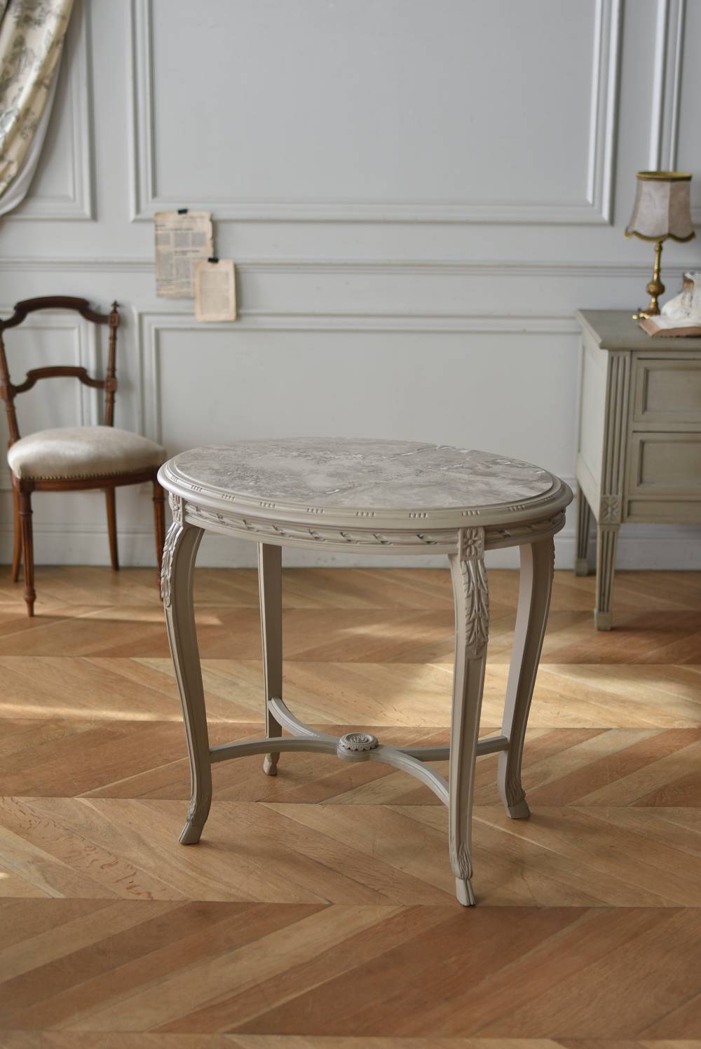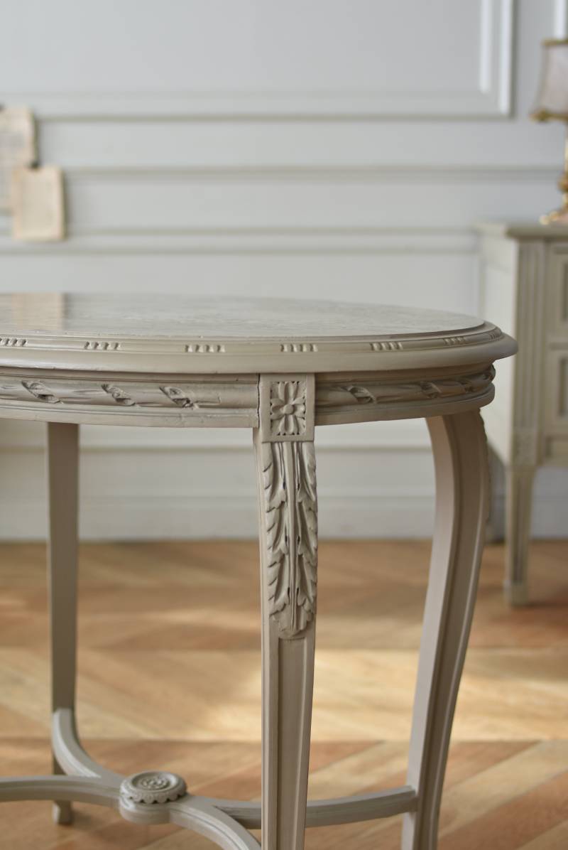 ややベージュがかったグレー調のペイントが施されたボディに、柔らかな色味のマーブルストーン(大理石)が天板としてあしらわれた上品な印象の佇まい。しなやかなラインを描くカブリオールレッグが美しく、脚の付け根にはアカンサスと小花、フット部分には蹄の装飾が丁寧にあしらわれたこだわりたっぷりの造形が魅力的です。貫装飾にも細やかなお花模様が施されており、隅々まで楽しめる見目麗しい逸品に。