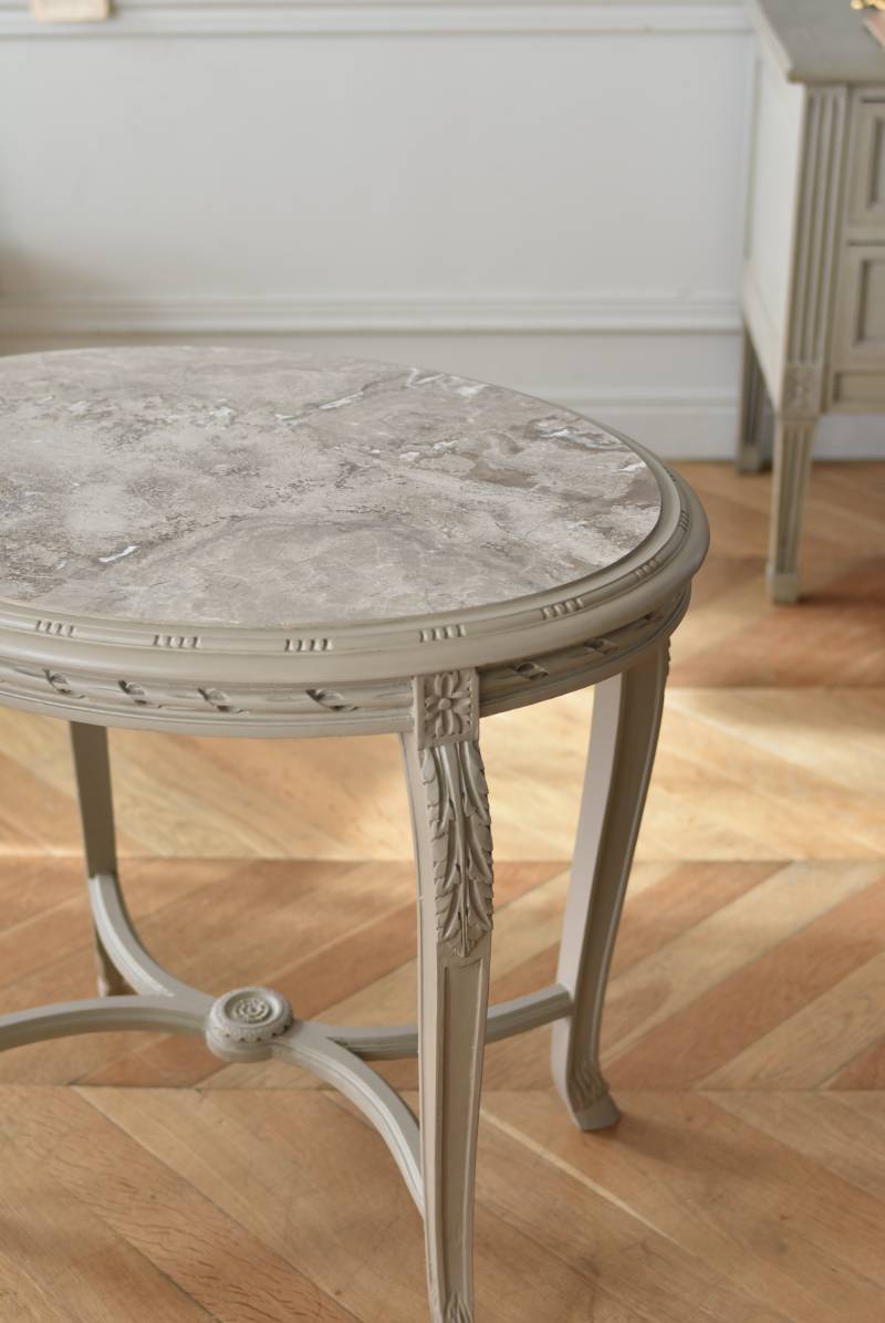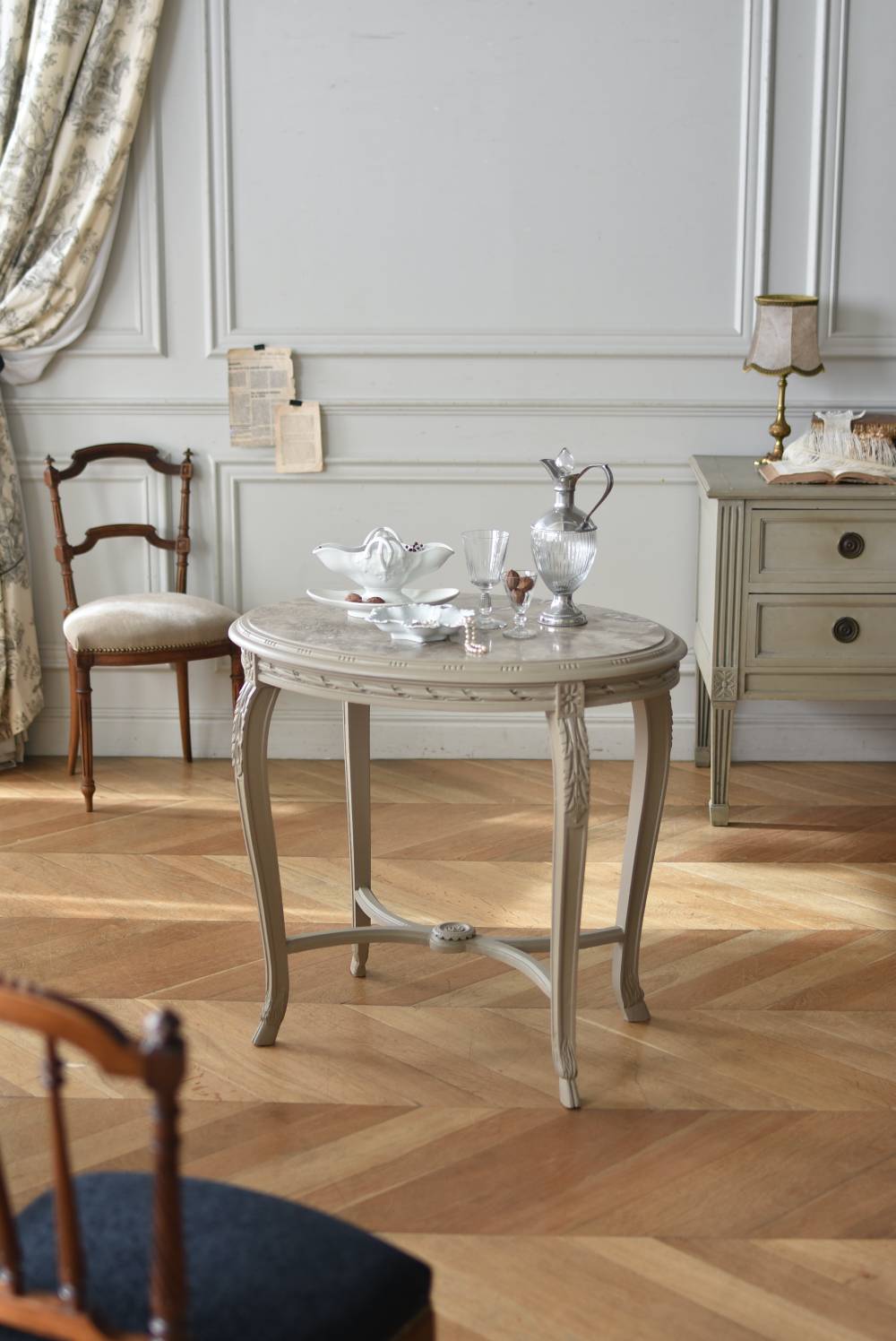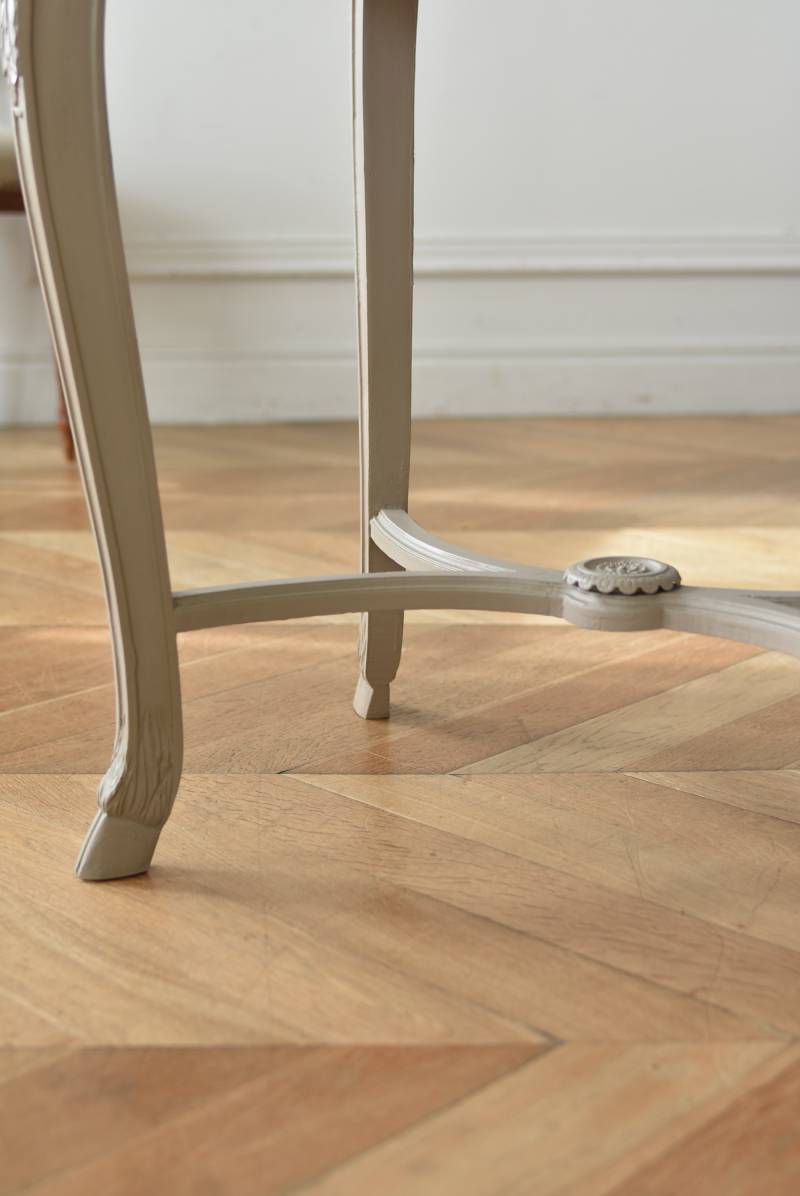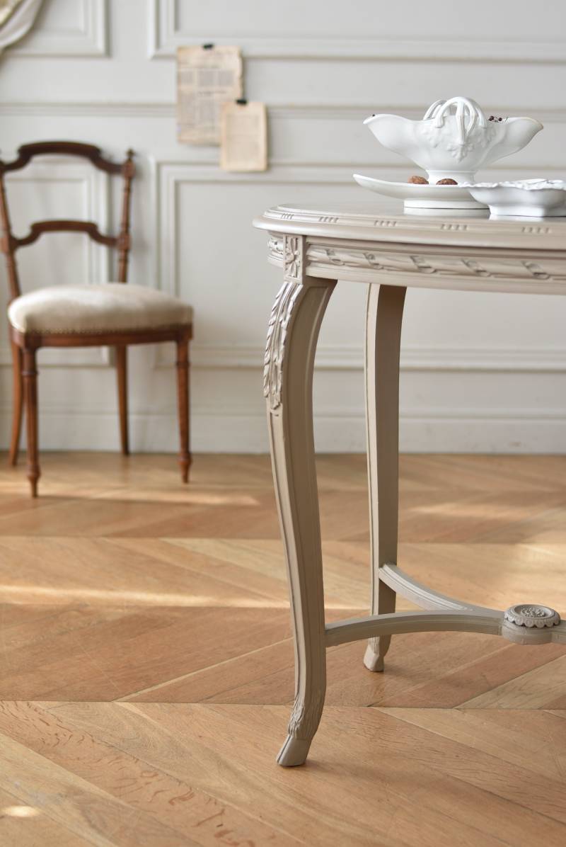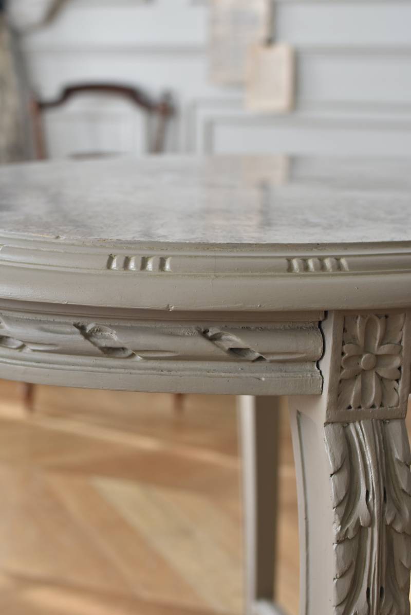 ややベージュがかったグレー調のペイントが施されたボディに、柔らかな色味のマーブルストーン(大理石)が天板としてあしらわれた上品な印象の佇まい。しなやかなラインを描くカブリオールレッグが美しく、脚の付け根にはアカンサスと小花、フット部分には蹄の装飾が丁寧にあしらわれたこだわりたっぷりの造形が魅力的です。貫装飾にも細やかなお花模様が施されており、隅々まで楽しめる見目麗しい逸品に。