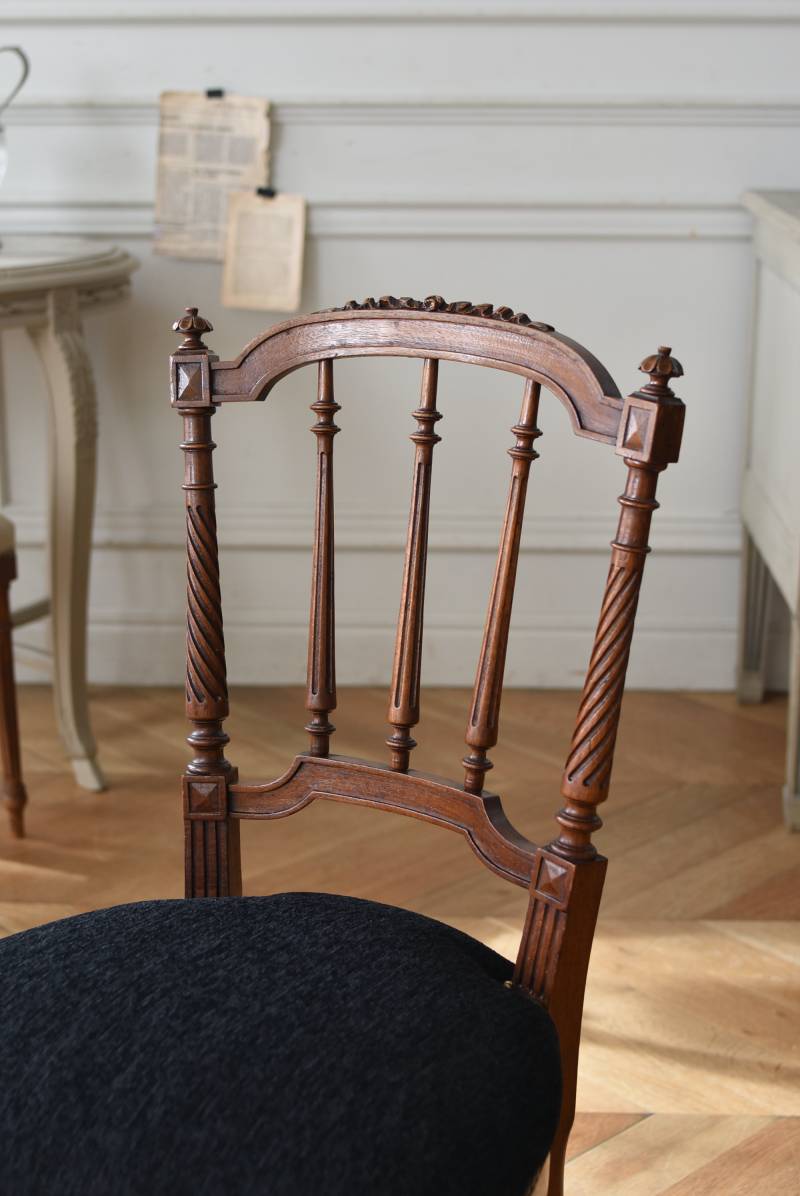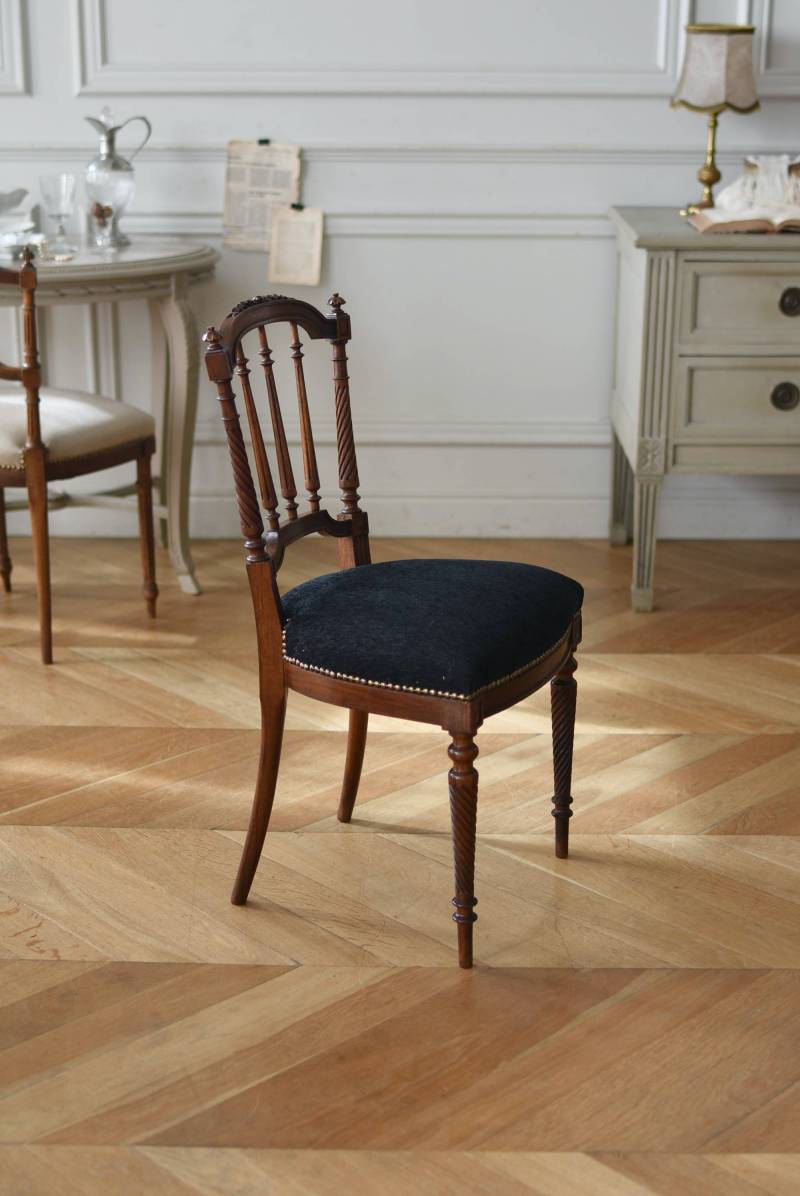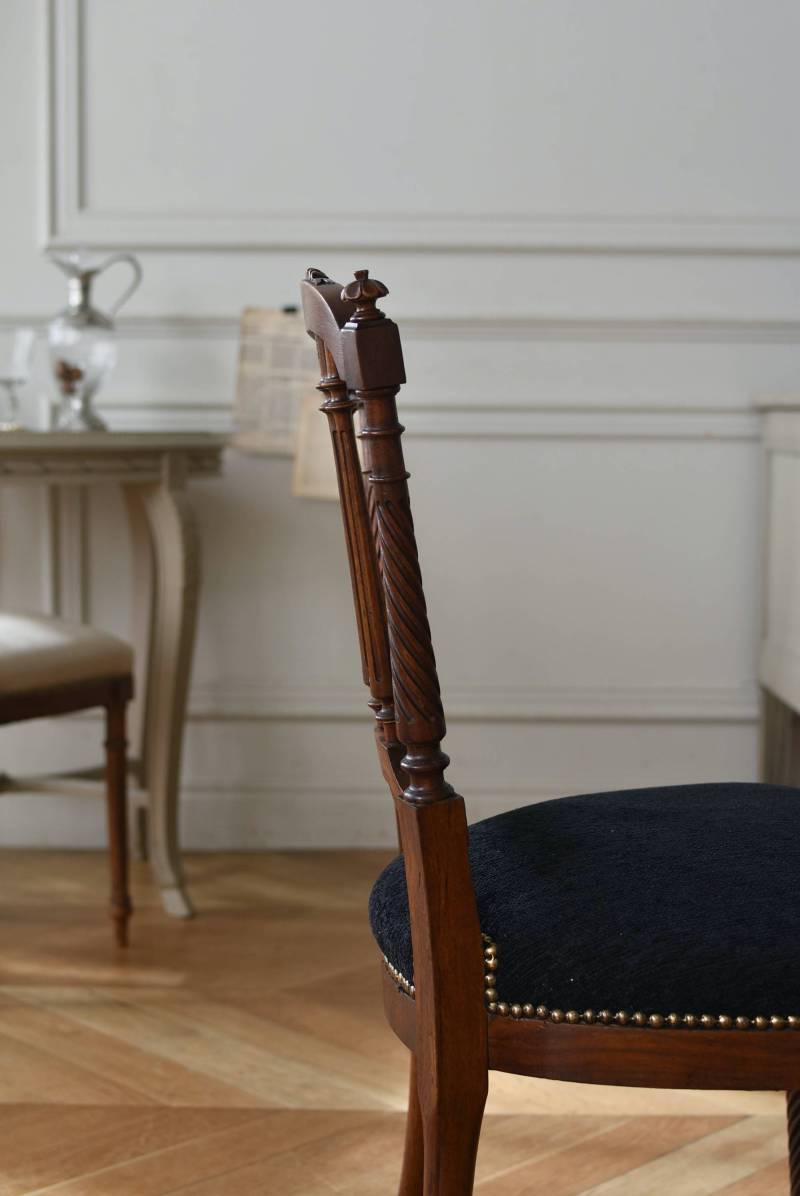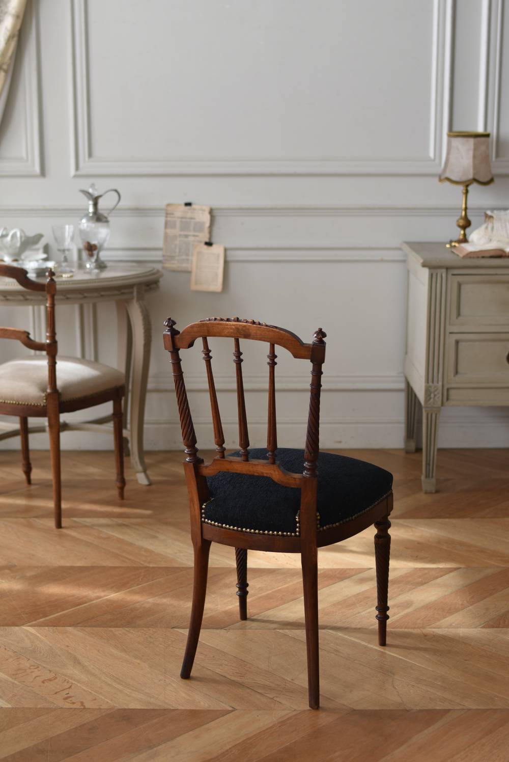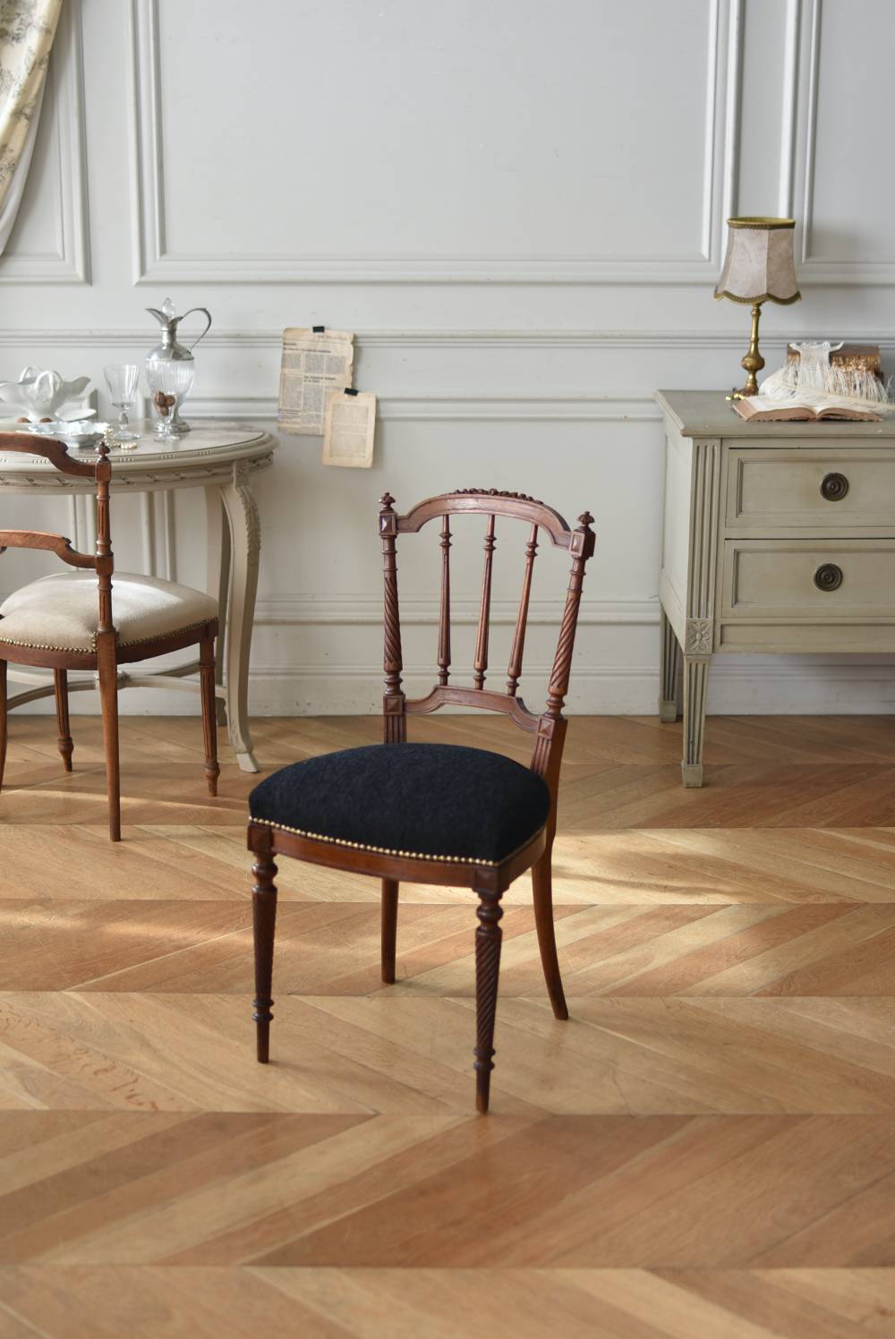 フランスのアンティークチェア。 こっくりとした深みのあるブラウンカラーのフレームにシックな色味のファブリックが組み合わせられたクラシカルな印象の佇まい。くるりと捻られたような溝模様やラインの美しい3本柱、さりげないリボンモチーフがあしらわれたルイ16世スタイルの格式高いデザインです。 フレームは一度バラして組み直しを行っています。座面のファブリックは新しく張り直し、中もウレタンに交換しているので程よい沈み込みのある座り心地に。 凛とした美しさはフランスらしい優雅さを演出し、威厳漂う空間作りに活躍してくれるアイテムです。 W 約42cm D 約44.5cm H 約85cm 座面までのH 約47.5cm