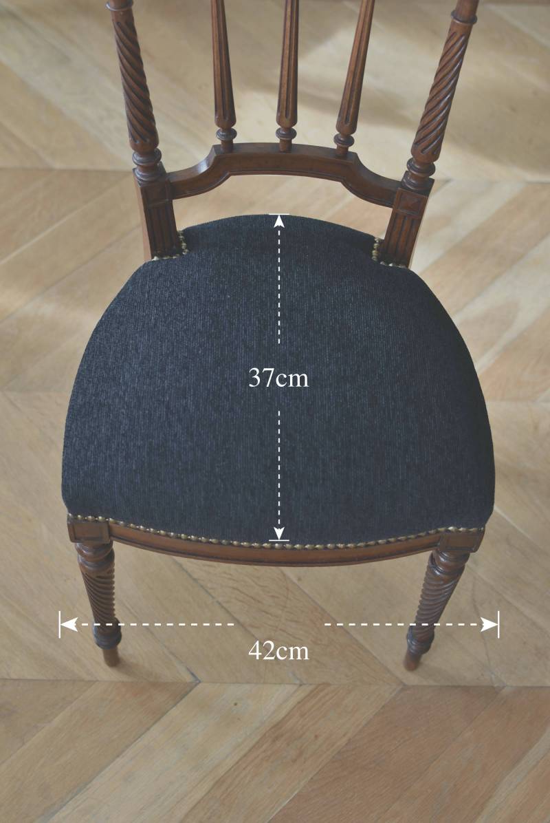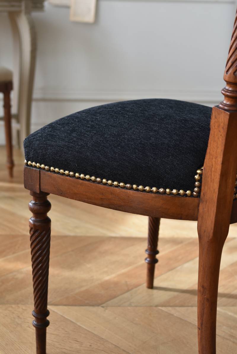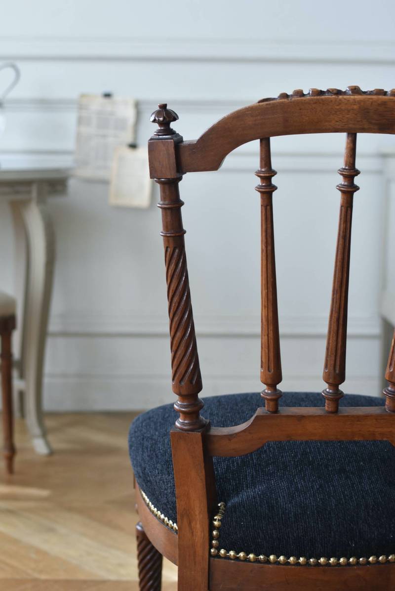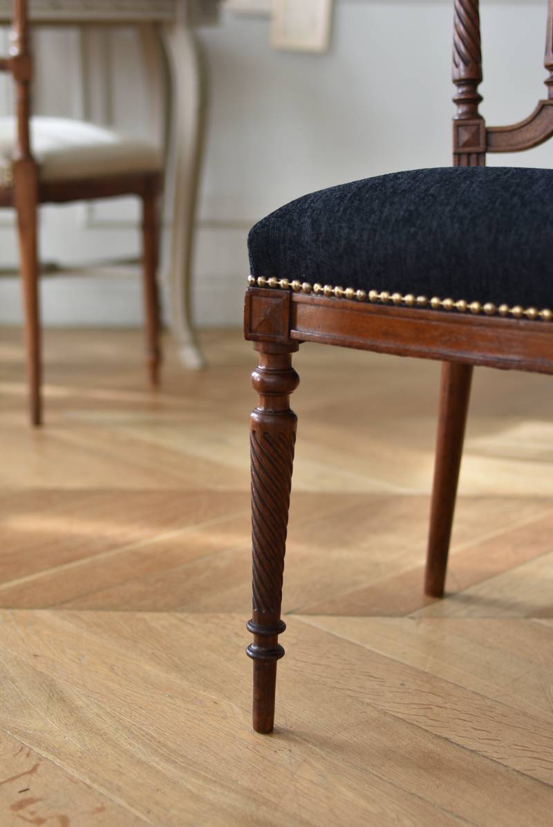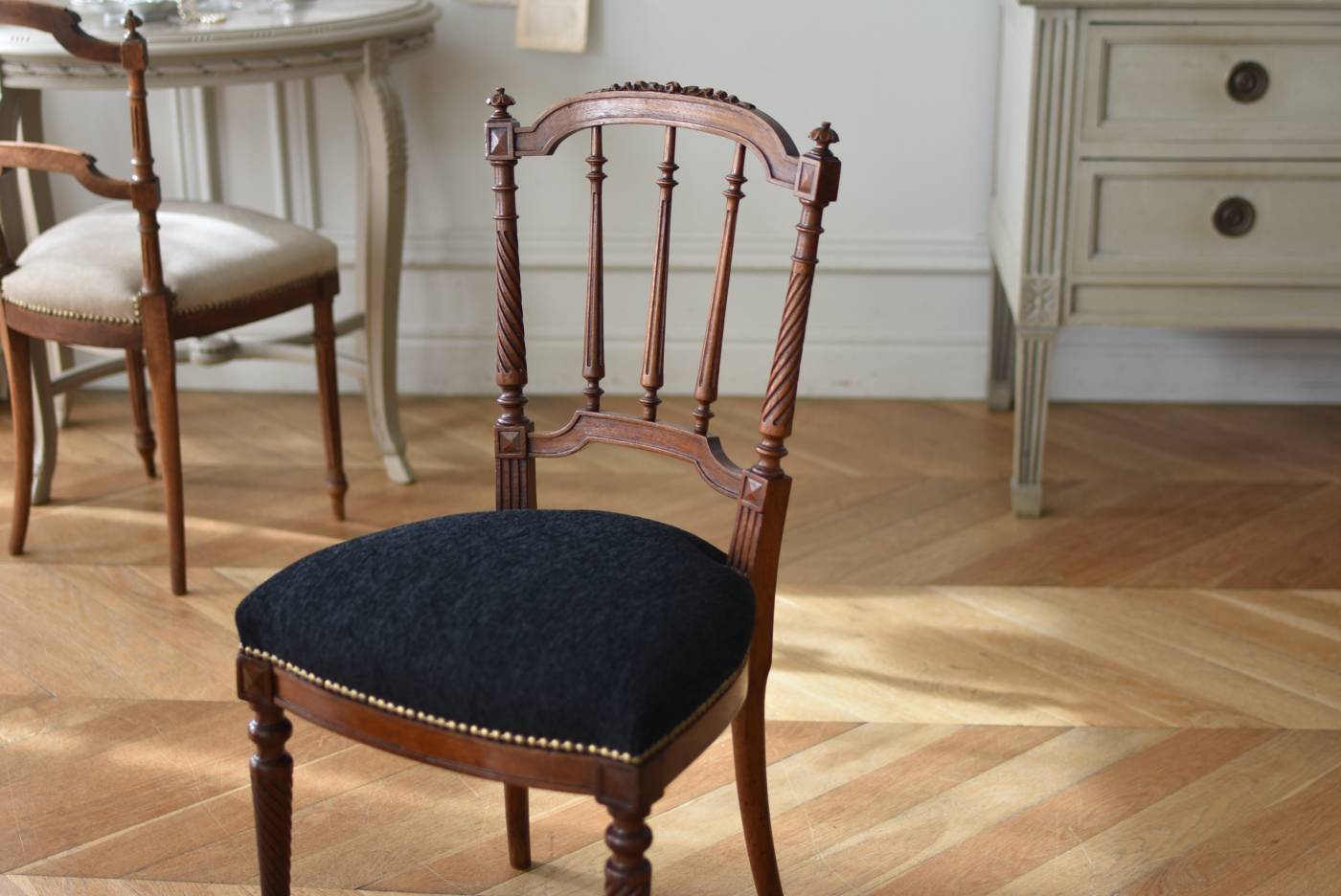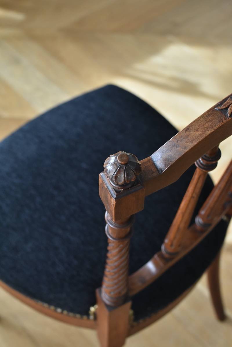 フランスのアンティークチェア。 こっくりとした深みのあるブラウンカラーのフレームにシックな色味のファブリックが組み合わせられたクラシカルな印象の佇まい。くるりと捻られたような溝模様やラインの美しい3本柱、さりげないリボンモチーフがあしらわれたルイ16世スタイルの格式高いデザインです。 フレームは一度バラして組み直しを行っています。座面のファブリックは新しく張り直し、中もウレタンに交換しているので程よい沈み込みのある座り心地に。 凛とした美しさはフランスらしい優雅さを演出し、威厳漂う空間作りに活躍してくれるアイテムです。 W 約42cm D 約44.5cm H 約85cm 座面までのH 約47.5cm