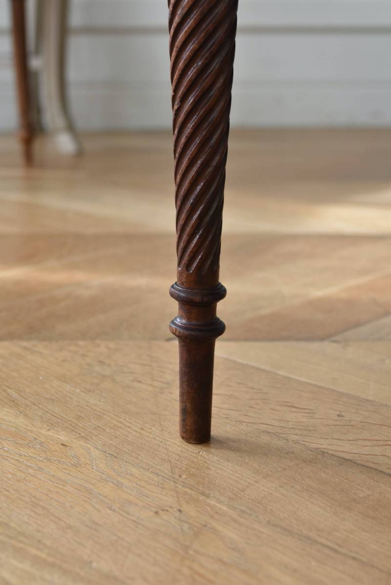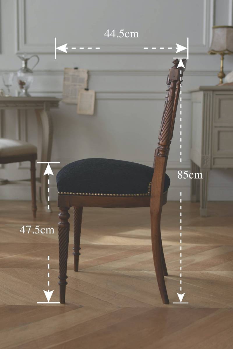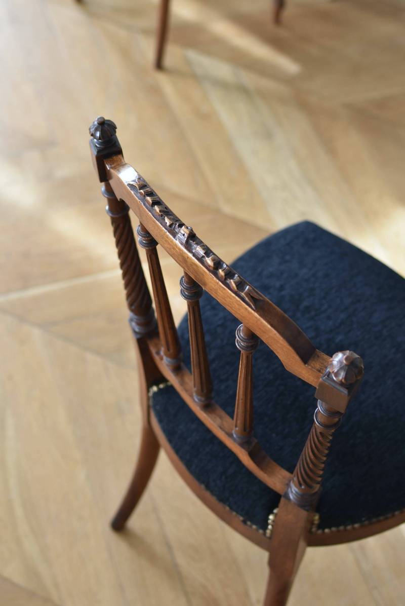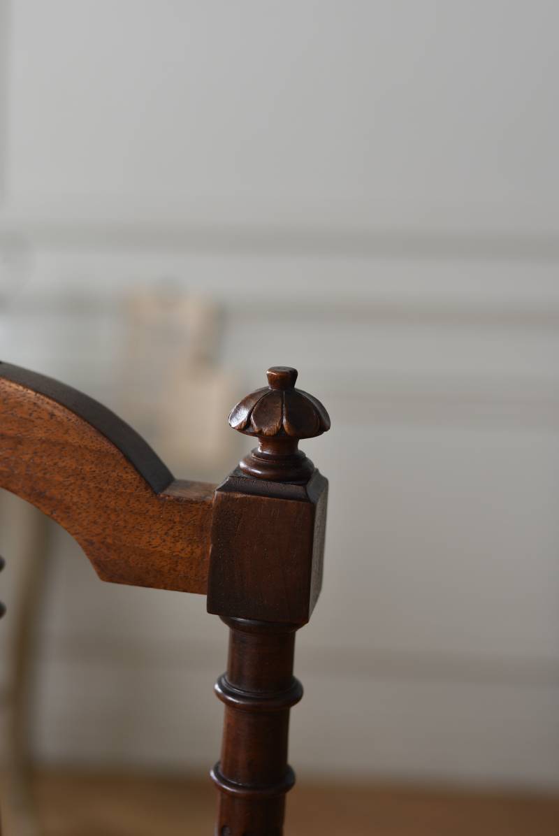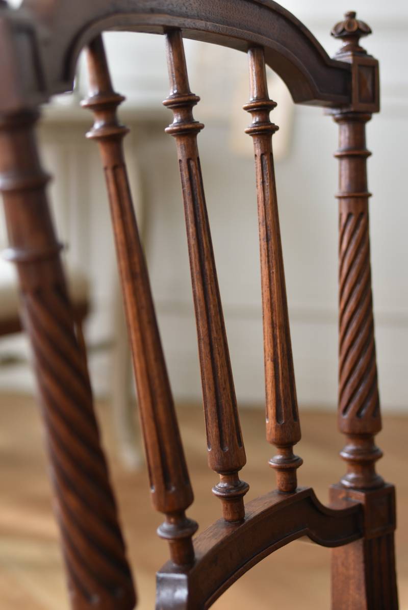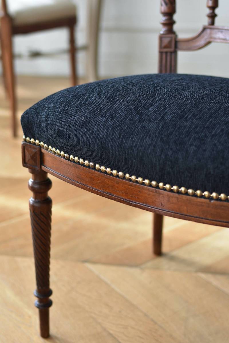 フランスのアンティークチェア。 こっくりとした深みのあるブラウンカラーのフレームにシックな色味のファブリックが組み合わせられたクラシカルな印象の佇まい。くるりと捻られたような溝模様やラインの美しい3本柱、さりげないリボンモチーフがあしらわれたルイ16世スタイルの格式高いデザインです。 フレームは一度バラして組み直しを行っています。座面のファブリックは新しく張り直し、中もウレタンに交換しているので程よい沈み込みのある座り心地に。 凛とした美しさはフランスらしい優雅さを演出し、威厳漂う空間作りに活躍してくれるアイテムです。 W 約42cm D 約44.5cm H 約85cm 座面までのH 約47.5cm