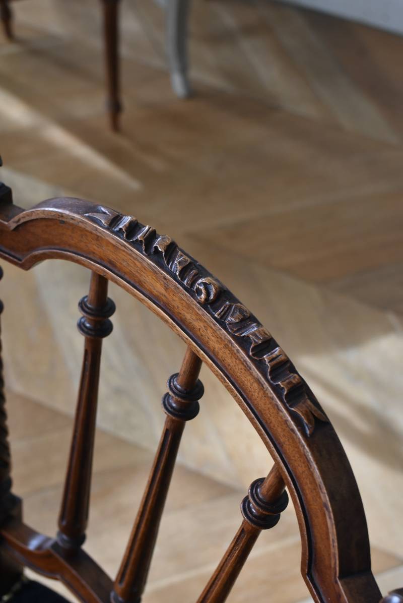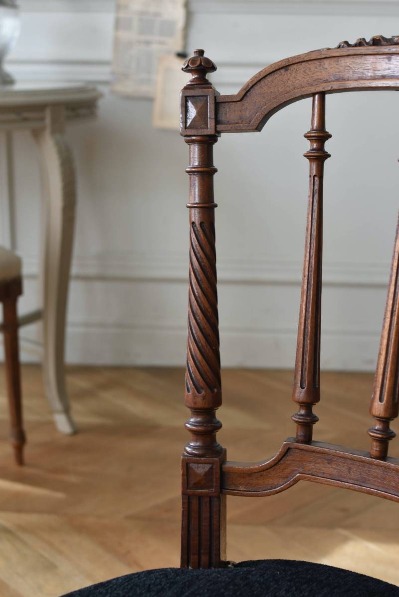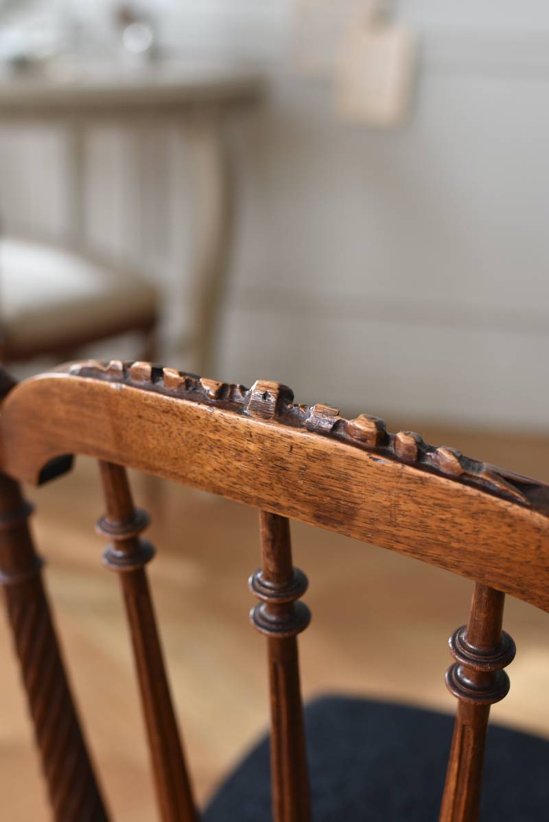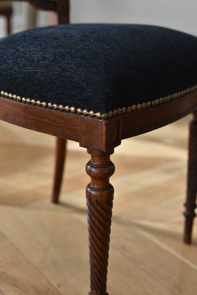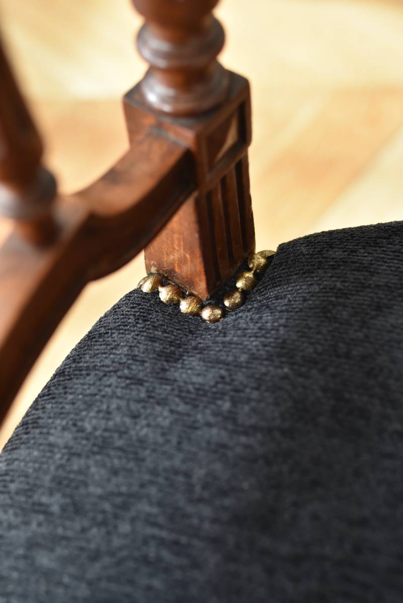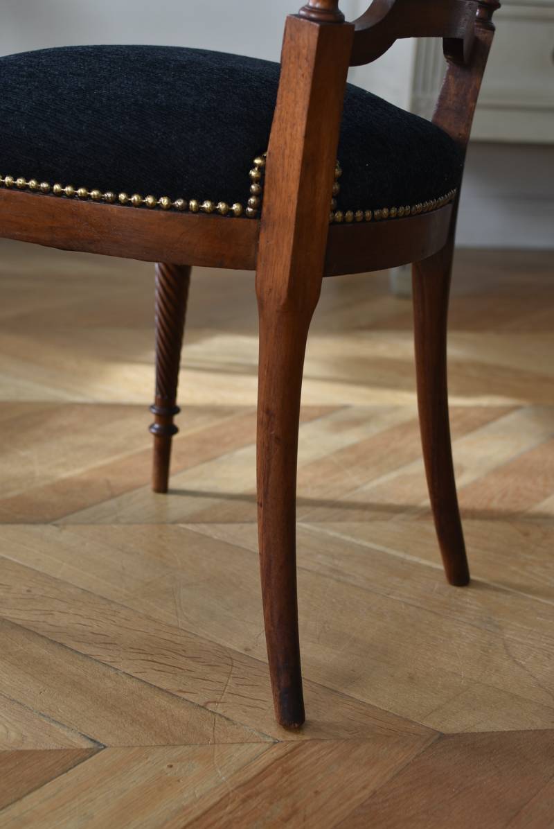 フランスのアンティークチェア。 こっくりとした深みのあるブラウンカラーのフレームにシックな色味のファブリックが組み合わせられたクラシカルな印象の佇まい。くるりと捻られたような溝模様やラインの美しい3本柱、さりげないリボンモチーフがあしらわれたルイ16世スタイルの格式高いデザインです。 フレームは一度バラして組み直しを行っています。座面のファブリックは新しく張り直し、中もウレタンに交換しているので程よい沈み込みのある座り心地に。 凛とした美しさはフランスらしい優雅さを演出し、威厳漂う空間作りに活躍してくれるアイテムです。 W 約42cm D 約44.5cm H 約85cm 座面までのH 約47.5cm