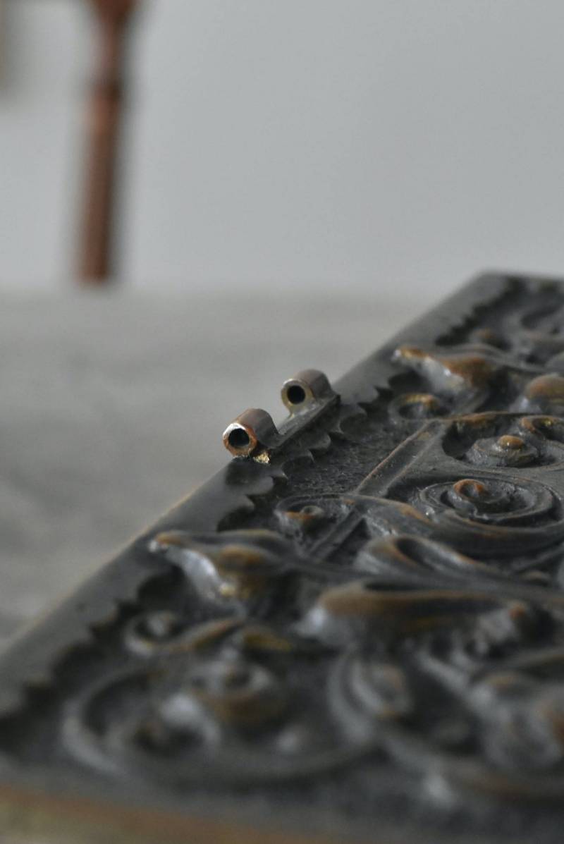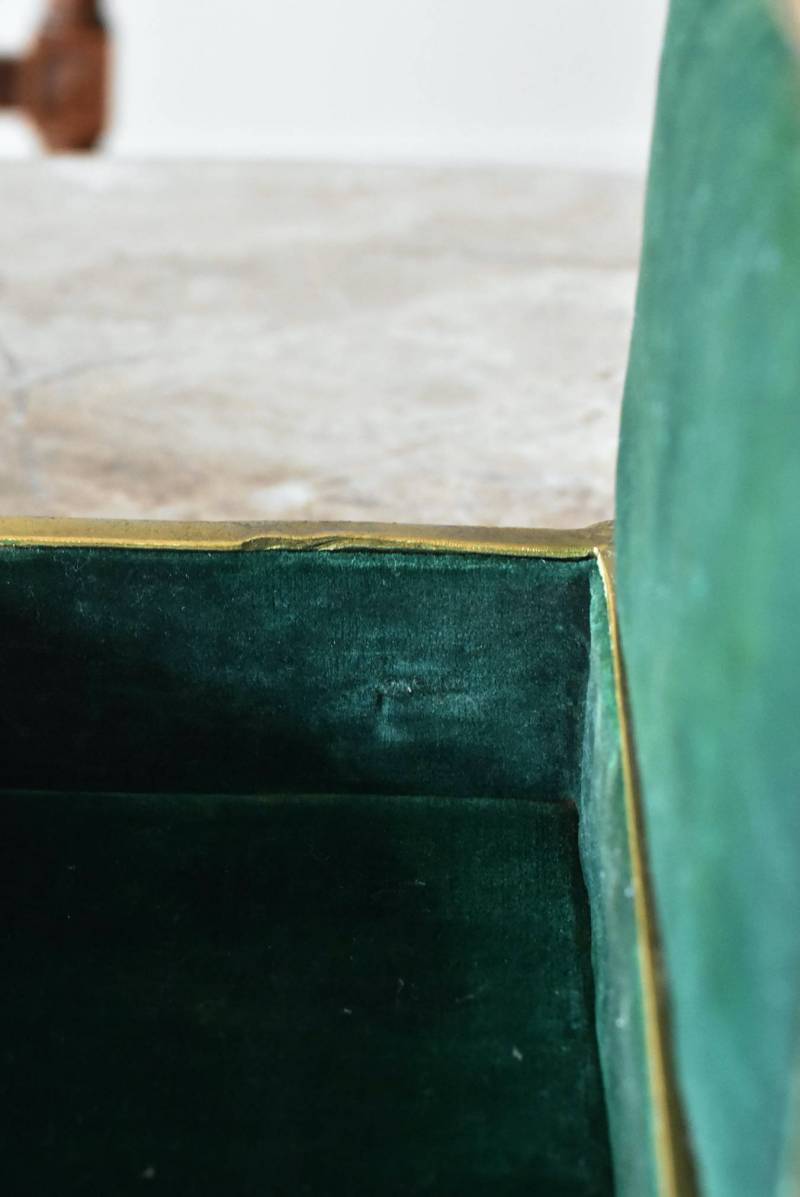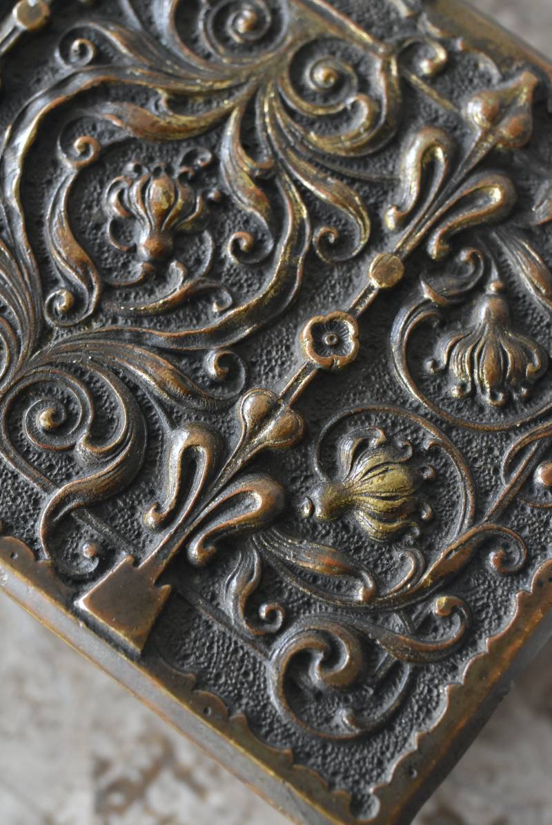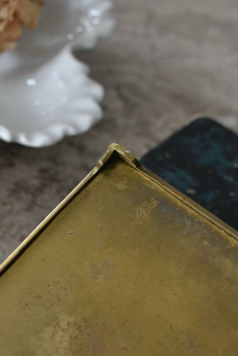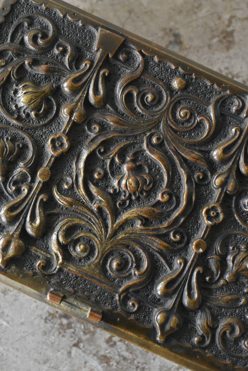 こちらはおそらくドイツのもので、経年変化によるくすみが深みを増す真鍮製のボディが魅力的。しなやかな曲線を描くお花モチーフの装飾がまるで絵画のようにあしらわれたデザインで、独自の存在感をたっぷりと漂わせてくれます。内側にはグリーンカラーのファブリックが張られ、落ち着いた印象と重厚さをより高めてくれる逸品に。