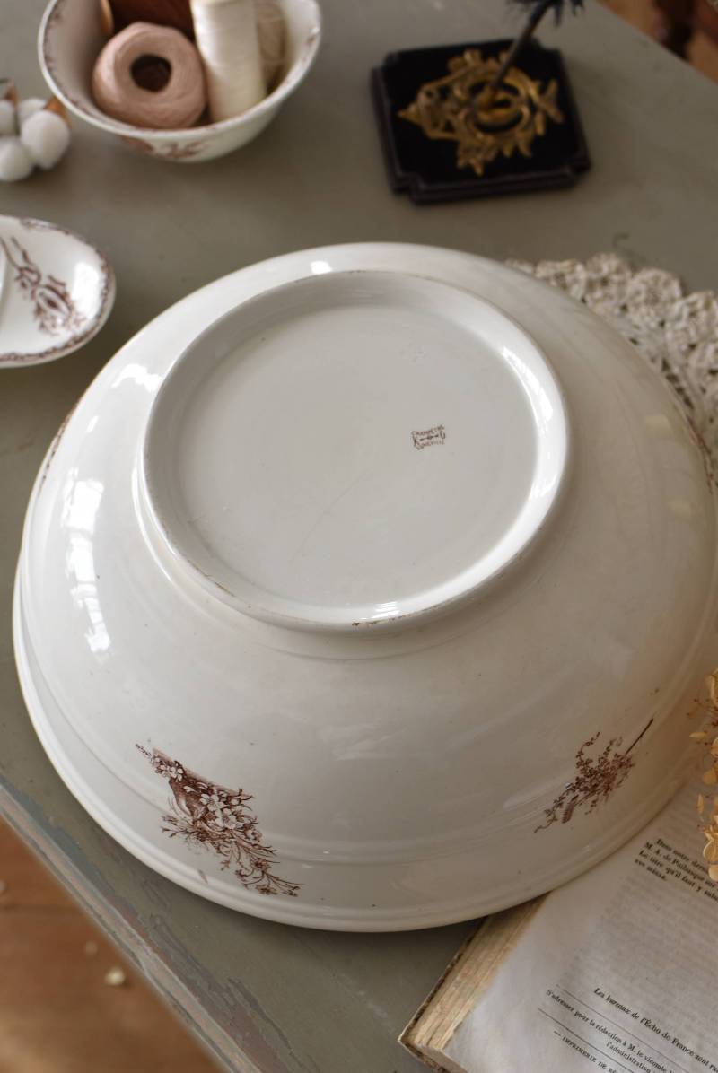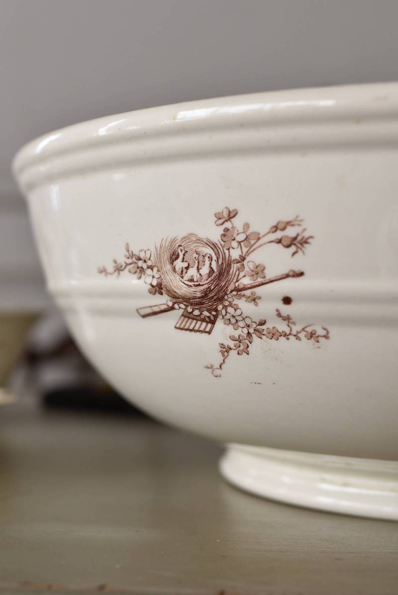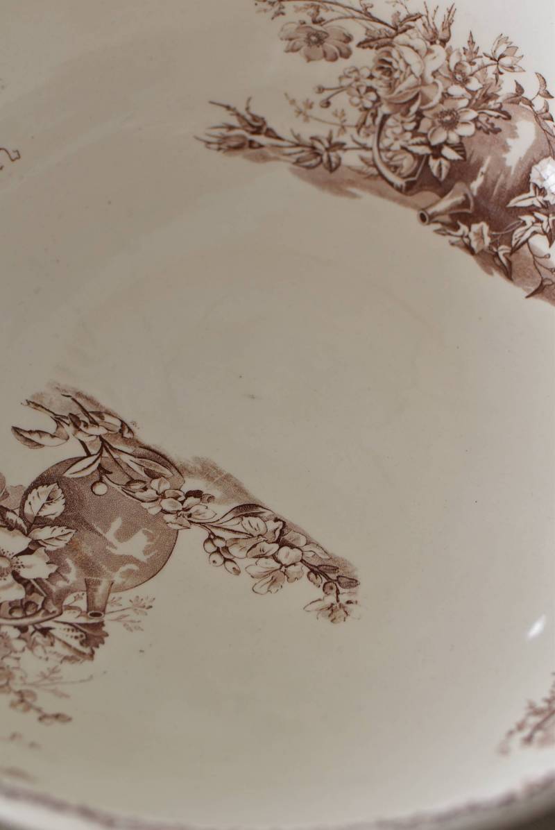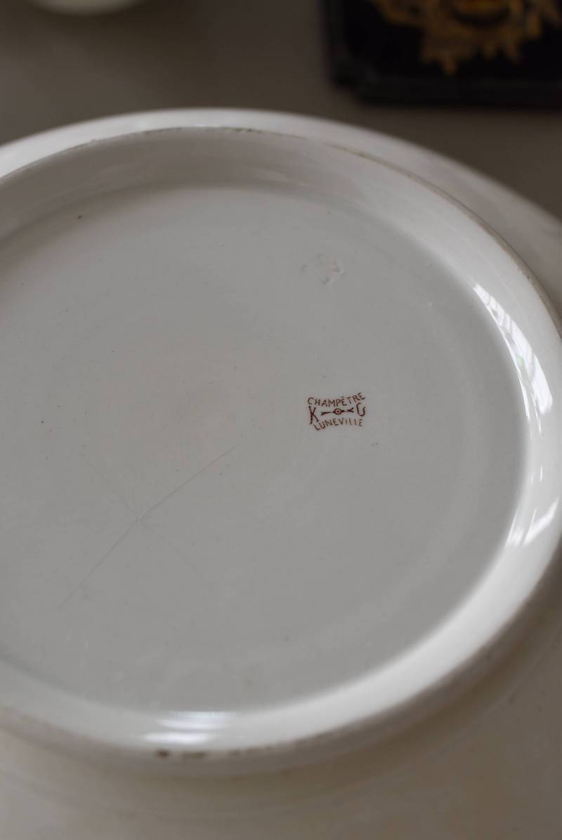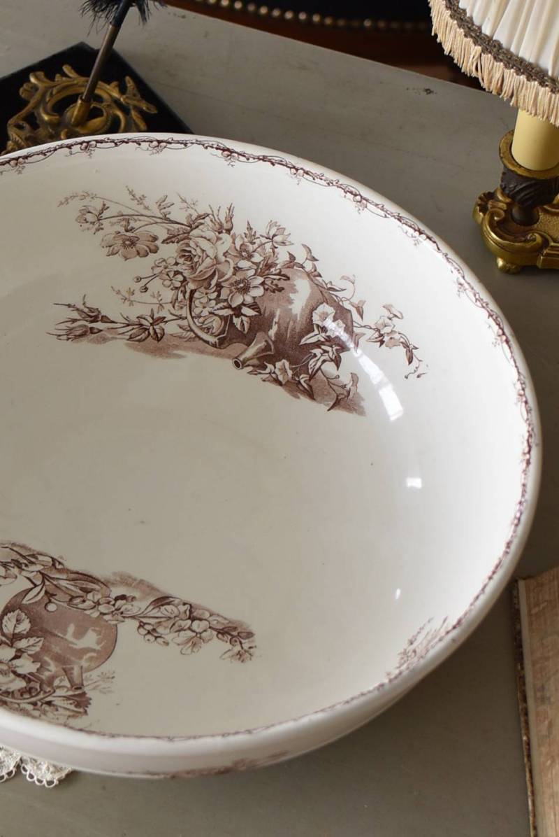 フランス・Luneville(リュネヴィル)のアンティークボウル。 洗面所などで使用されていた大きなサイズのもので、champetreシリーズとなったのどかな雰囲気のあるデザインです。丸みのある器の外側にはバランス良く小鳥や小花、農具などが、内側には楽器などの様々な模様が大きくあしらわれ、フランスの田舎風景を連想させるような豊かさが楽しめます。 古いものですのでシミや傷、擦れなどが見受けられますが、大きなカケなどはありません。内外面どちらも抜け目のない姿はインテリアとしても存在感があり、お花をアレンジしたりするのもおすすめです。同じシリーズのブラシトレイとカップがあります。 直径 約34.5cm H 約12cm
