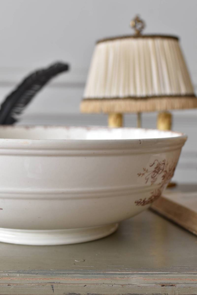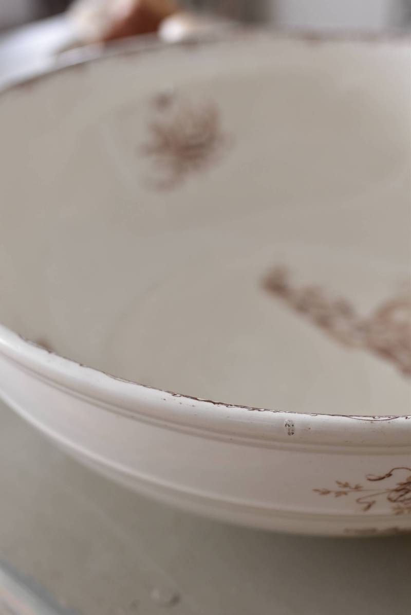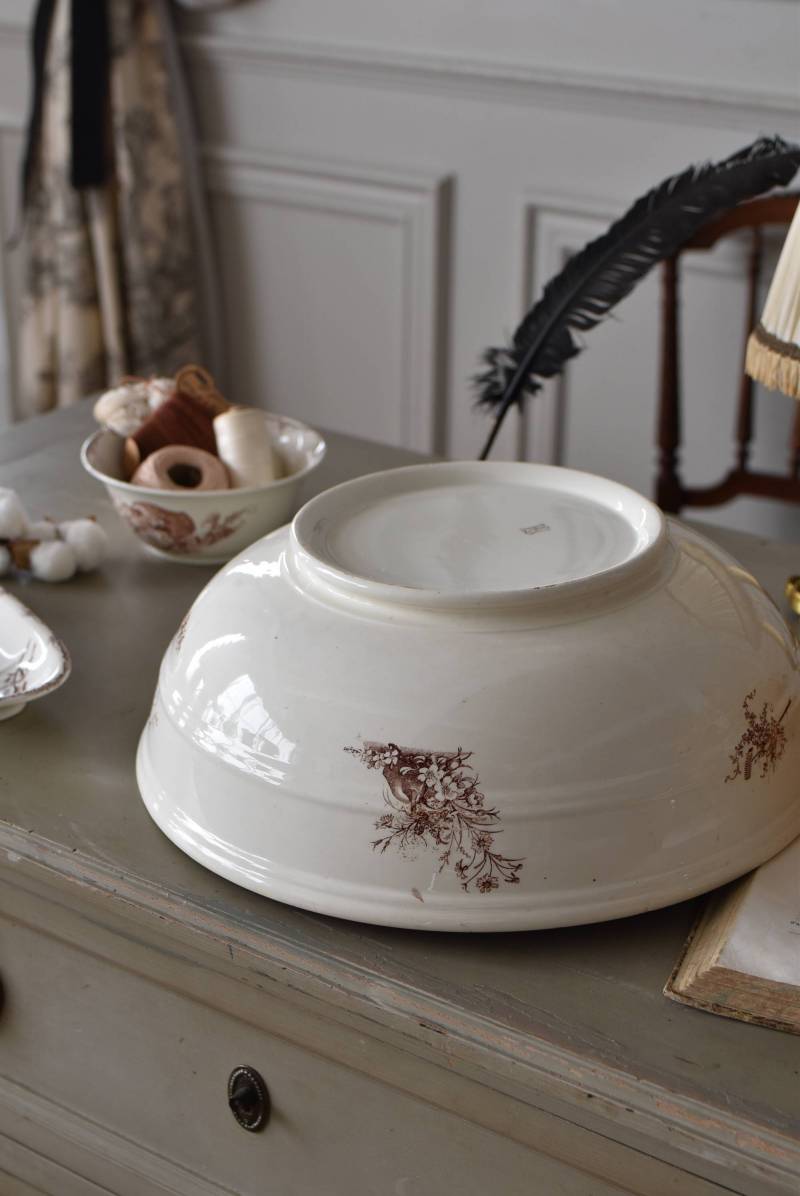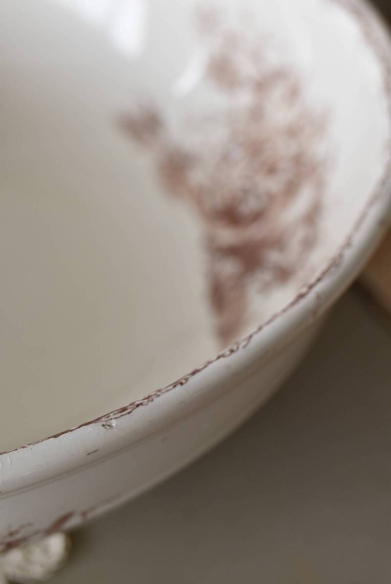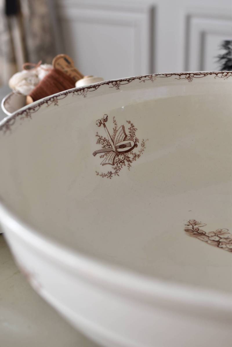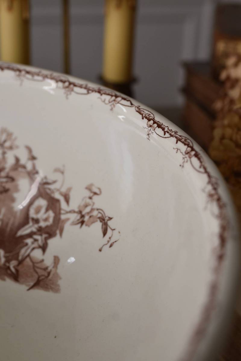 フランス・Luneville(リュネヴィル)のアンティークボウル。 洗面所などで使用されていた大きなサイズのもので、champetreシリーズとなったのどかな雰囲気のあるデザインです。丸みのある器の外側にはバランス良く小鳥や小花、農具などが、内側には楽器などの様々な模様が大きくあしらわれ、フランスの田舎風景を連想させるような豊かさが楽しめます。 古いものですのでシミや傷、擦れなどが見受けられますが、大きなカケなどはありません。内外面どちらも抜け目のない姿はインテリアとしても存在感があり、お花をアレンジしたりするのもおすすめです。同じシリーズのブラシトレイとカップがあります。 直径 約34.5cm H 約12cm