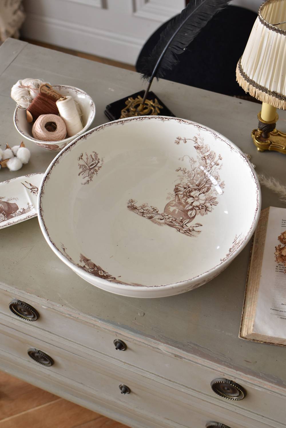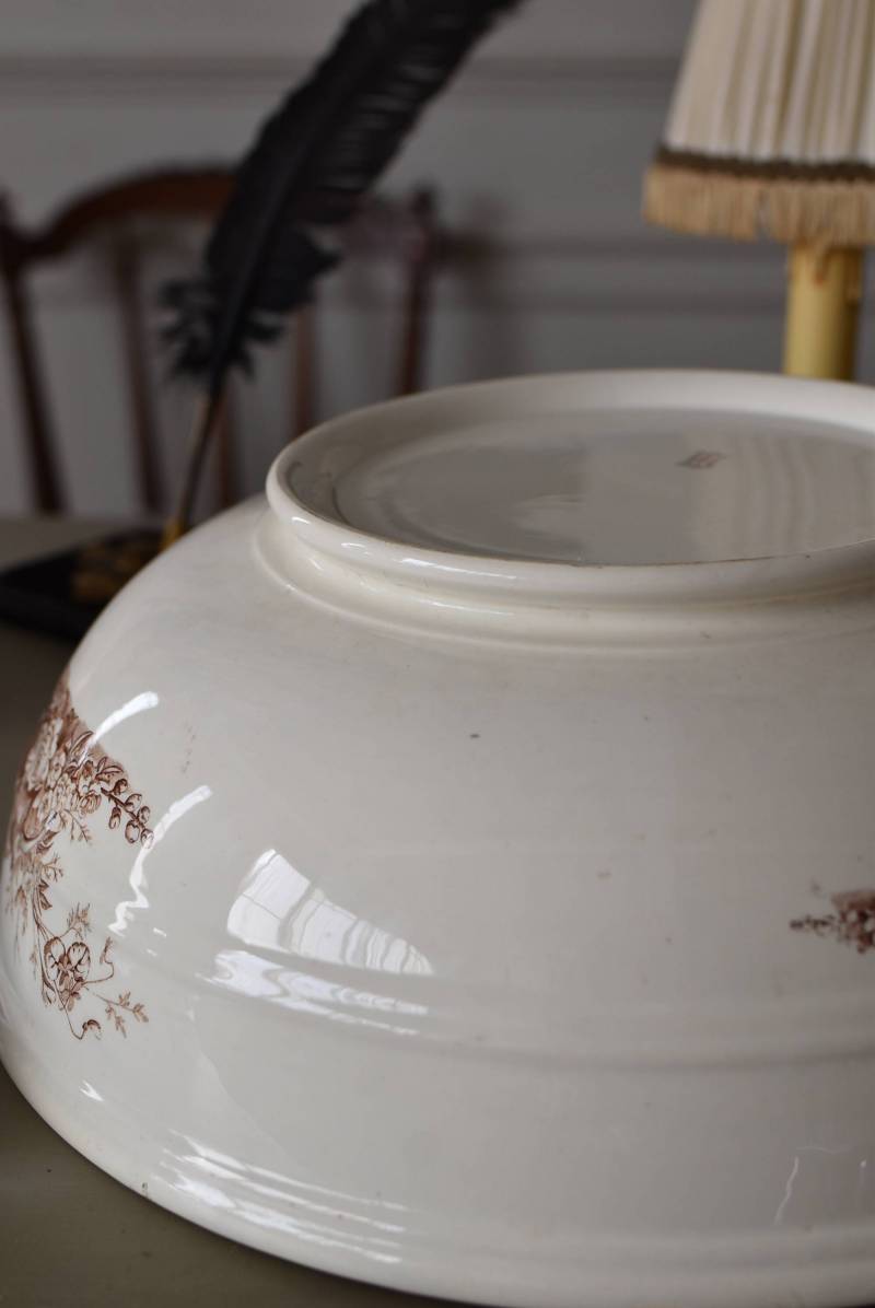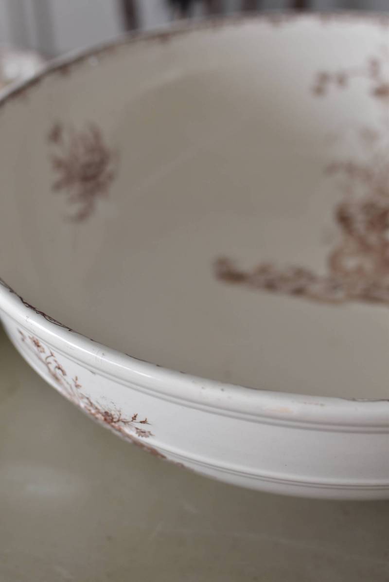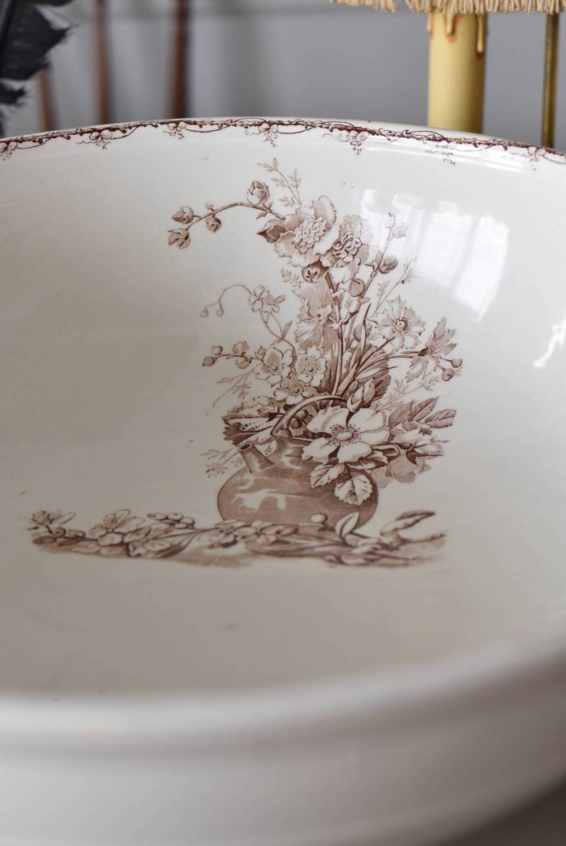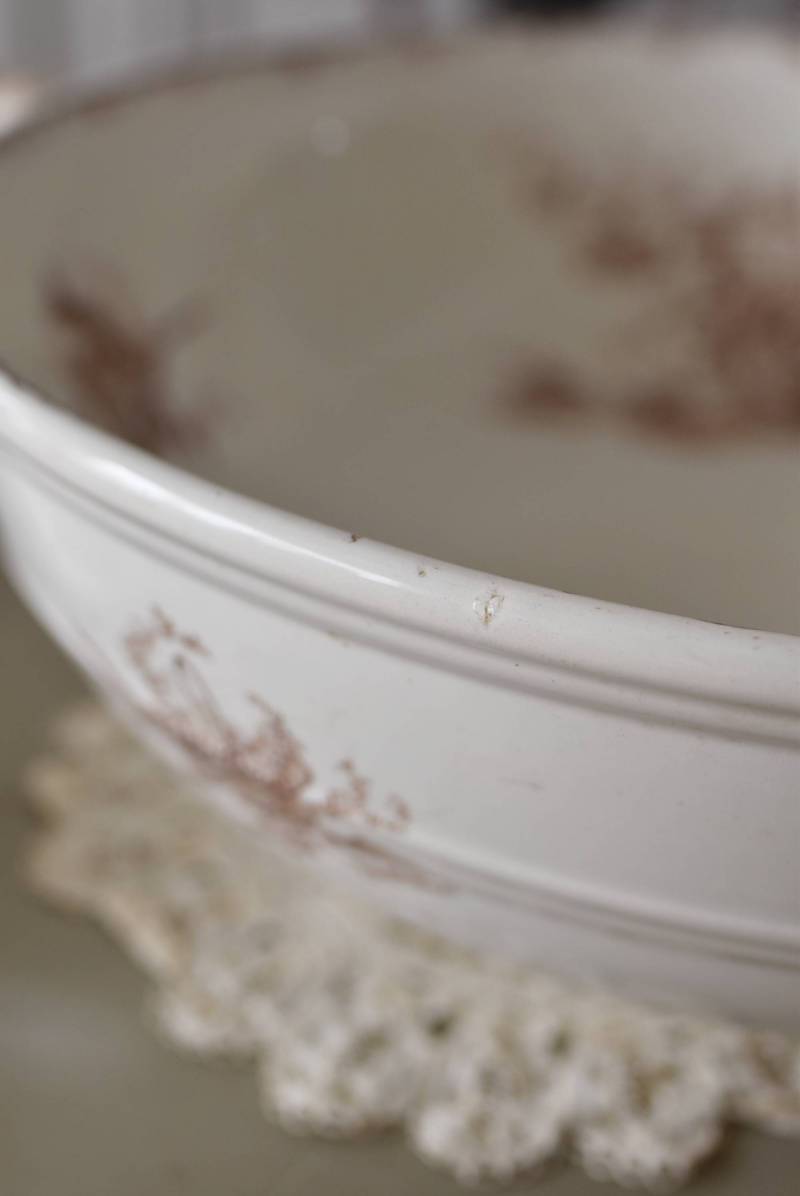 フランス・Luneville(リュネヴィル)のアンティークボウル。 洗面所などで使用されていた大きなサイズのもので、champetreシリーズとなったのどかな雰囲気のあるデザインです。丸みのある器の外側にはバランス良く小鳥や小花、農具などが、内側には楽器などの様々な模様が大きくあしらわれ、フランスの田舎風景を連想させるような豊かさが楽しめます。 古いものですのでシミや傷、擦れなどが見受けられますが、大きなカケなどはありません。内外面どちらも抜け目のない姿はインテリアとしても存在感があり、お花をアレンジしたりするのもおすすめです。同じシリーズのブラシトレイとカップがあります。 直径 約34.5cm H 約12cm