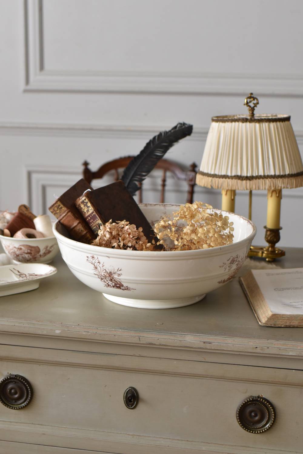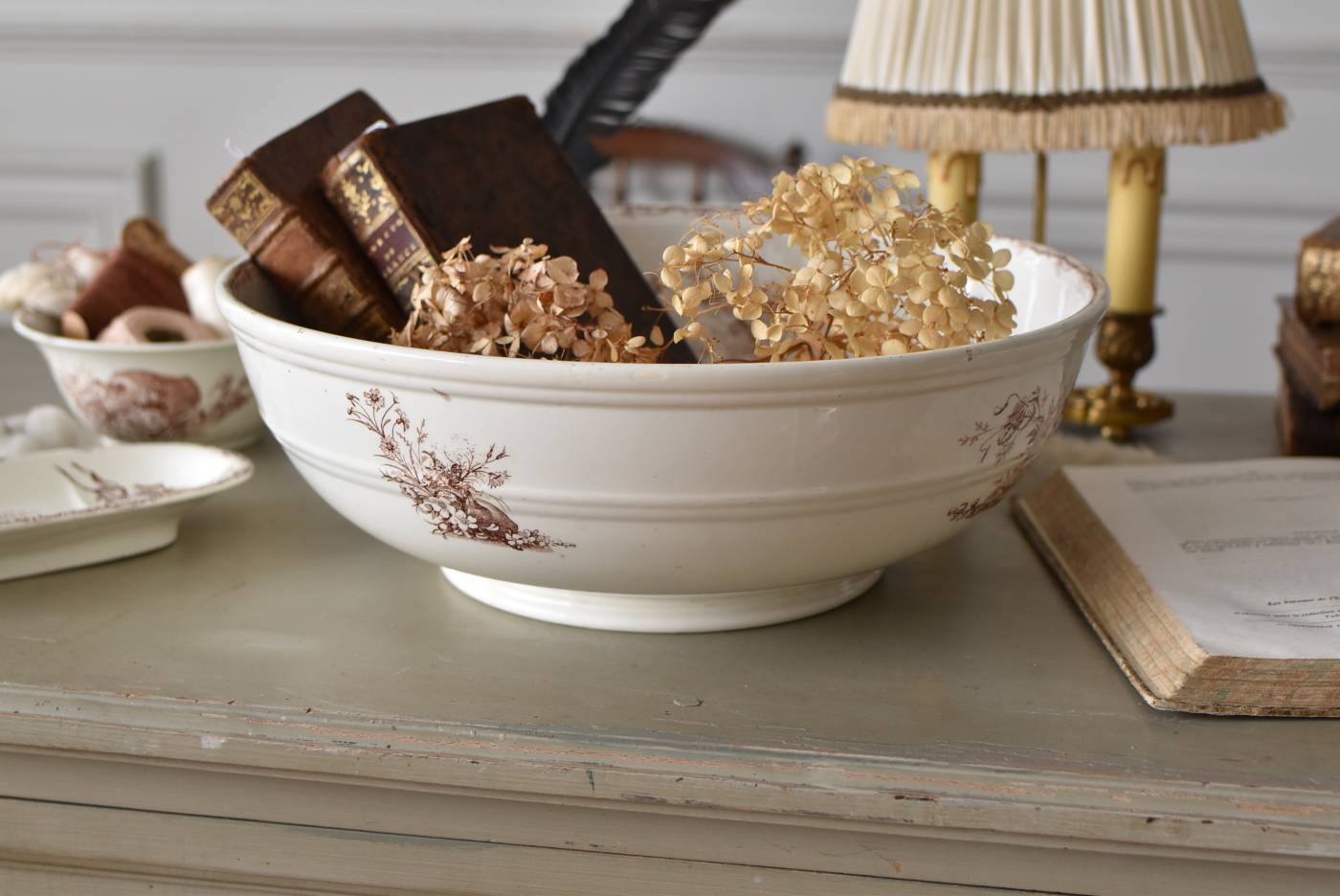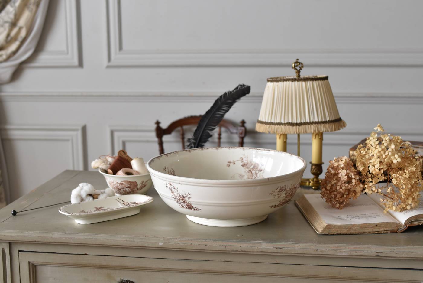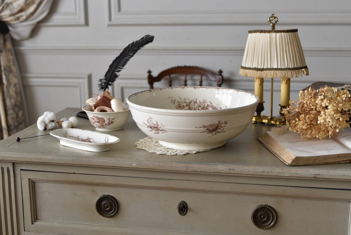 フランス・Luneville(リュネヴィル)のアンティークボウル。 洗面所などで使用されていた大きなサイズのもので、champetreシリーズとなったのどかな雰囲気のあるデザインです。丸みのある器の外側にはバランス良く小鳥や小花、農具などが、内側には楽器などの様々な模様が大きくあしらわれ、フランスの田舎風景を連想させるような豊かさが楽しめます。 古いものですのでシミや傷、擦れなどが見受けられますが、大きなカケなどはありません。内外面どちらも抜け目のない姿はインテリアとしても存在感があり、お花をアレンジしたりするのもおすすめです。同じシリーズのブラシトレイとカップがあります。 直径 約34.5cm H 約12cm