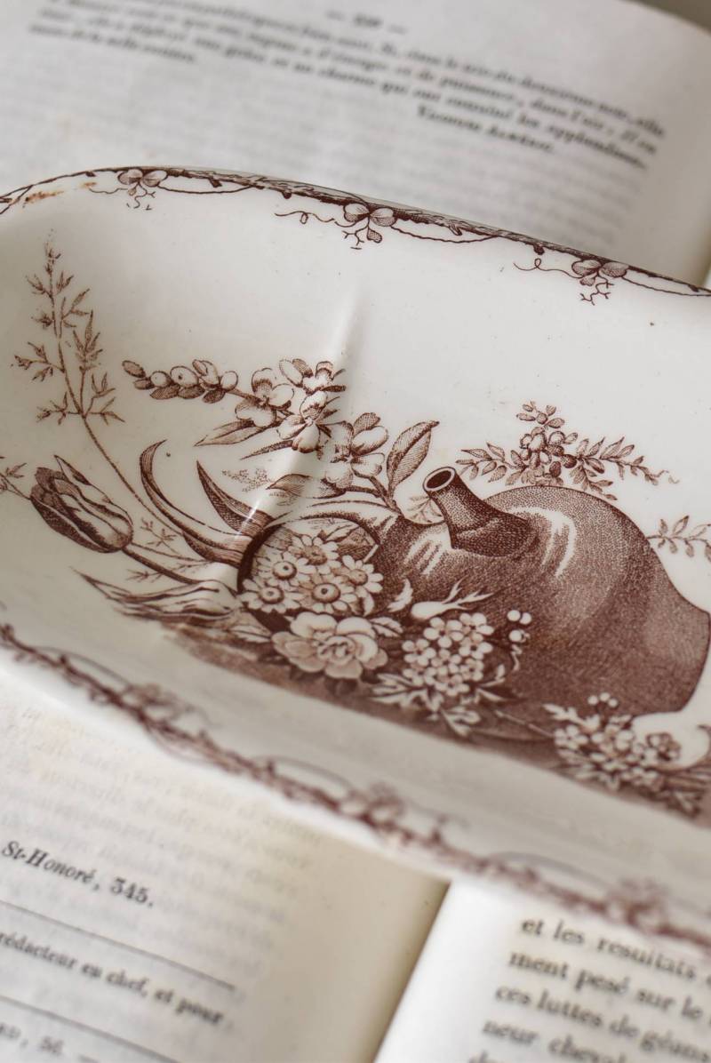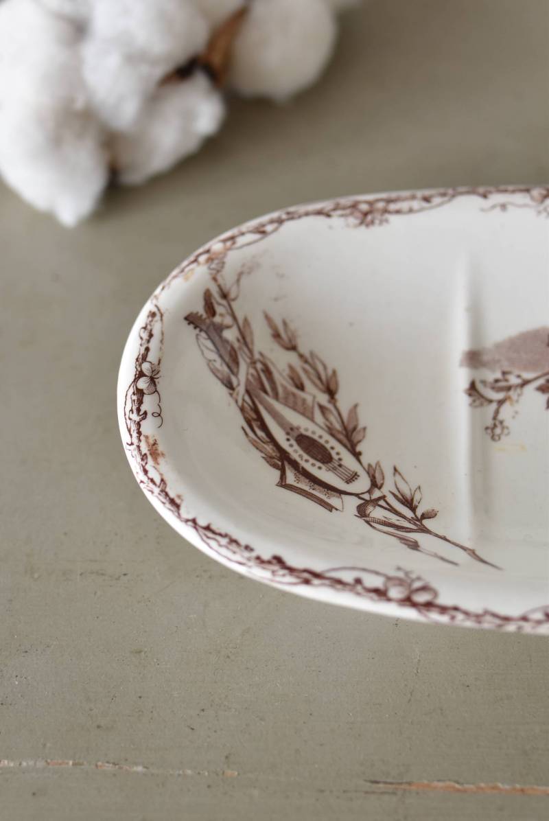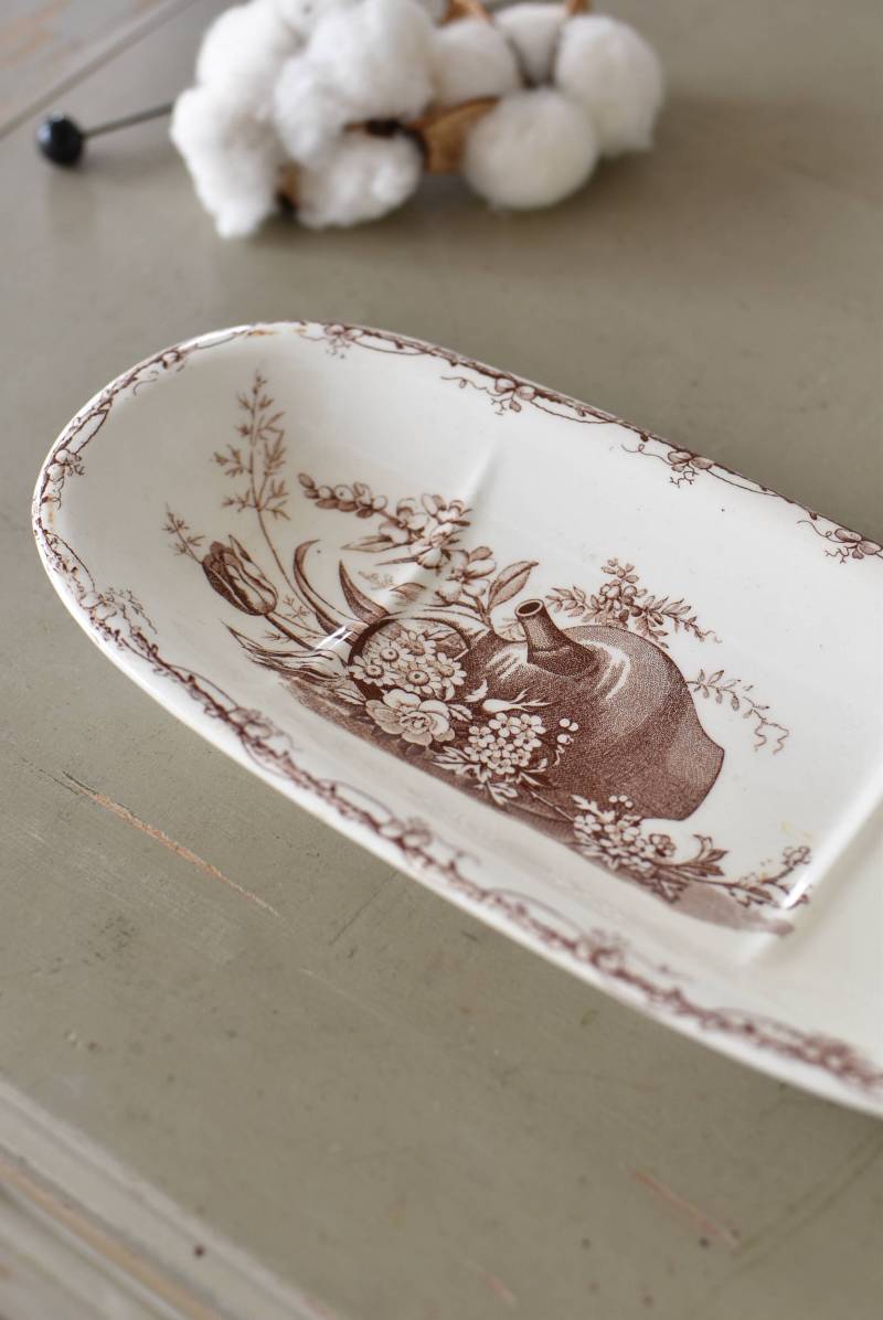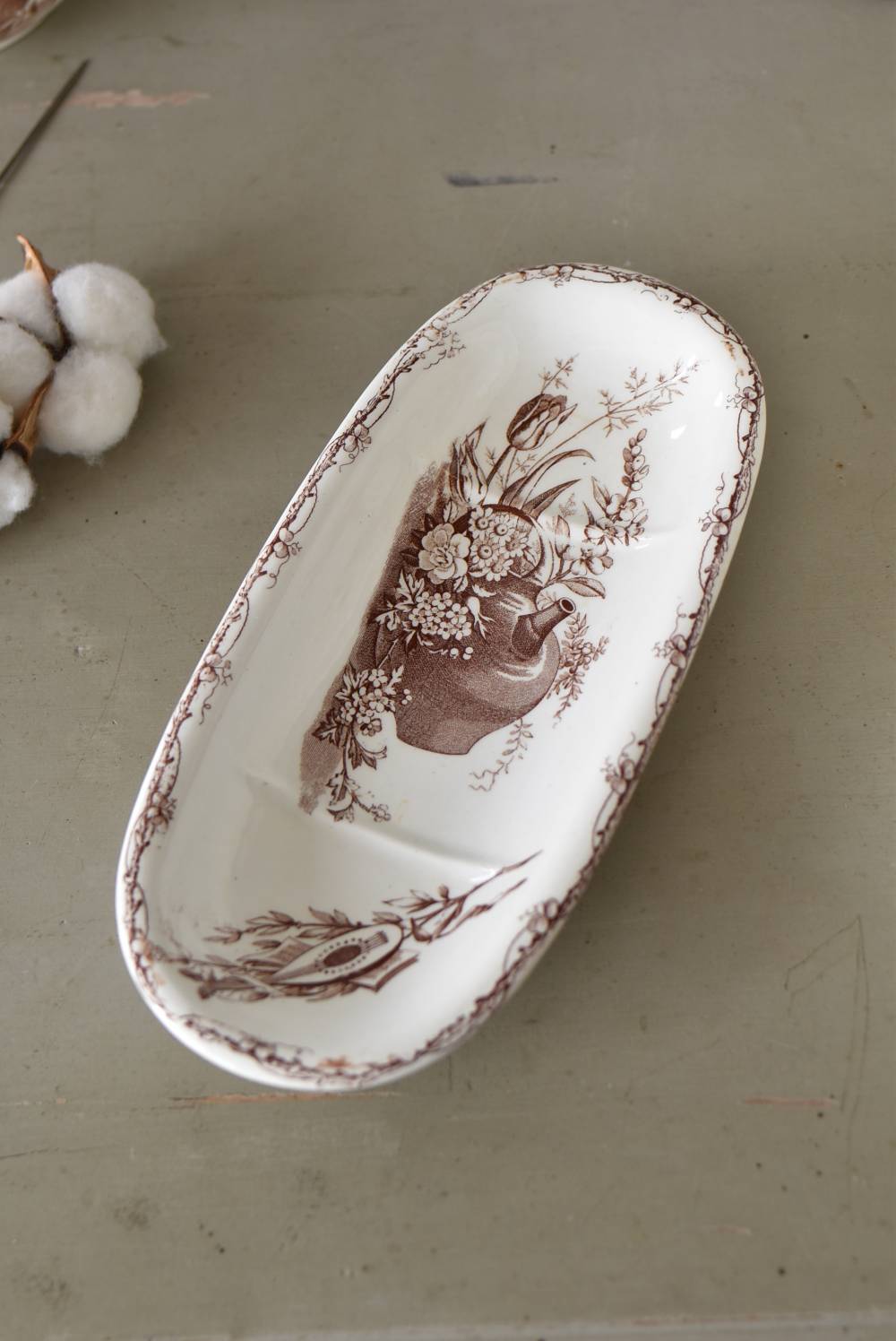 フランス・Luneville(リュネヴィル)のブラシトレイ。 champetreシリーズのものとなり、ボトルやリュート、自然豊かな草花モチーフが施された親しみやすい雰囲気を纏っています。大きく施されたインパクトのある模様によって置いているだけでも優雅さをもたらしてくれ、縁周りにも繊細さを感じるような姿に落ち着いた色合いとなったシックな佇まいです。 同じシリーズのボウルとカップがあり、揃えて使用するのもおすすめです。 W 約22cm D 約10cm H 約3cm