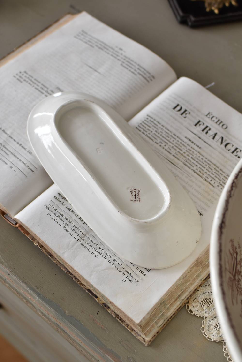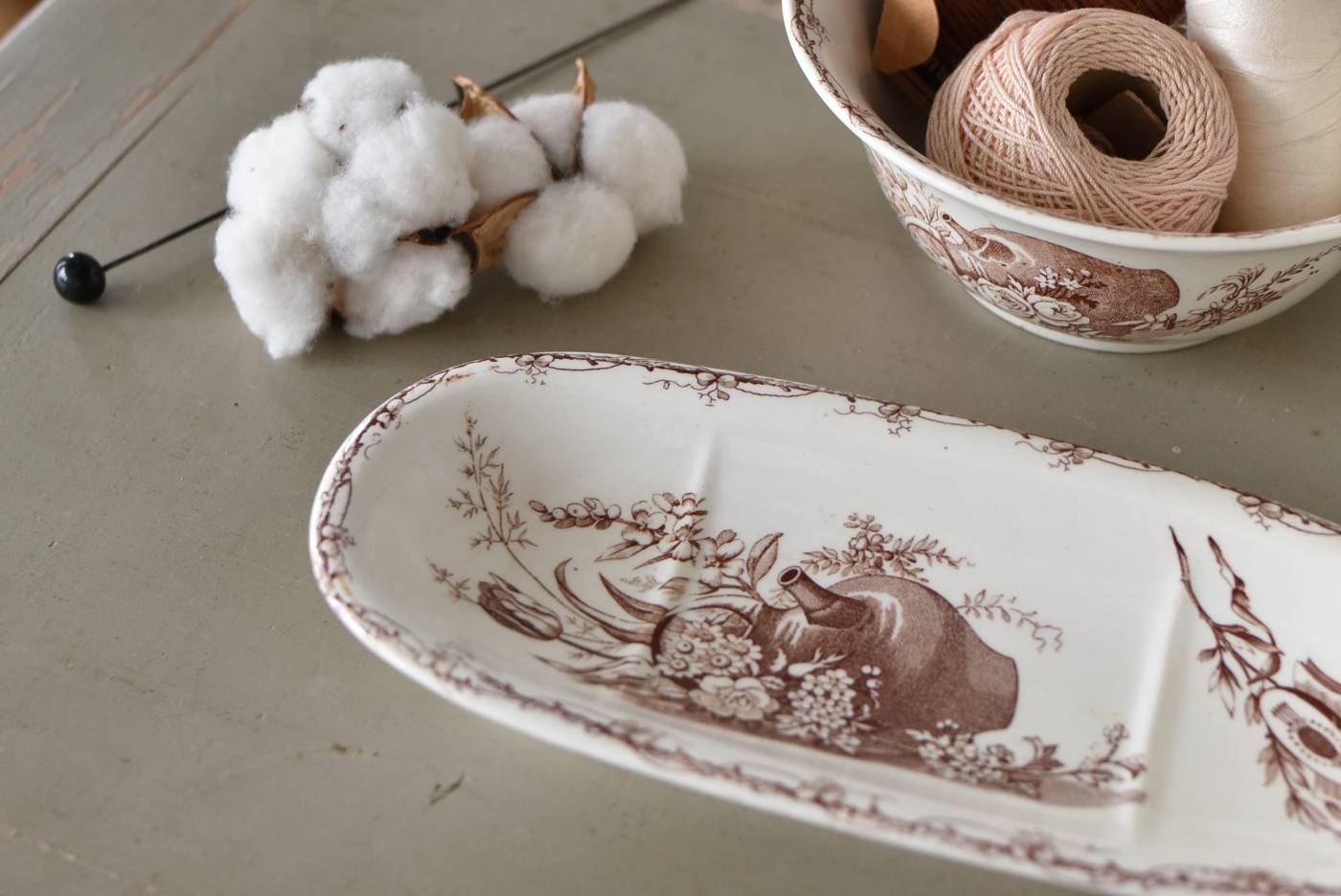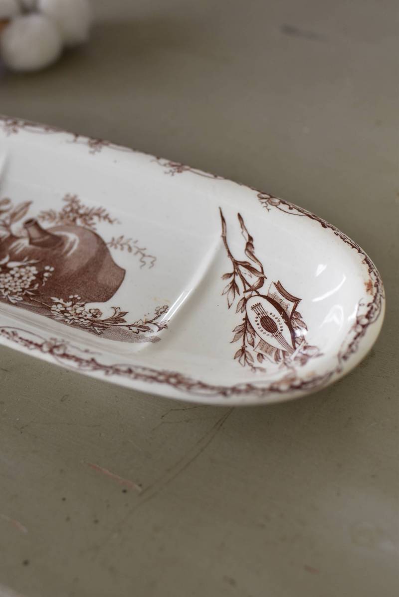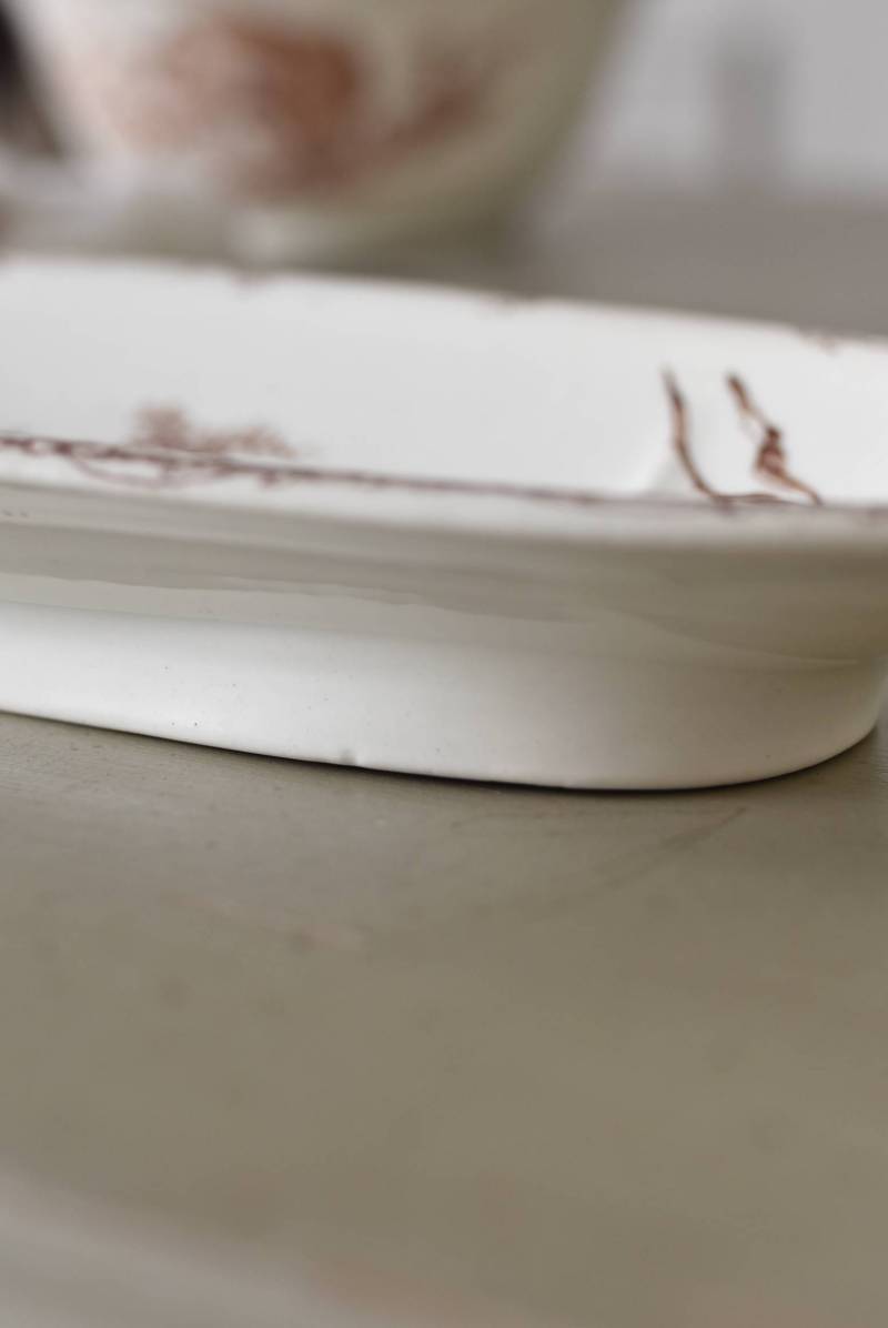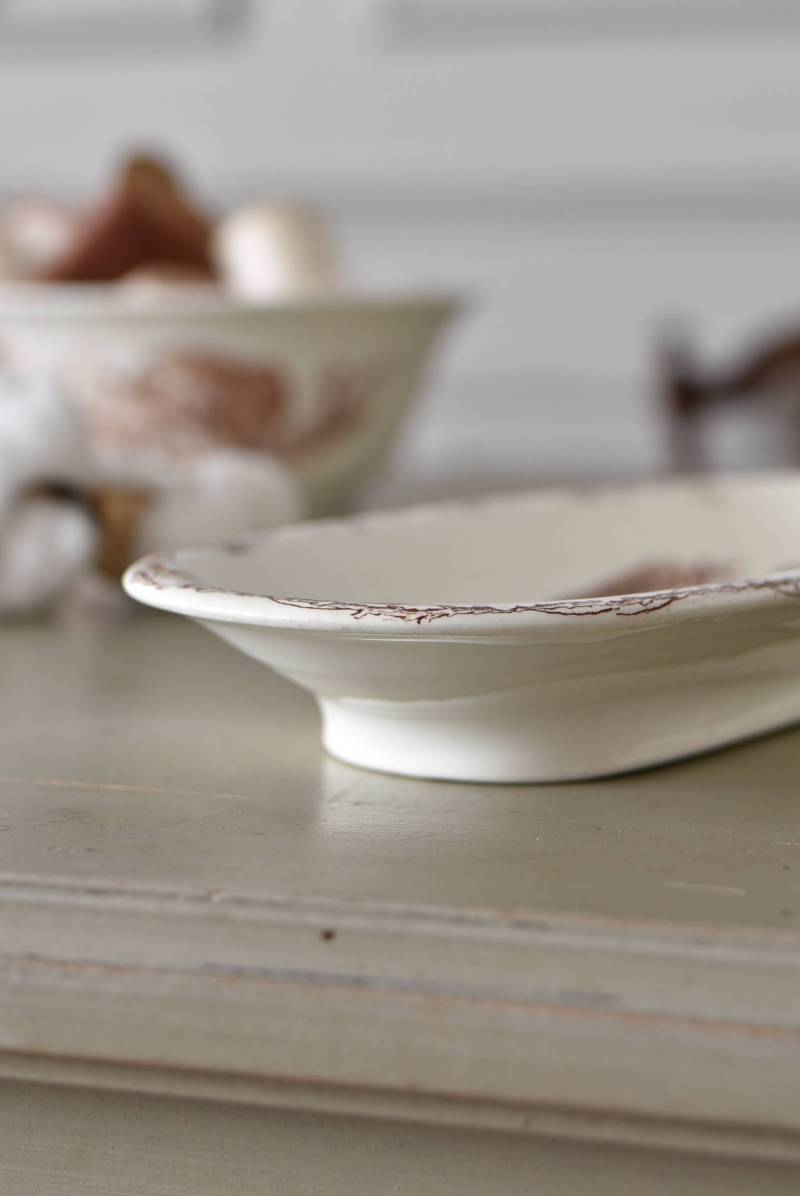 フランス・Luneville(リュネヴィル)のブラシトレイ。 champetreシリーズのものとなり、ボトルやリュート、自然豊かな草花モチーフが施された親しみやすい雰囲気を纏っています。大きく施されたインパクトのある模様によって置いているだけでも優雅さをもたらしてくれ、縁周りにも繊細さを感じるような姿に落ち着いた色合いとなったシックな佇まいです。 同じシリーズのボウルとカップがあり、揃えて使用するのもおすすめです。 W 約22cm D 約10cm H 約3cm