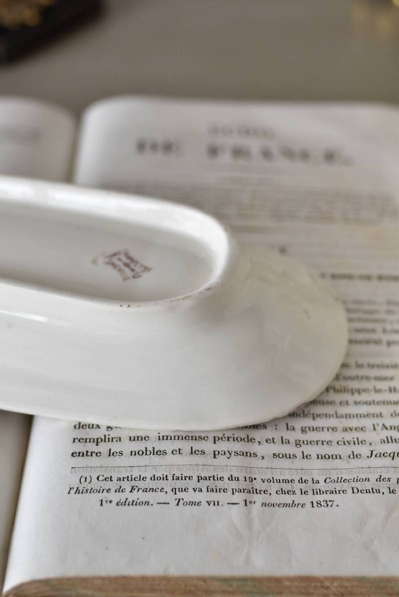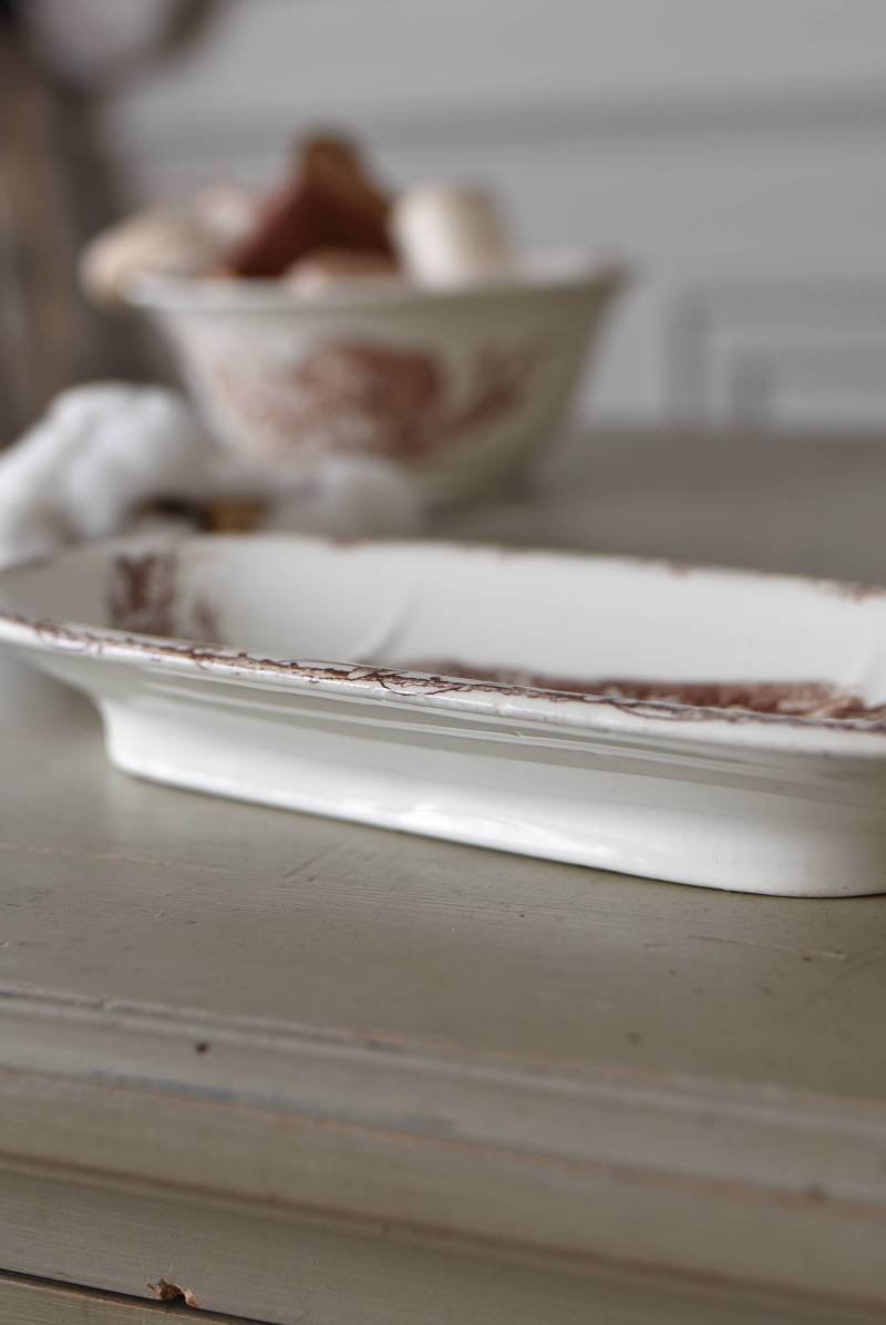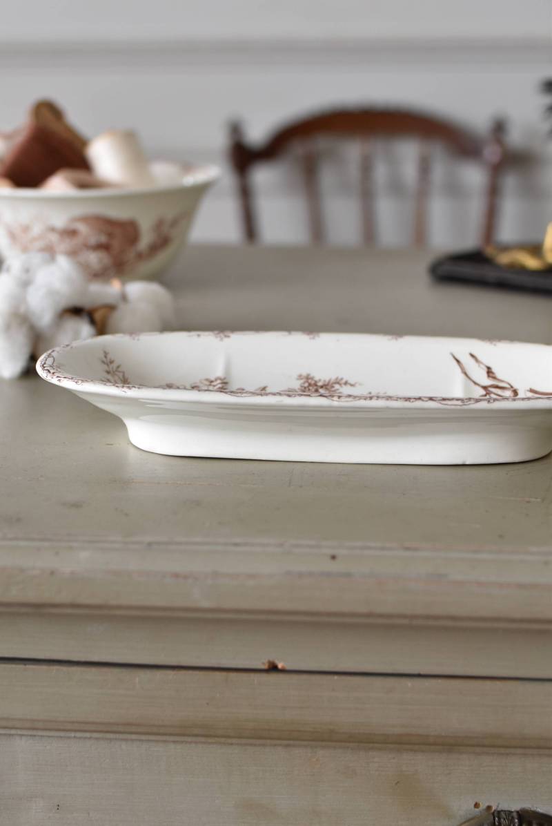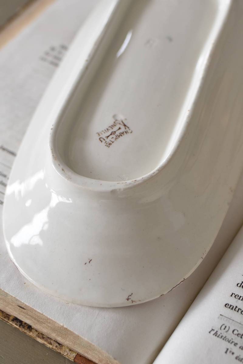 フランス・Luneville(リュネヴィル)のブラシトレイ。 champetreシリーズのものとなり、ボトルやリュート、自然豊かな草花モチーフが施された親しみやすい雰囲気を纏っています。大きく施されたインパクトのある模様によって置いているだけでも優雅さをもたらしてくれ、縁周りにも繊細さを感じるような姿に落ち着いた色合いとなったシックな佇まいです。 同じシリーズのボウルとカップがあり、揃えて使用するのもおすすめです。 W 約22cm D 約10cm H 約3cm