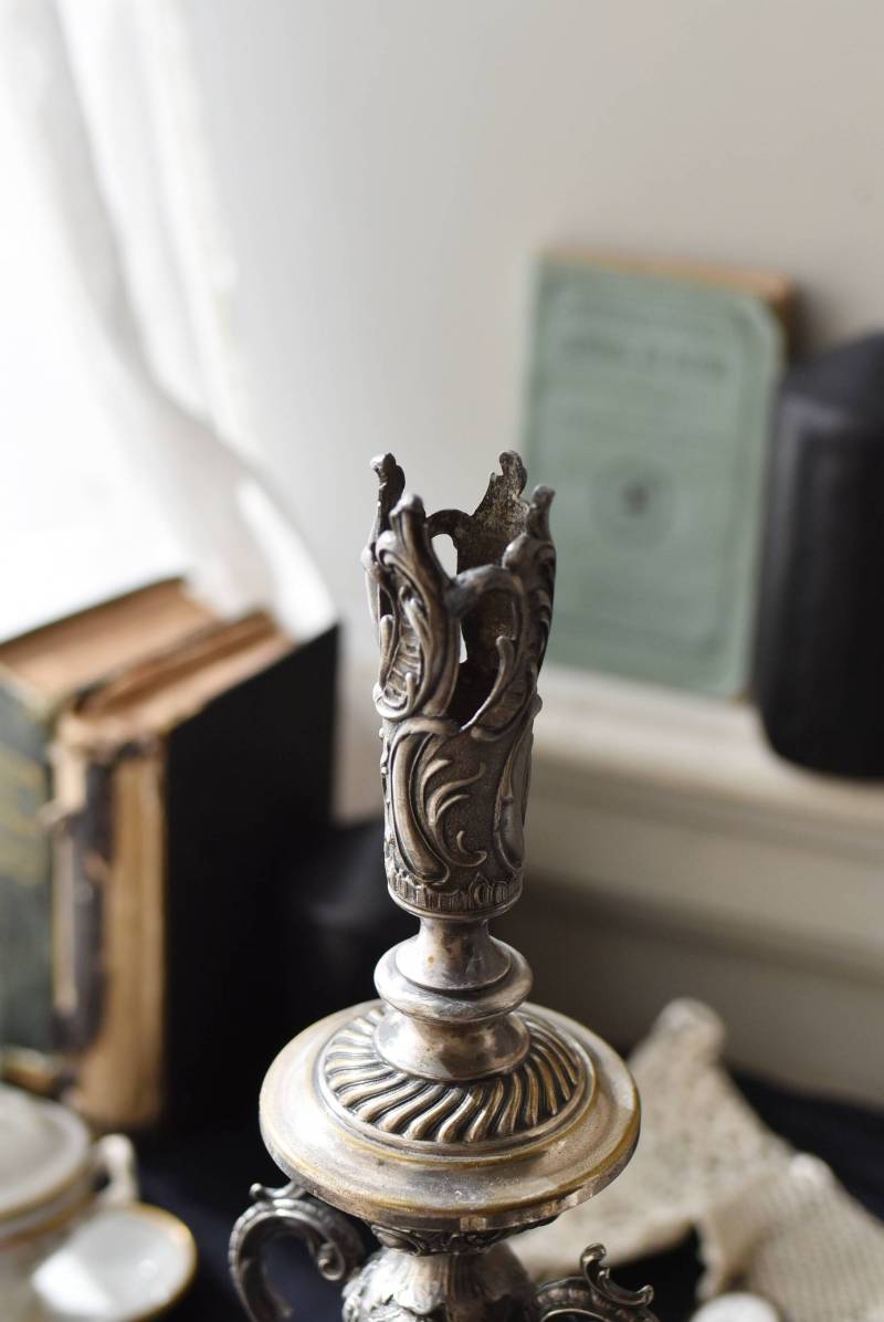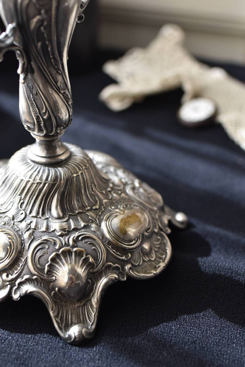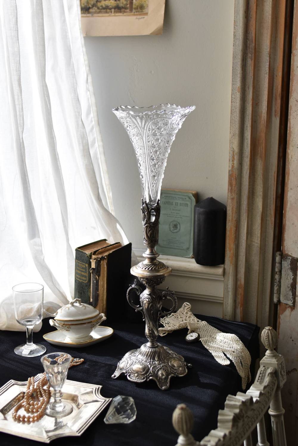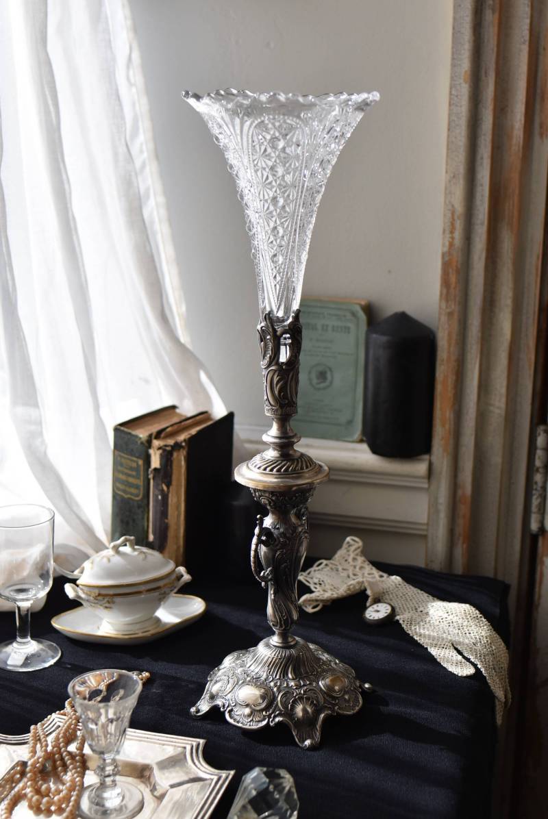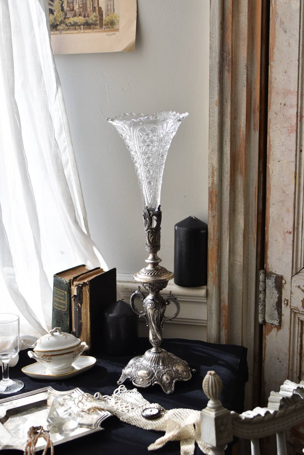 イパーン(epergne)と呼ばれるもので、卓上の雰囲気を高めてくれるフランスのフラワーベース。 縦に伸びた土台中央の両側には繊細な取っ手が施されており、ロカイユモチーフの繊細さや流れるようなレリーフで包まれた圧巻の佇まいです。上部に向かって広がりのあるラッパ型になったガラスパーツにも施されたカットデザインは光の反射によって引き立ち、フリルのような縁周りからも凛とした美しさが漂います。 ガラス部分は取り外す事ができるようになっているので、お手入れ時もスムーズです。オブジェのような背の高い姿は見惚れてしまう程で、異素材が組み合わさったシックなディスプレイを演出してくれます。 直径 約13cm H 約45cm 土台 約12×12.5cm