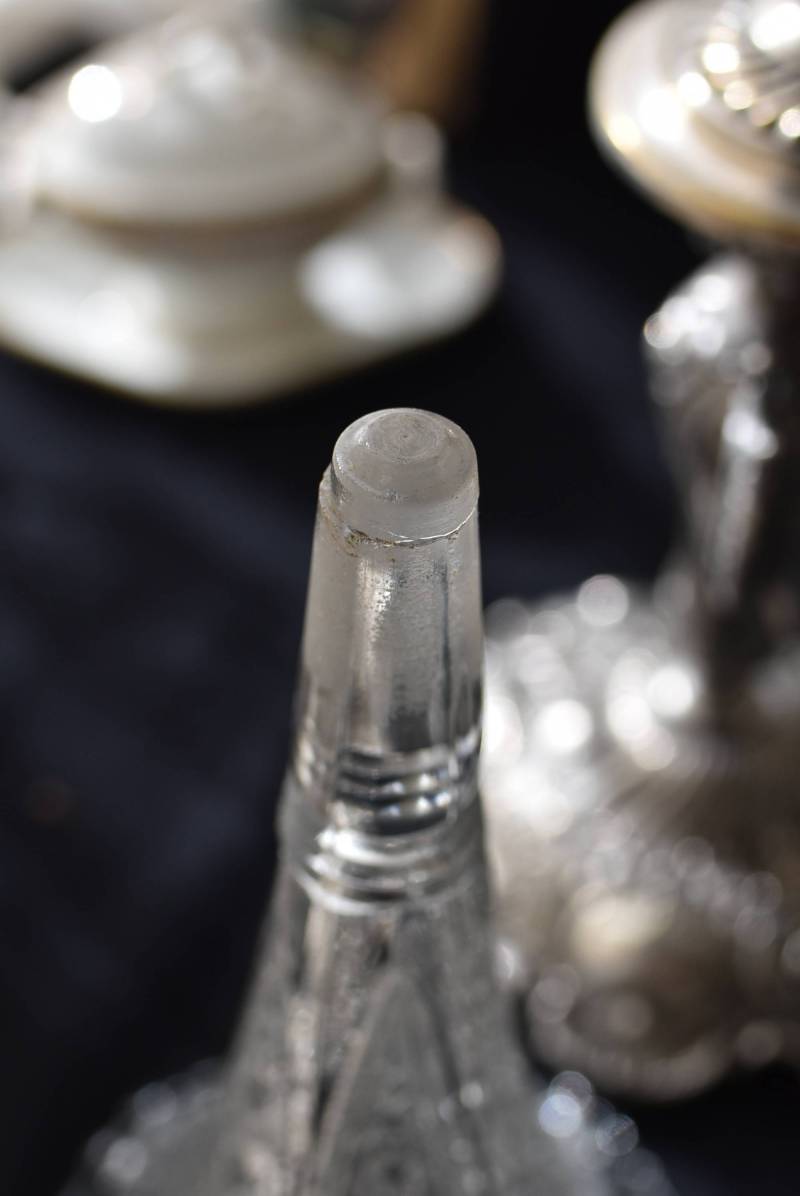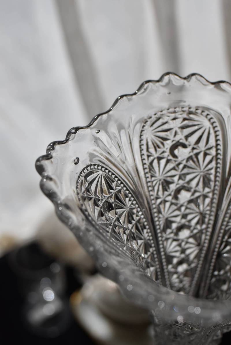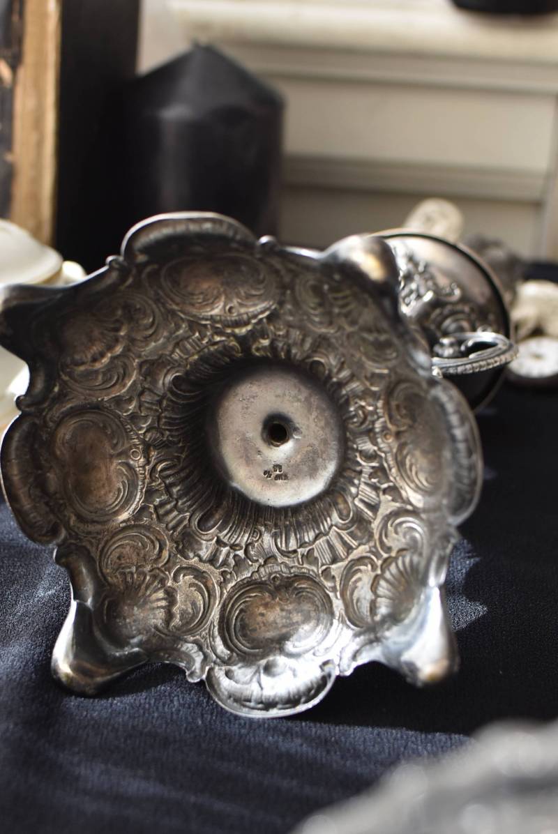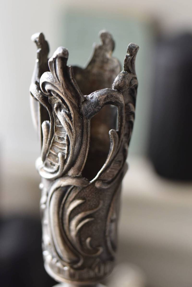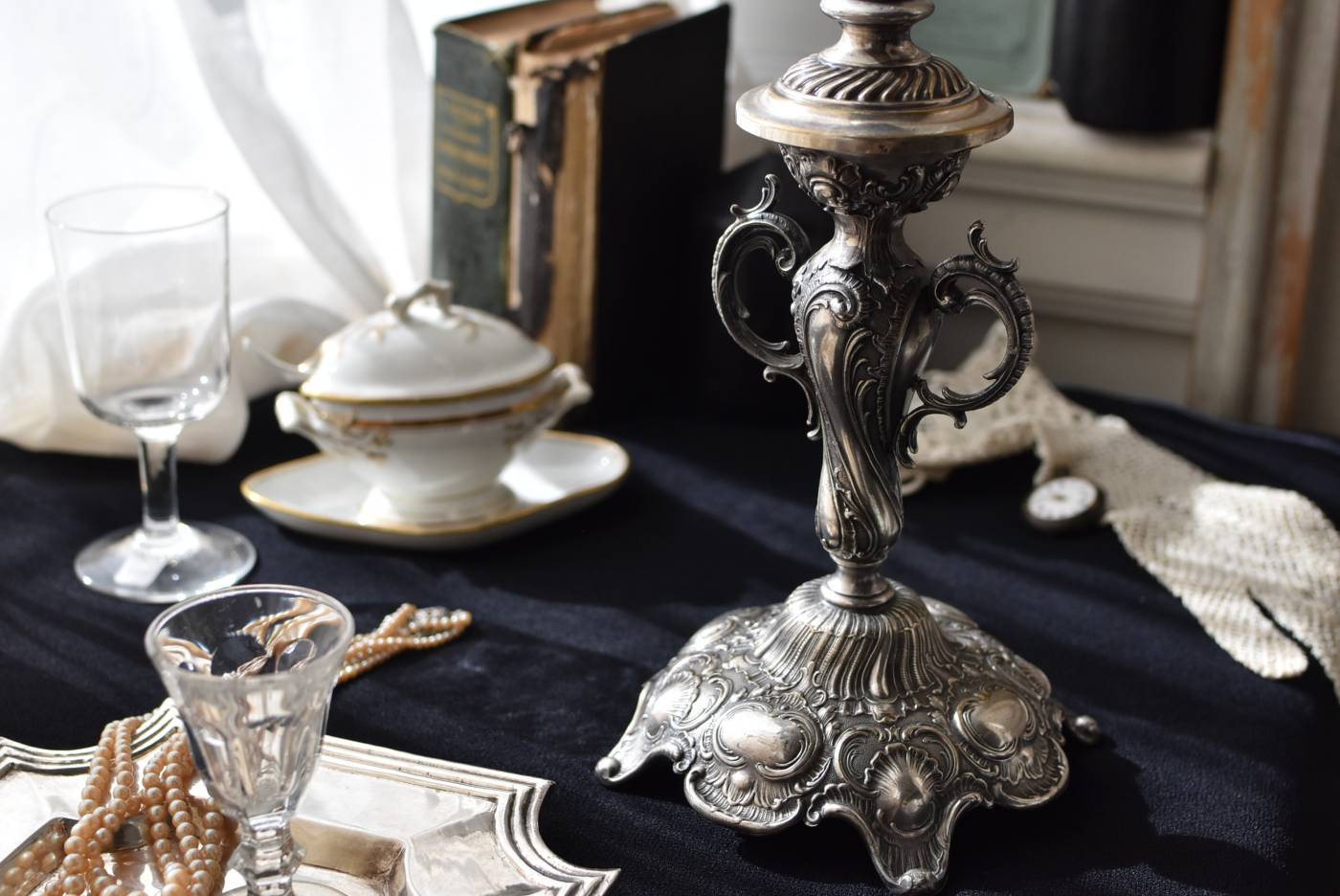 イパーン(epergne)と呼ばれるもので、卓上の雰囲気を高めてくれるフランスのフラワーベース。 縦に伸びた土台中央の両側には繊細な取っ手が施されており、ロカイユモチーフの繊細さや流れるようなレリーフで包まれた圧巻の佇まいです。上部に向かって広がりのあるラッパ型になったガラスパーツにも施されたカットデザインは光の反射によって引き立ち、フリルのような縁周りからも凛とした美しさが漂います。 ガラス部分は取り外す事ができるようになっているので、お手入れ時もスムーズです。オブジェのような背の高い姿は見惚れてしまう程で、異素材が組み合わさったシックなディスプレイを演出してくれます。 直径 約13cm H 約45cm 土台 約12×12.5cm