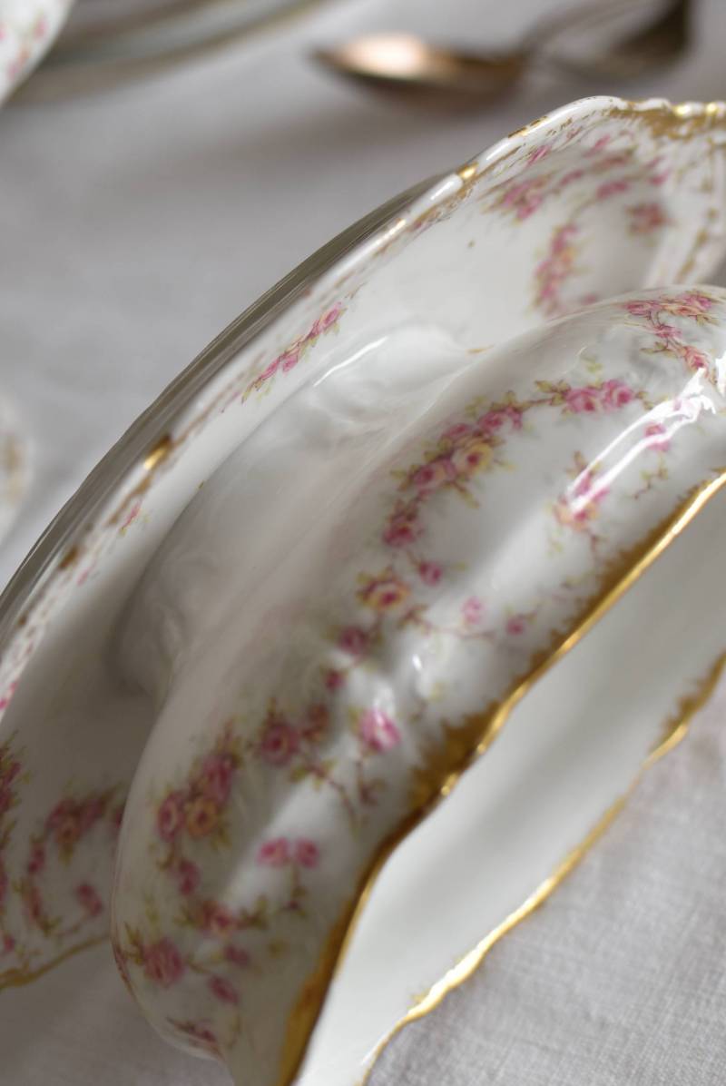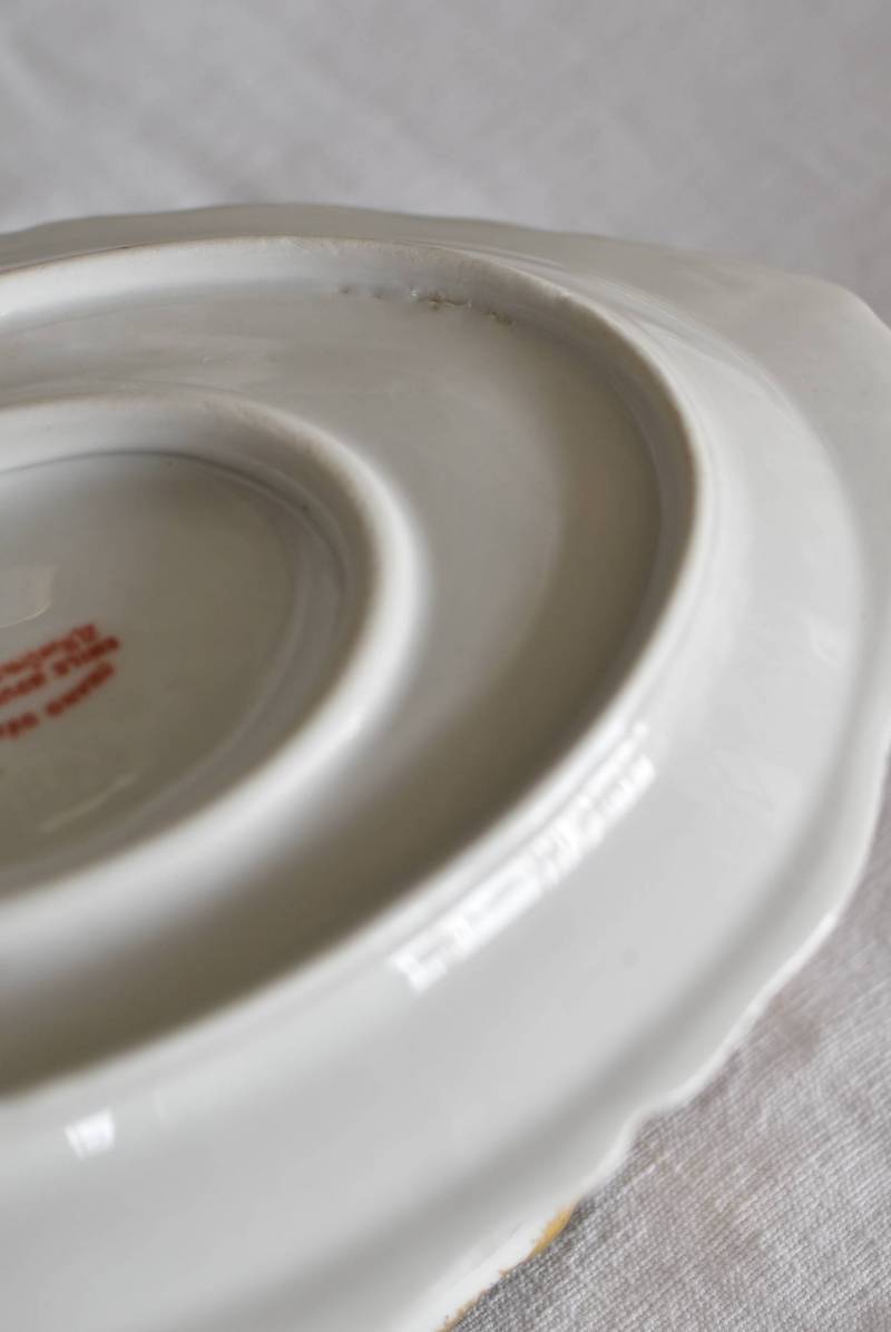 フランス・Emile Bourgeoisのソーシエール。 ふっくらとした丸みのあるフォルムに、まるでリースのような小花が連なったリズミカルな絵柄があしらわれ、上品かつ可憐な雰囲気が漂います。一体型となった容器と受け皿までもゴールドで縁取られており、鮮やかな明るい色合いと艶やかな質感によって高級感のある姿です。 よく見ると植物モチーフのレリーフも施されており、立体感のある華やかな作りが楽しめます。同じシリーズのスーピエールやお皿などの食器達で揃える事が出来ます。 W 約21.5cm D 約14cm H 約8cm