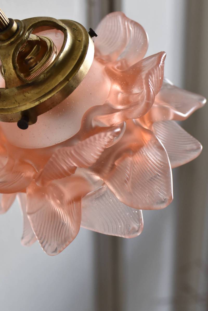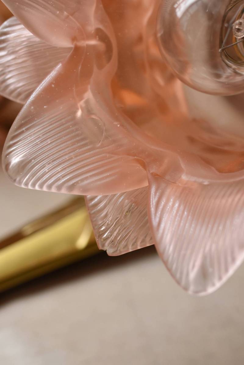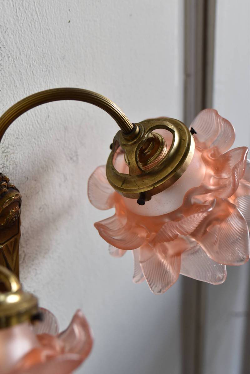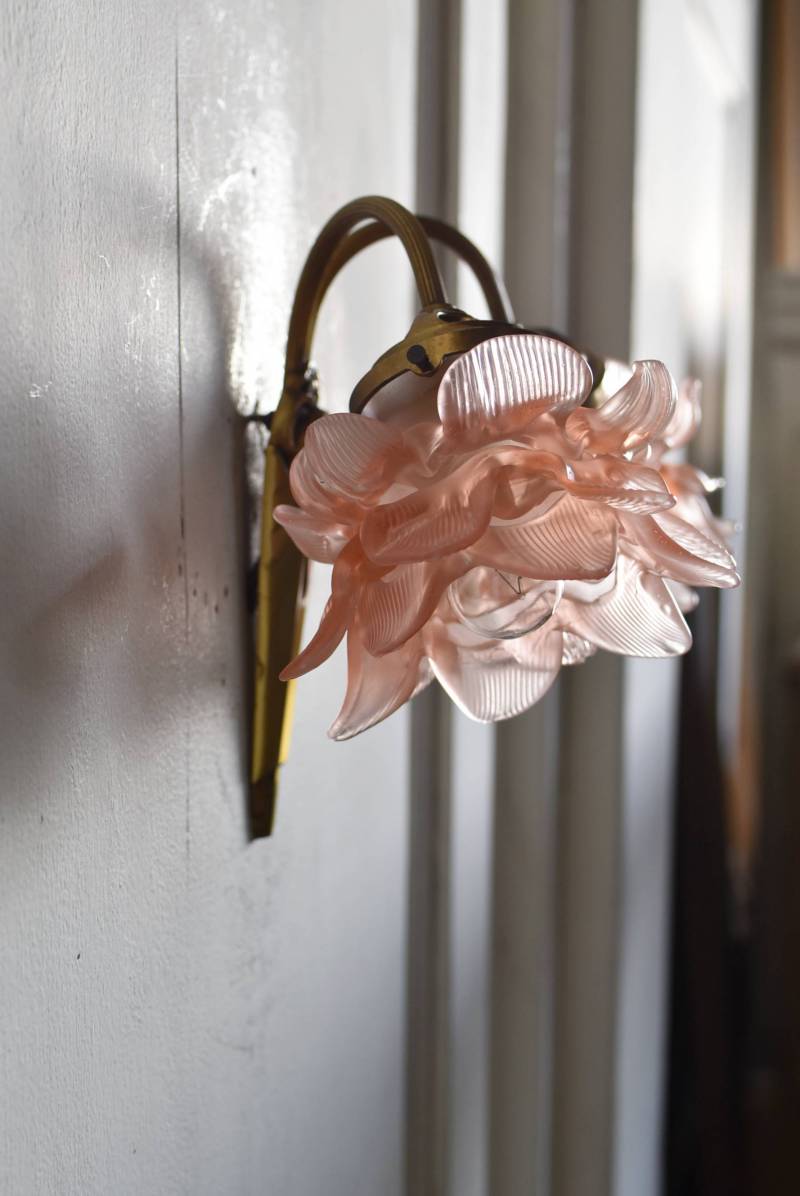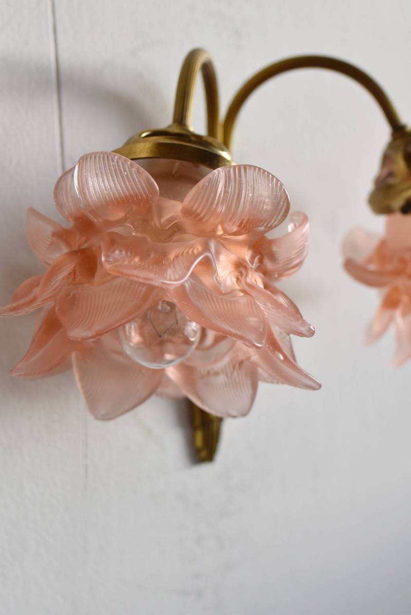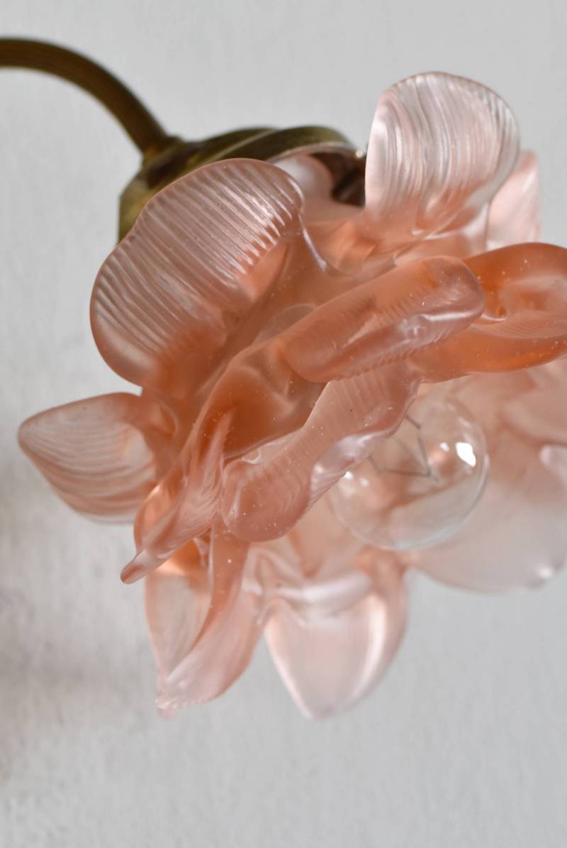 お花デザインのガラスシェードが甘いピンク色に色づき、大きく広がりのあるシルエットとなった気品高い印象を受けます。すっきりとした曲線を描いたアームと幾何学的要素のある土台とが組み合わさり、どこかスタイリッシュさも感じさせるような姿です。