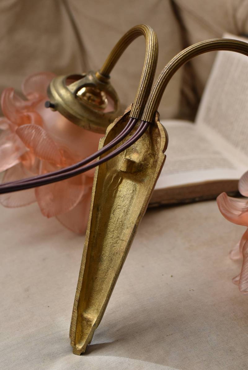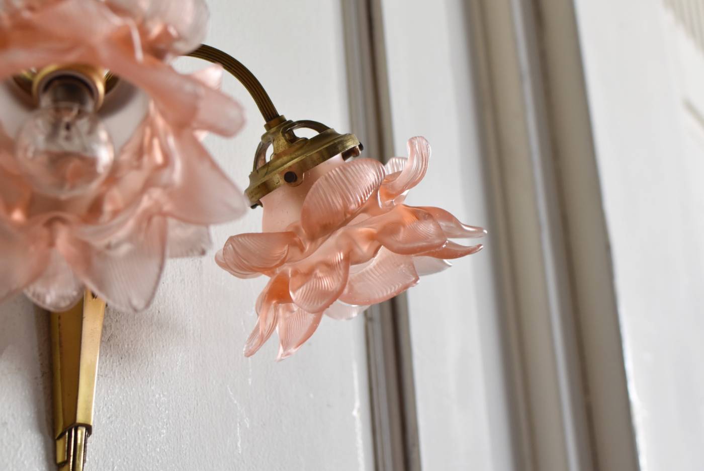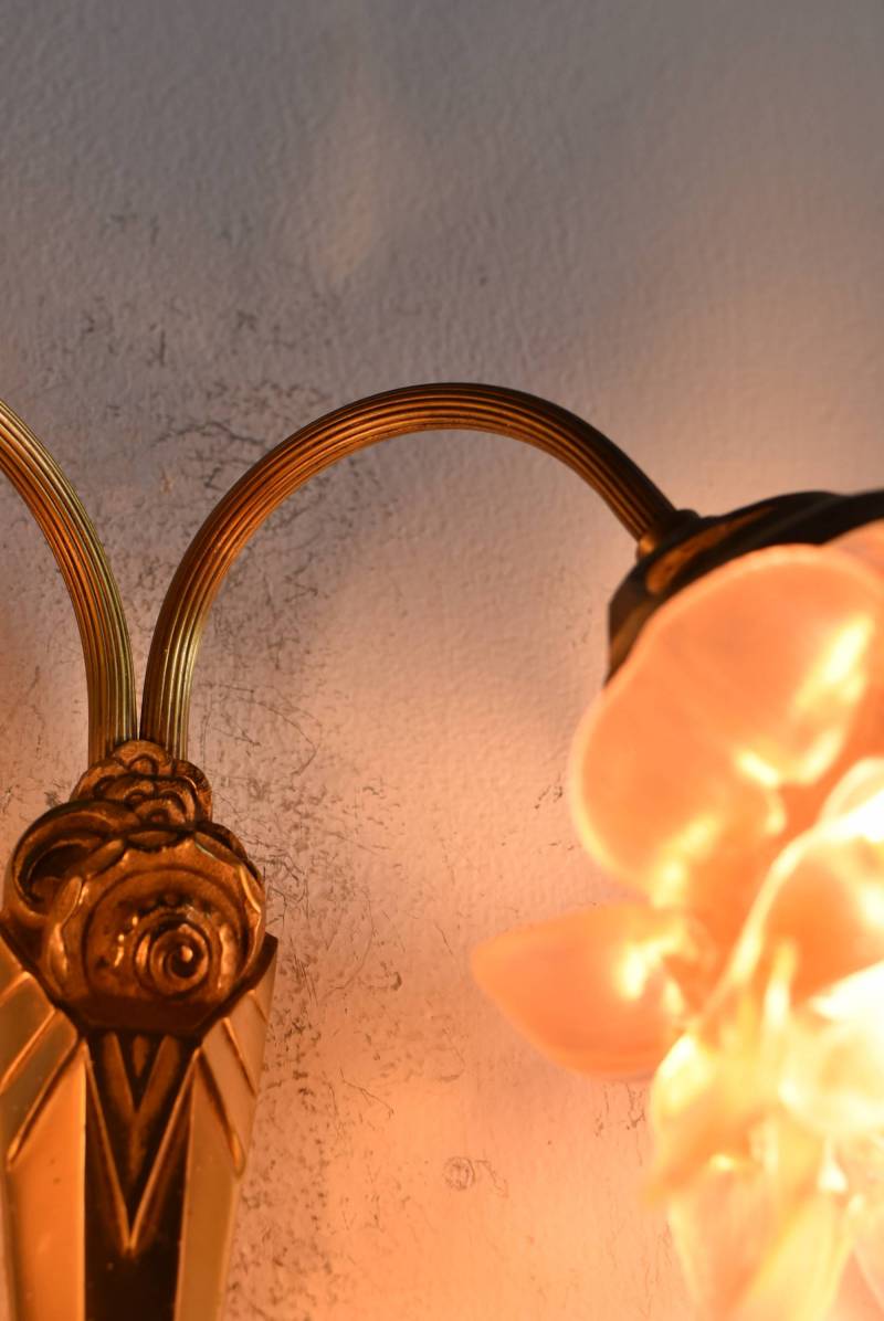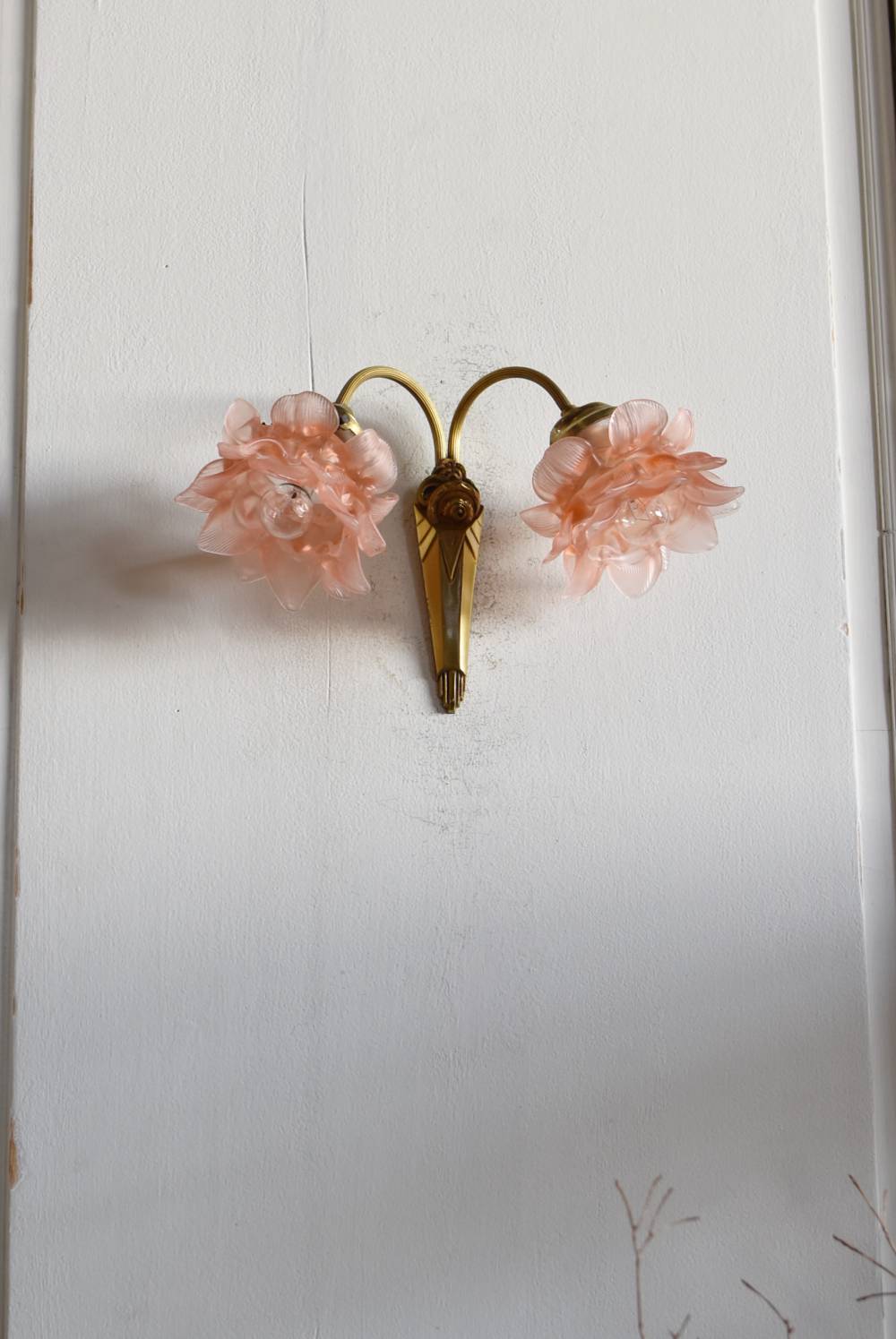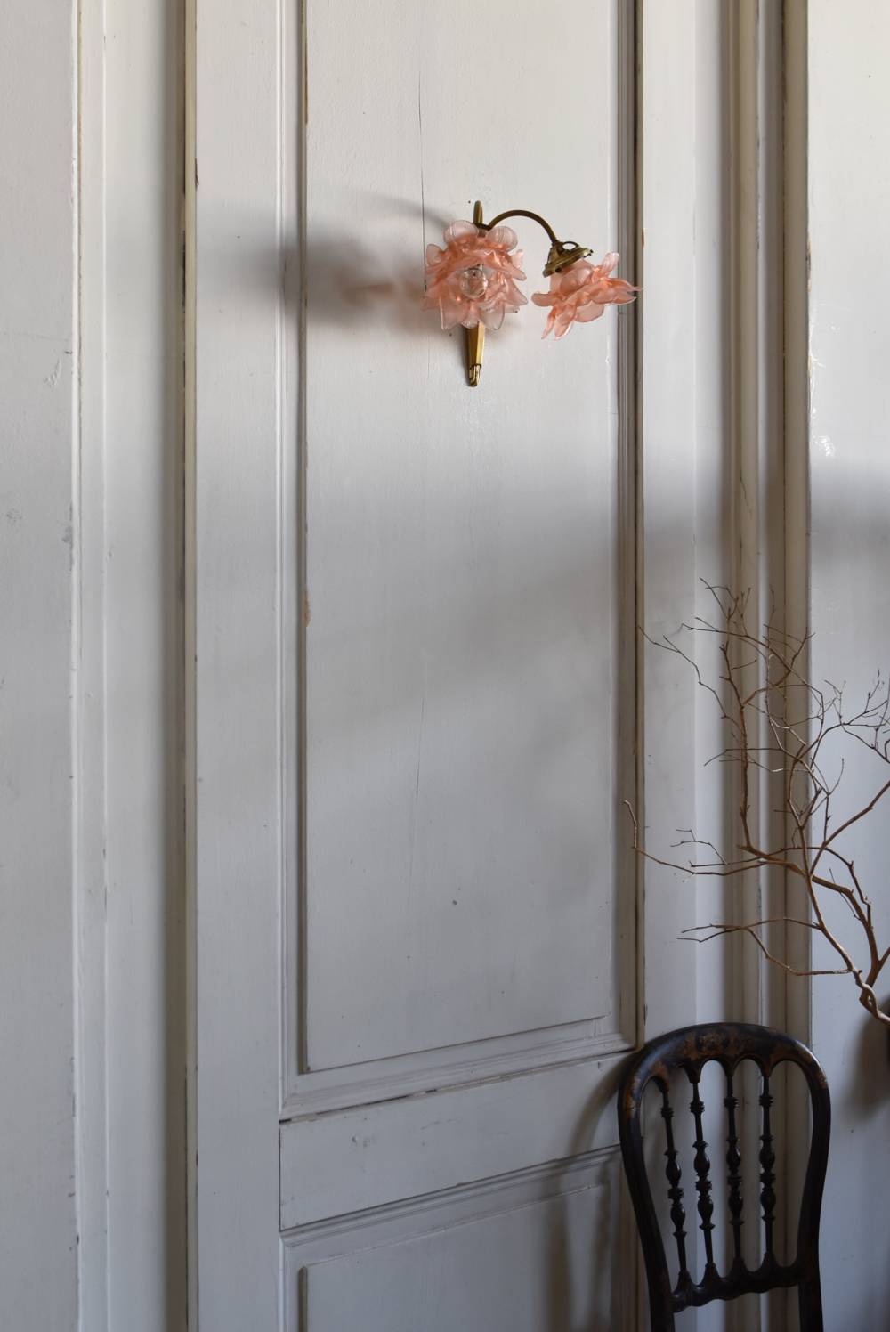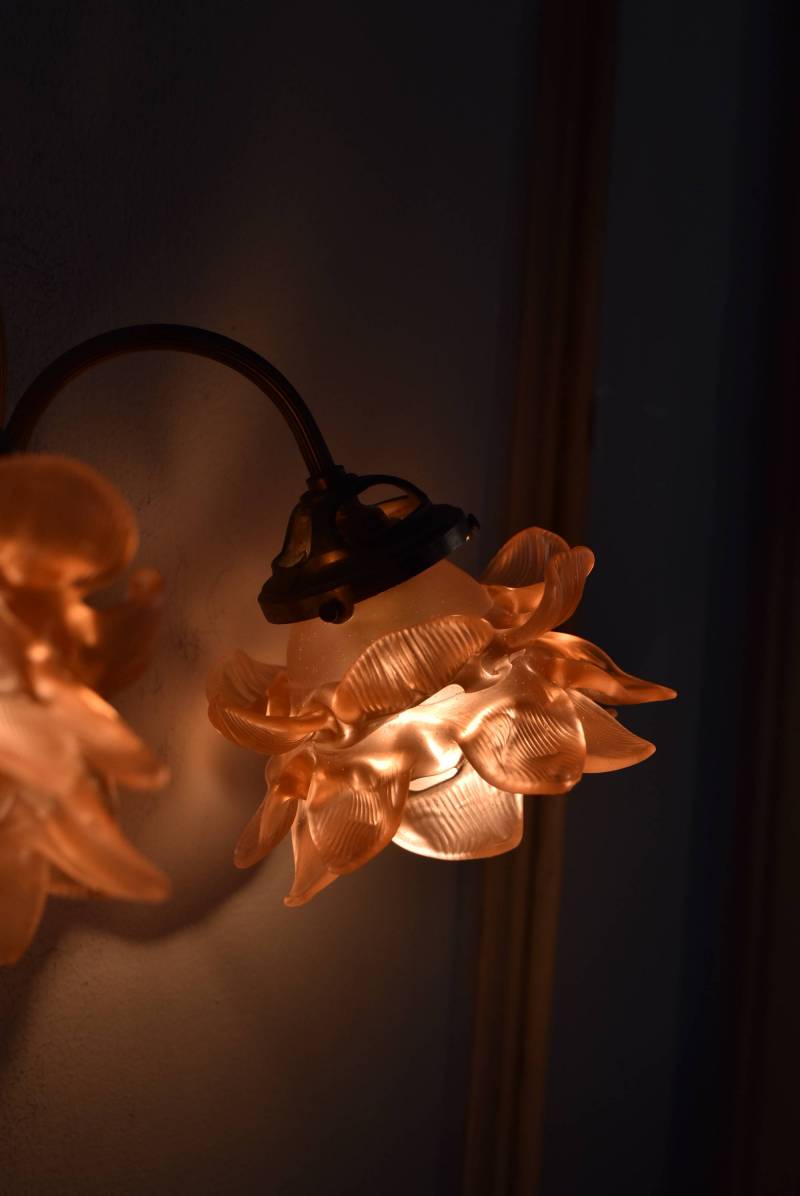 お花デザインのガラスシェードが甘いピンク色に色づき、大きく広がりのあるシルエットとなった気品高い印象を受けます。すっきりとした曲線を描いたアームと幾何学的要素のある土台とが組み合わさり、どこかスタイリッシュさも感じさせるような姿です。