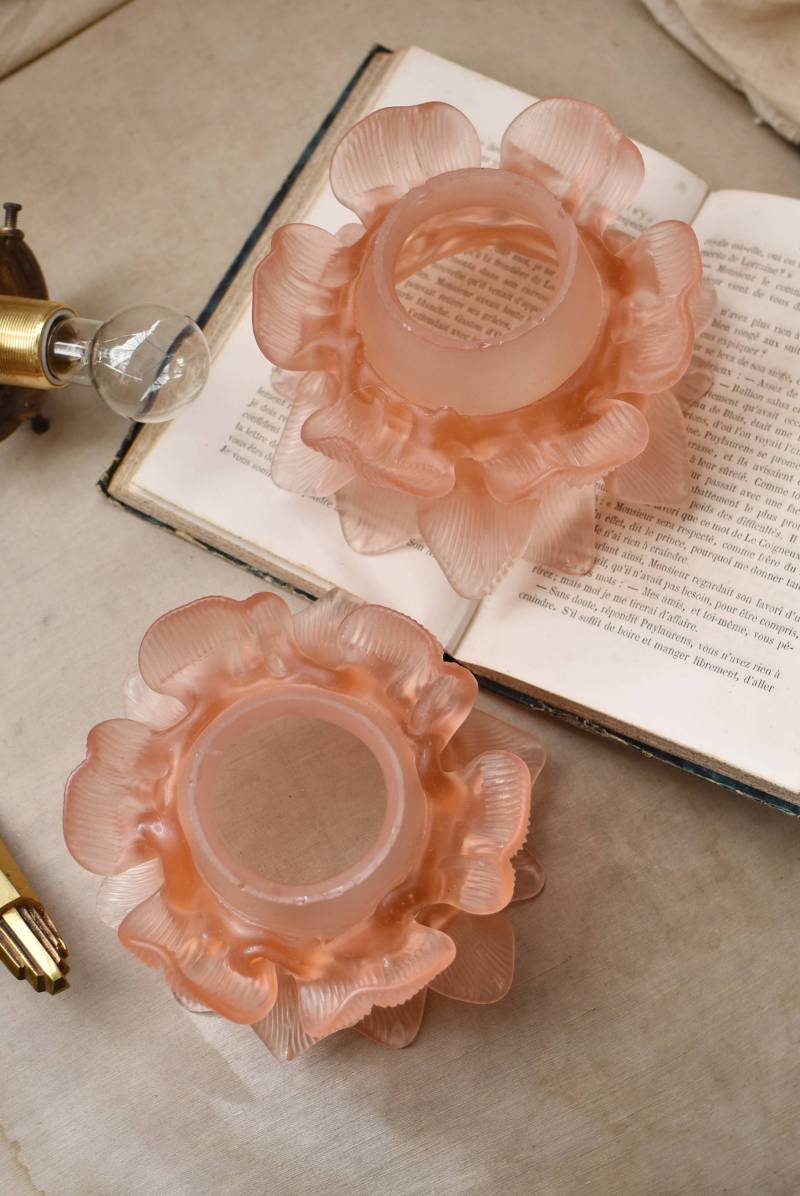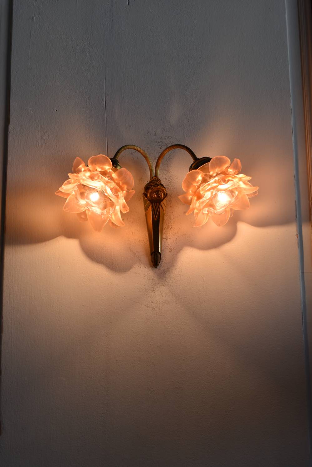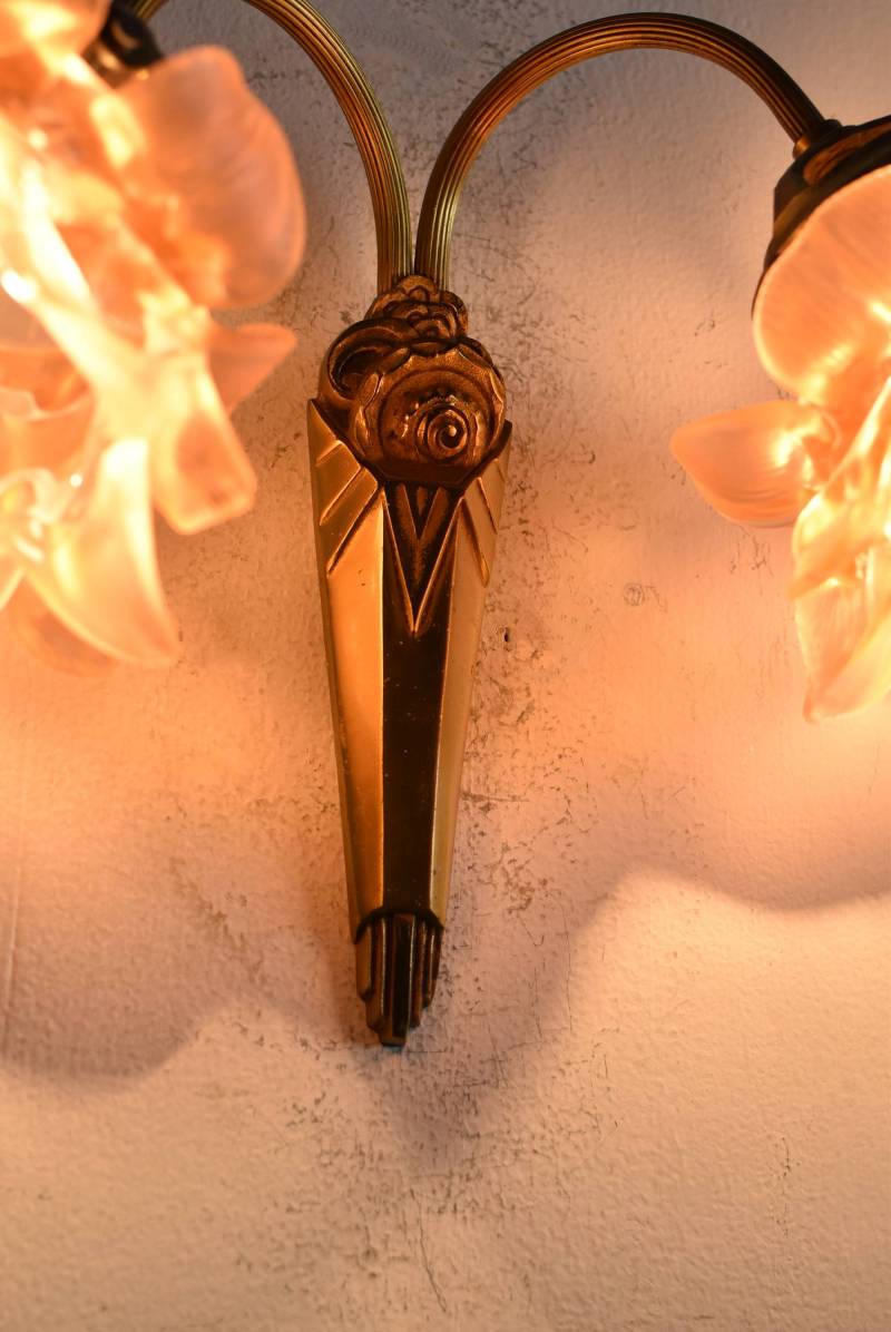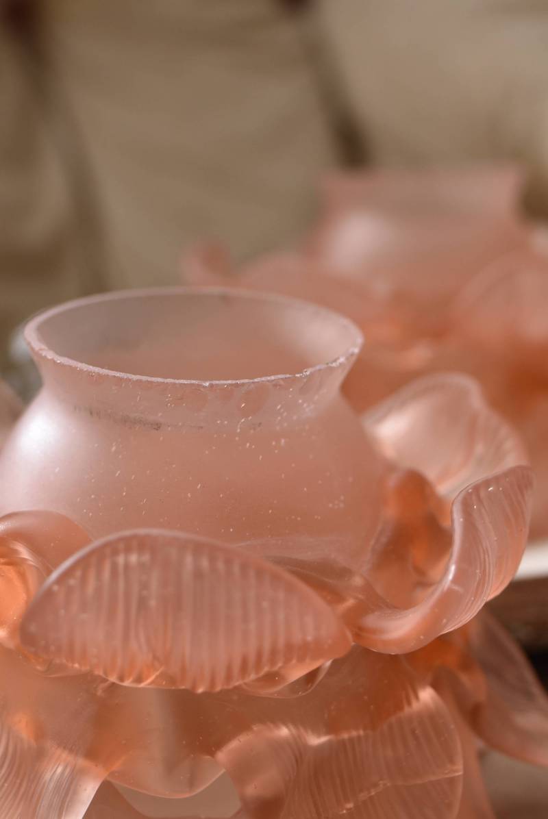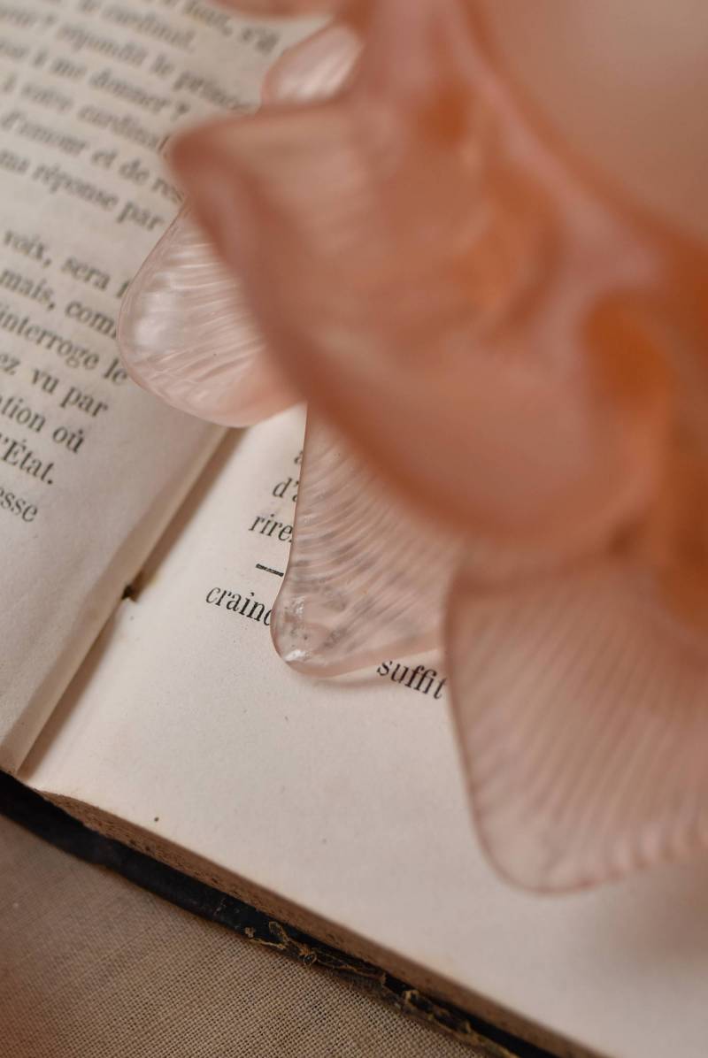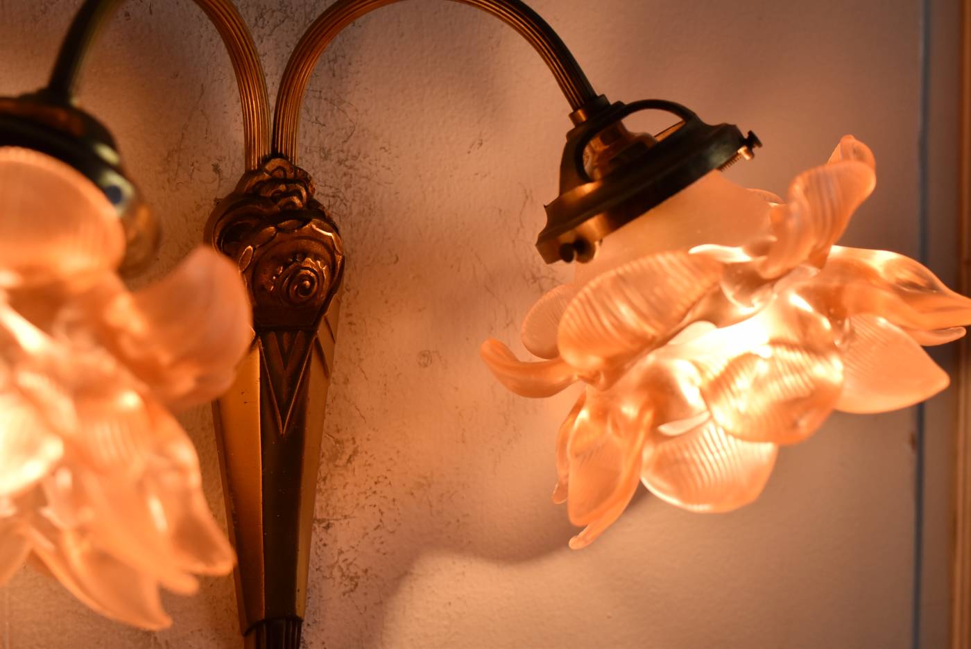 お花デザインのガラスシェードが甘いピンク色に色づき、大きく広がりのあるシルエットとなった気品高い印象を受けます。すっきりとした曲線を描いたアームと幾何学的要素のある土台とが組み合わさり、どこかスタイリッシュさも感じさせるような姿です。