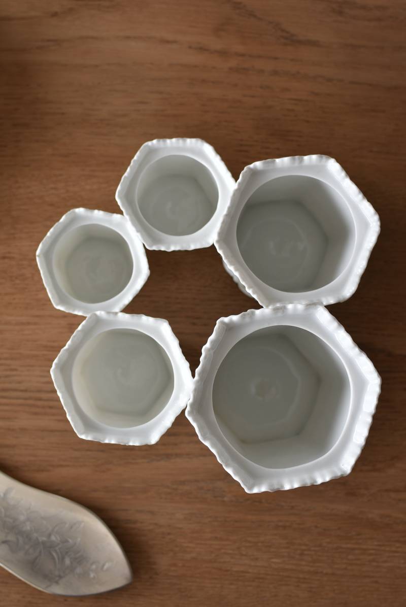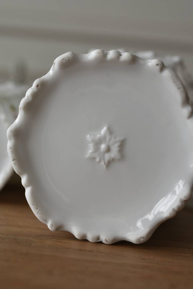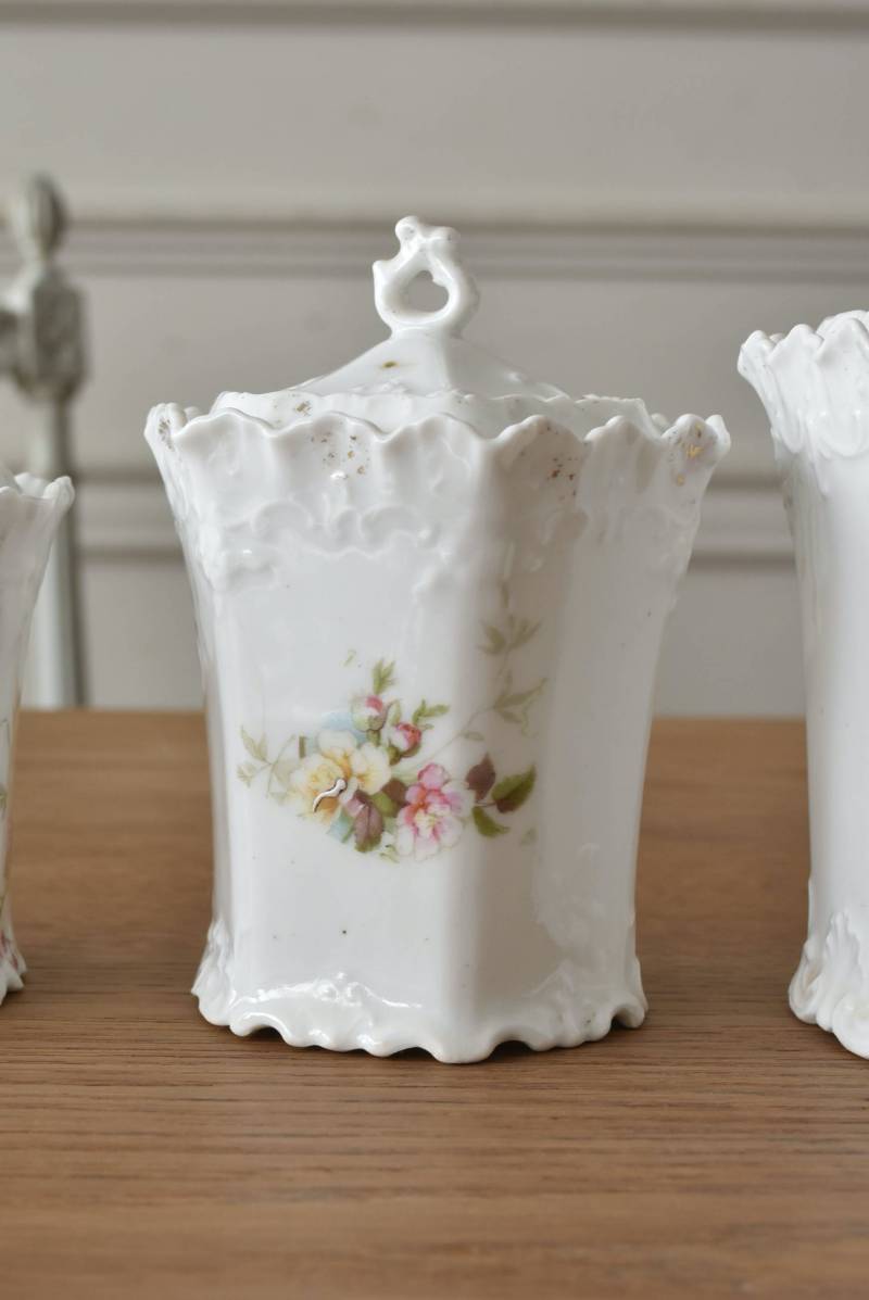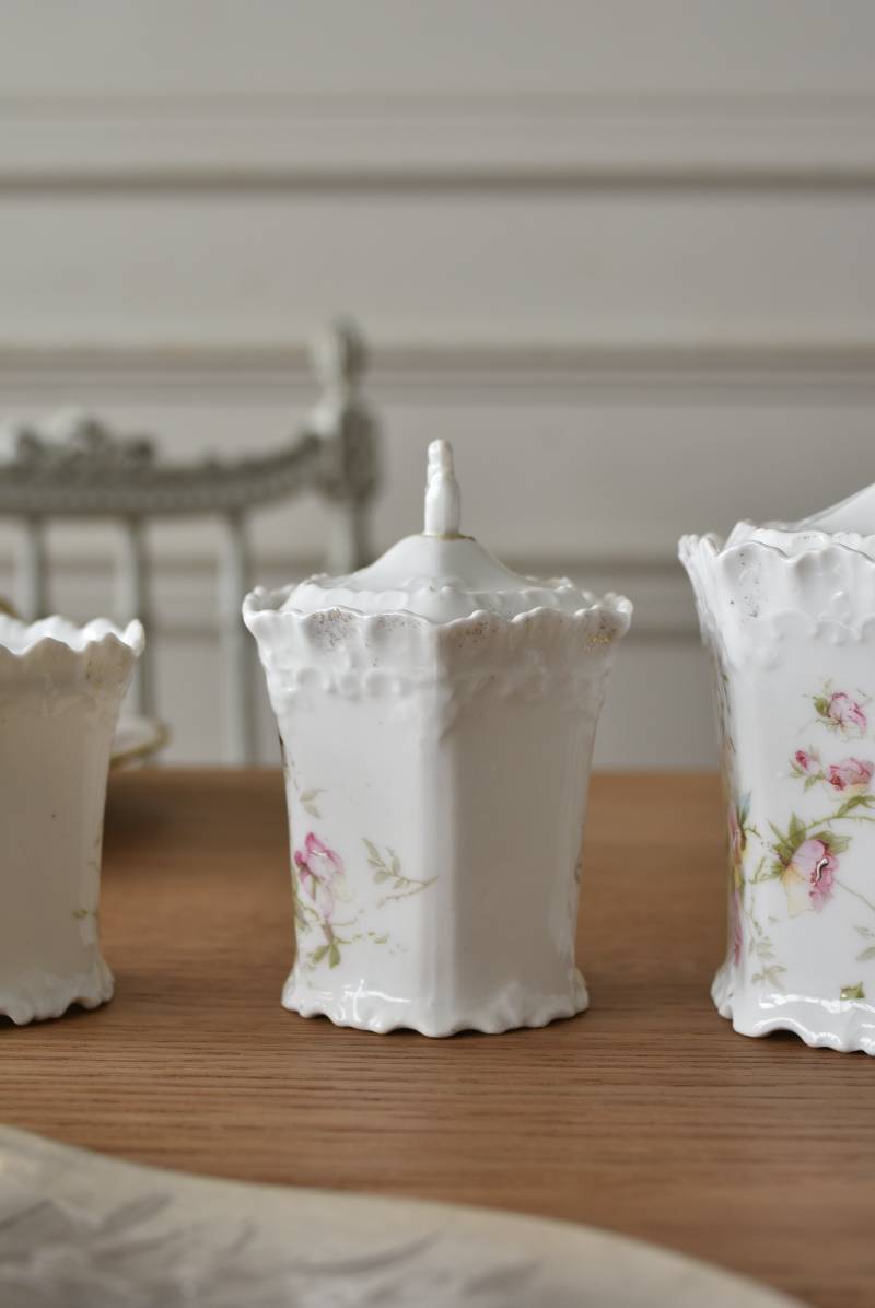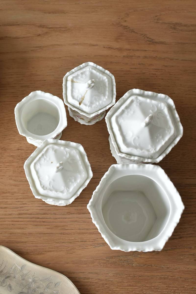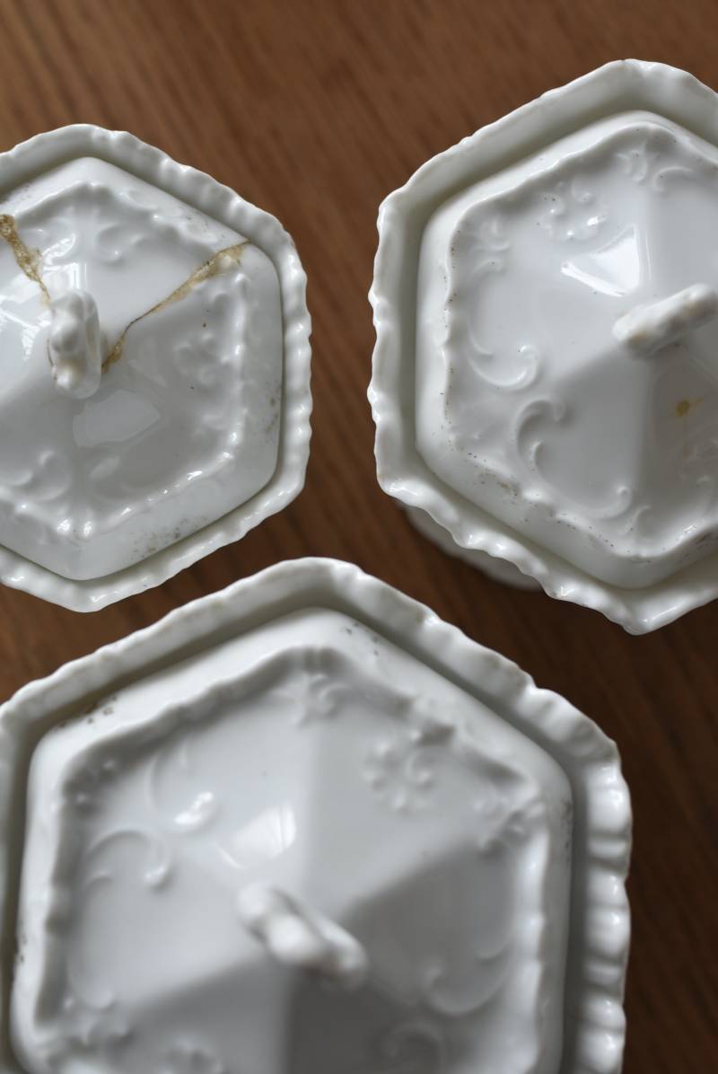 透けるような白磁器に繊細なレリーフがあしらわれた気品高い姿で、六角形を描くシルエットが特徴的。表面にはバラをモチーフとしたプリントと金彩の文字が描かれており、フランスらしいエレガントな印象をもたらしてくれます。5つのうち2つの蓋がなくなってしまっており、修復跡など趣豊かな風合いも見受けられます。