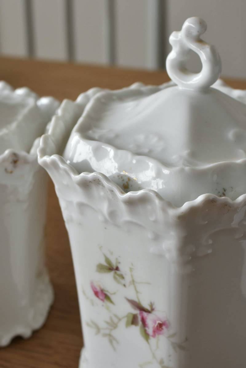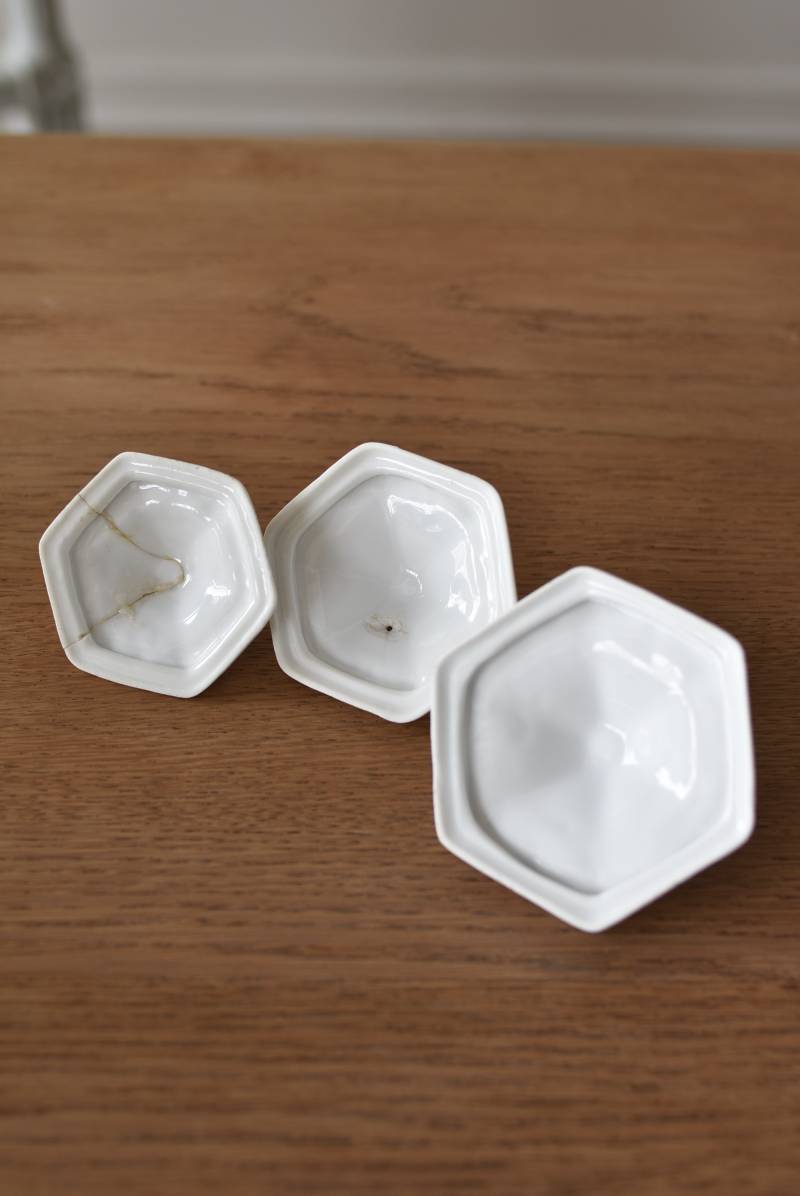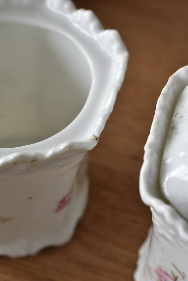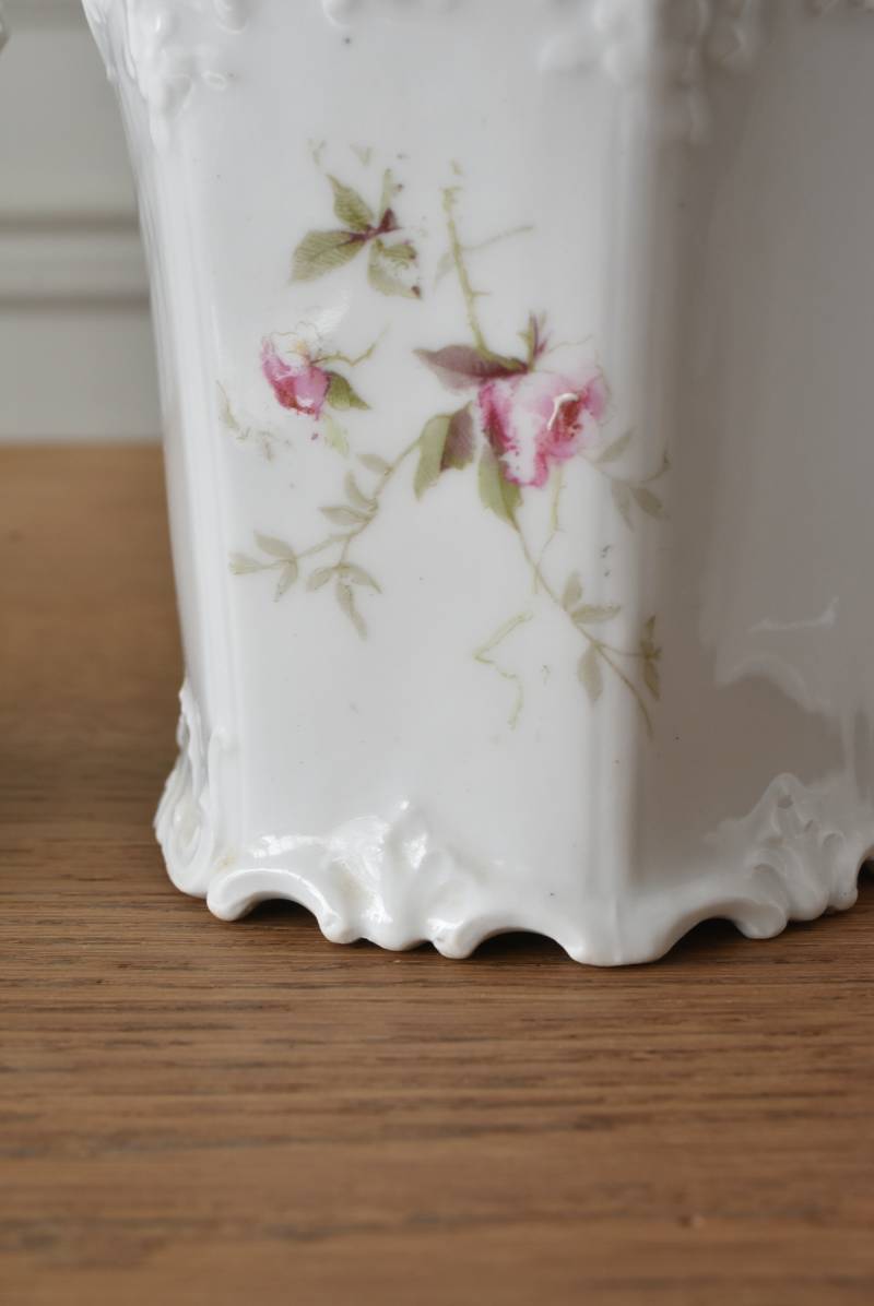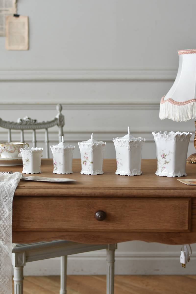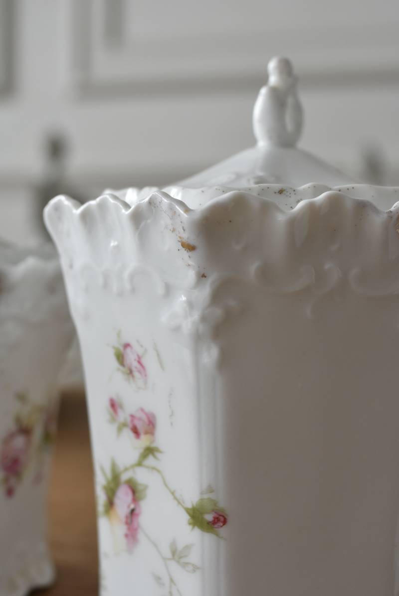 透けるような白磁器に繊細なレリーフがあしらわれた気品高い姿で、六角形を描くシルエットが特徴的。表面にはバラをモチーフとしたプリントと金彩の文字が描かれており、フランスらしいエレガントな印象をもたらしてくれます。5つのうち2つの蓋がなくなってしまっており、修復跡など趣豊かな風合いも見受けられます。