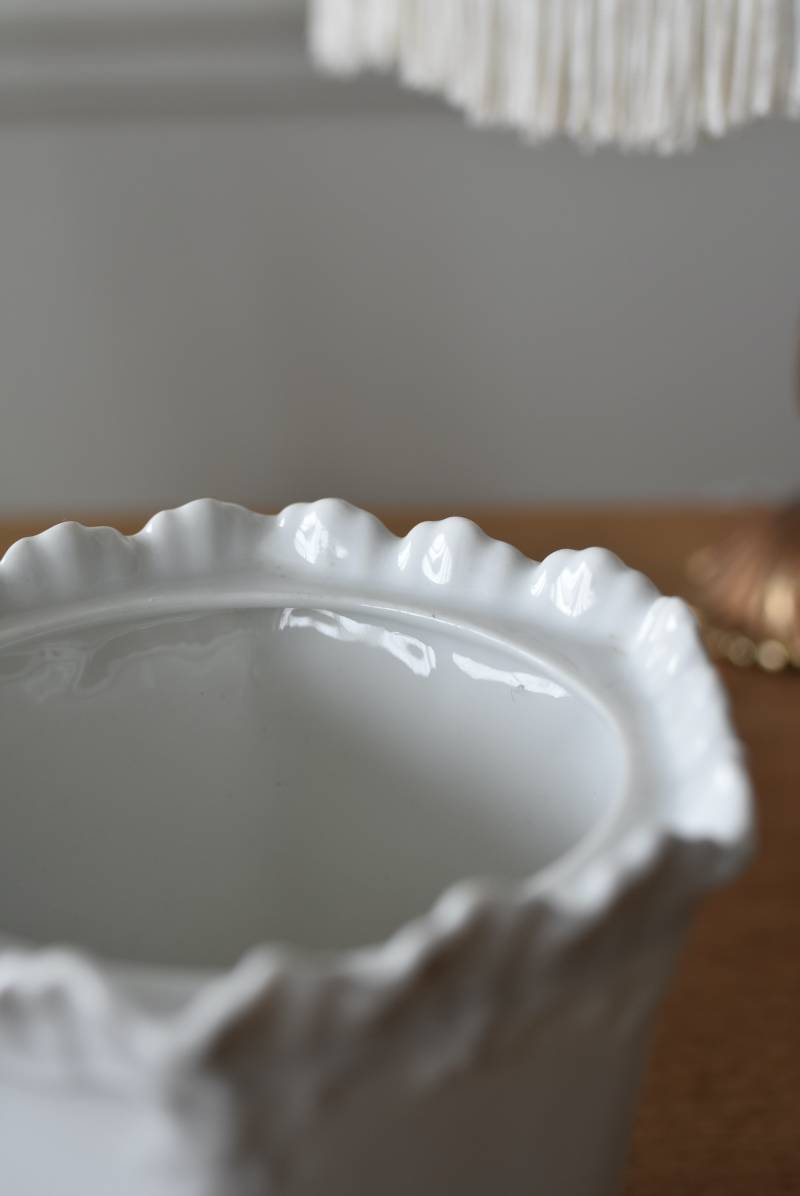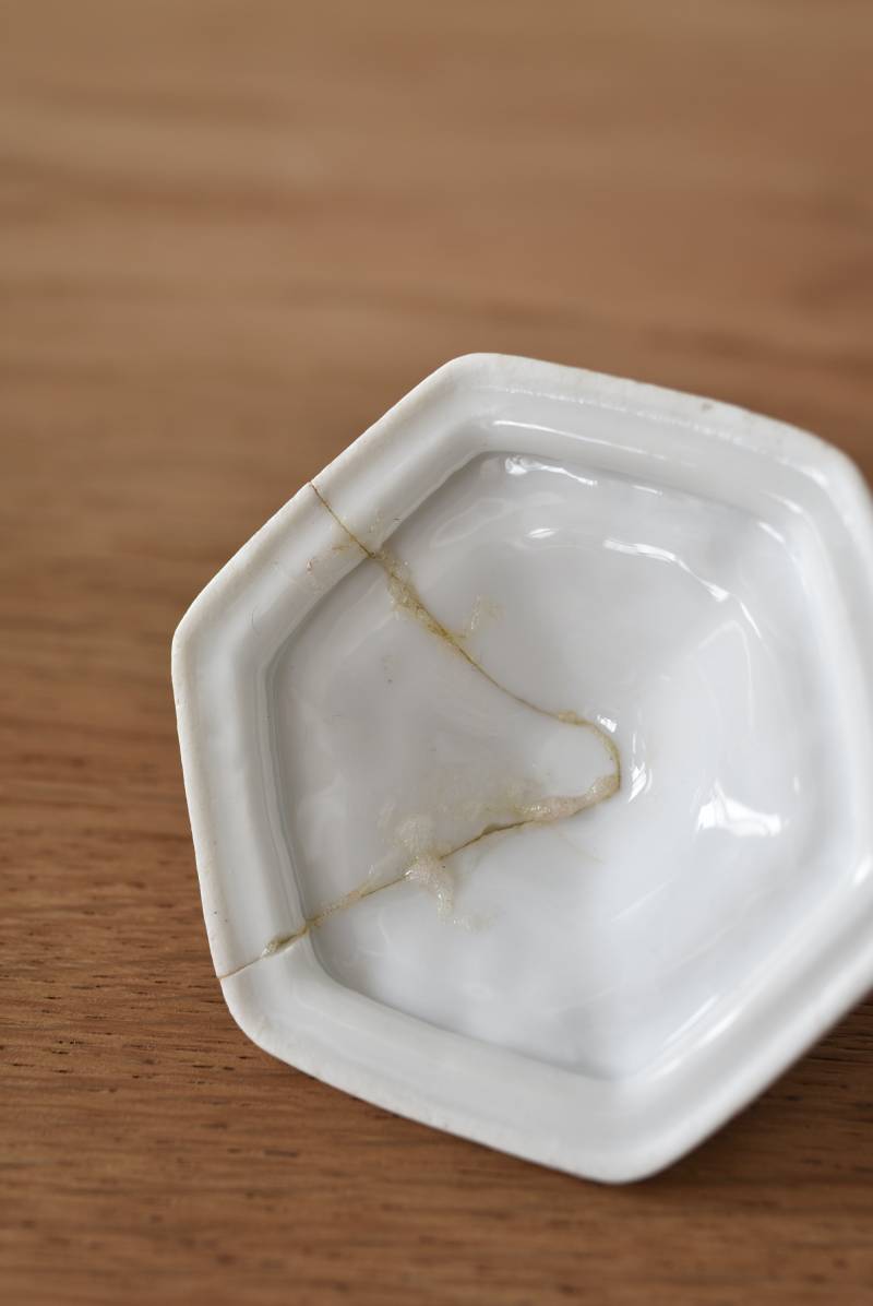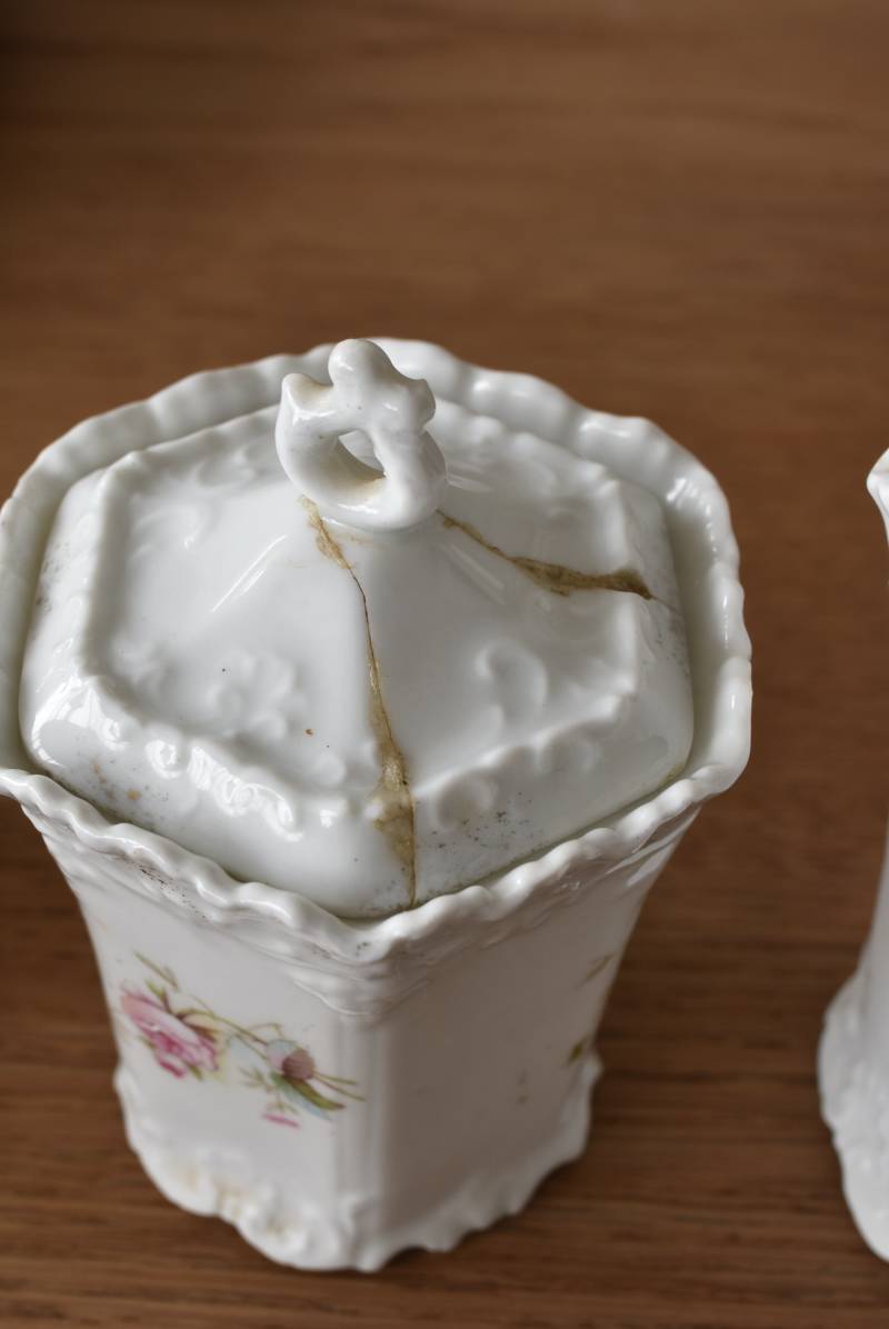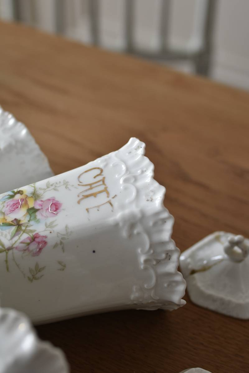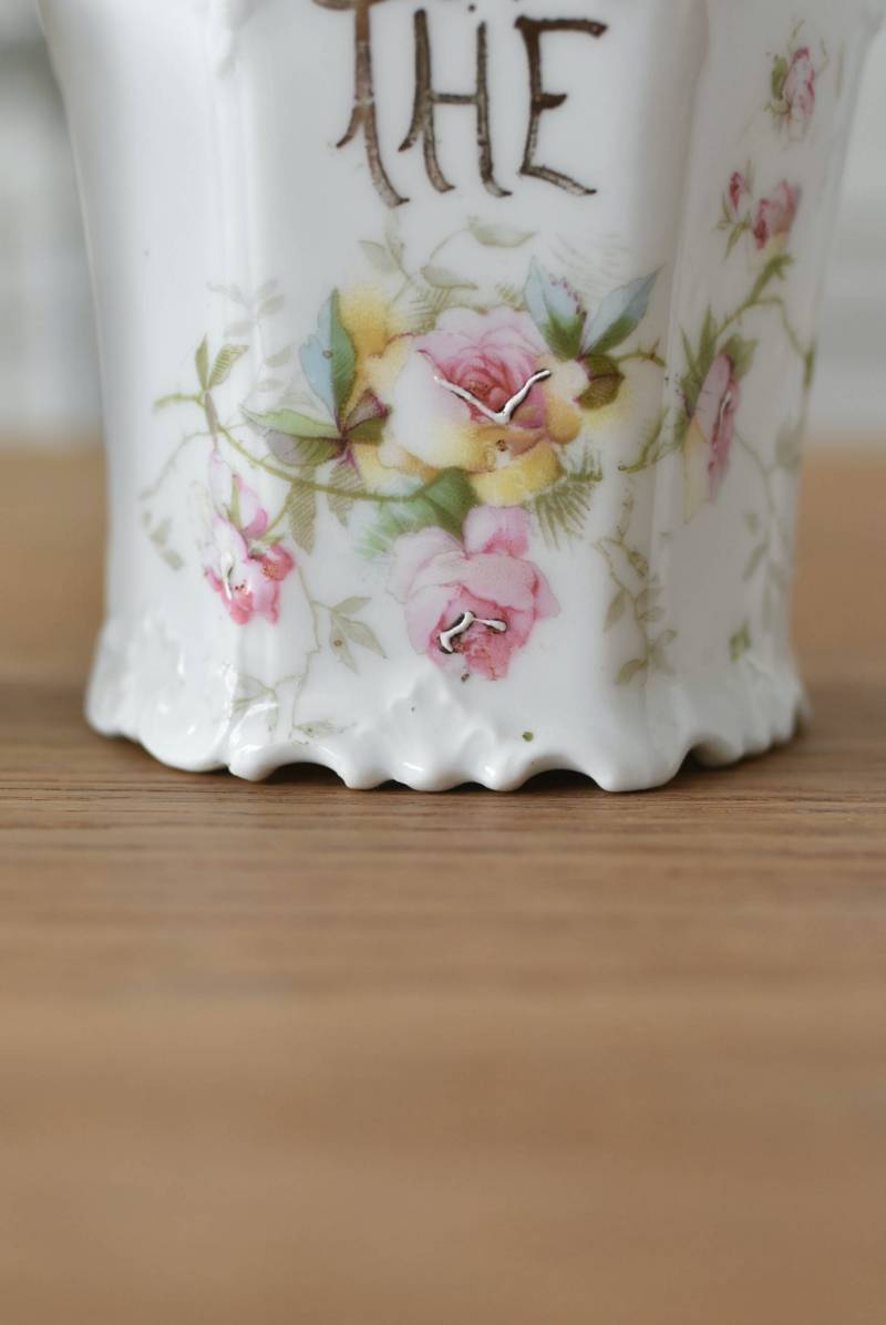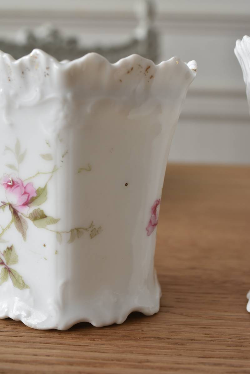 透けるような白磁器に繊細なレリーフがあしらわれた気品高い姿で、六角形を描くシルエットが特徴的。表面にはバラをモチーフとしたプリントと金彩の文字が描かれており、フランスらしいエレガントな印象をもたらしてくれます。5つのうち2つの蓋がなくなってしまっており、修復跡など趣豊かな風合いも見受けられます。