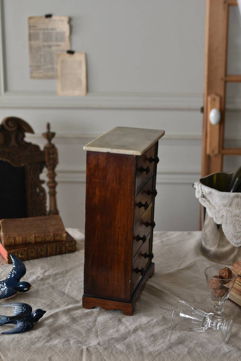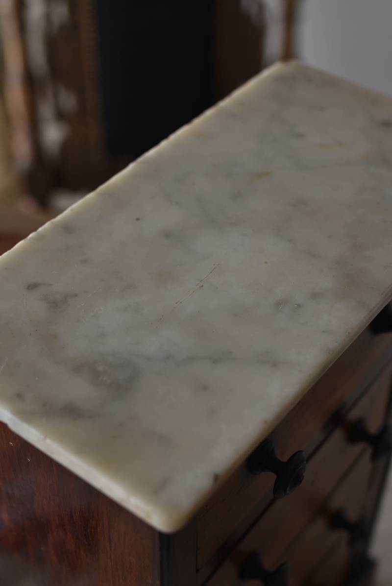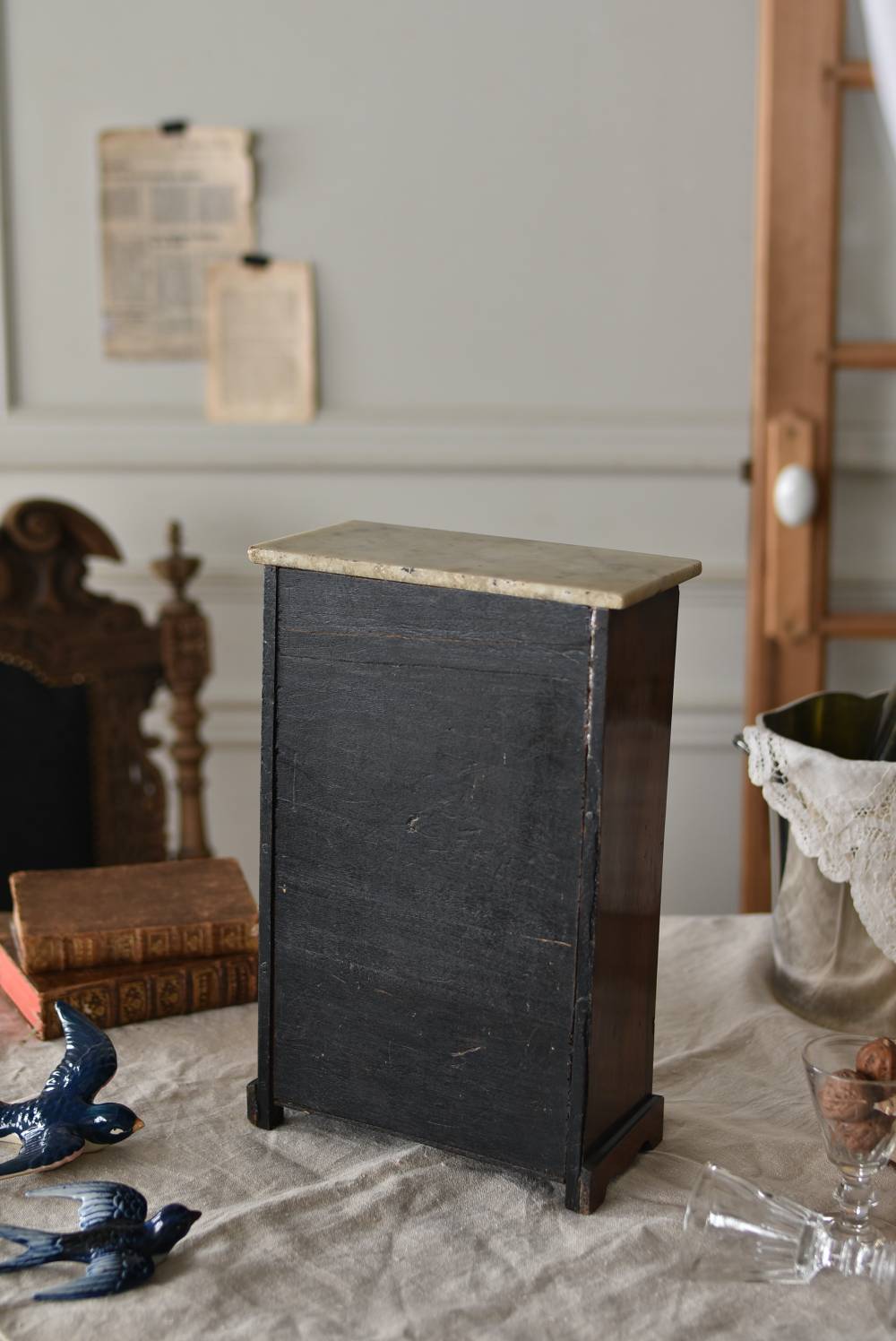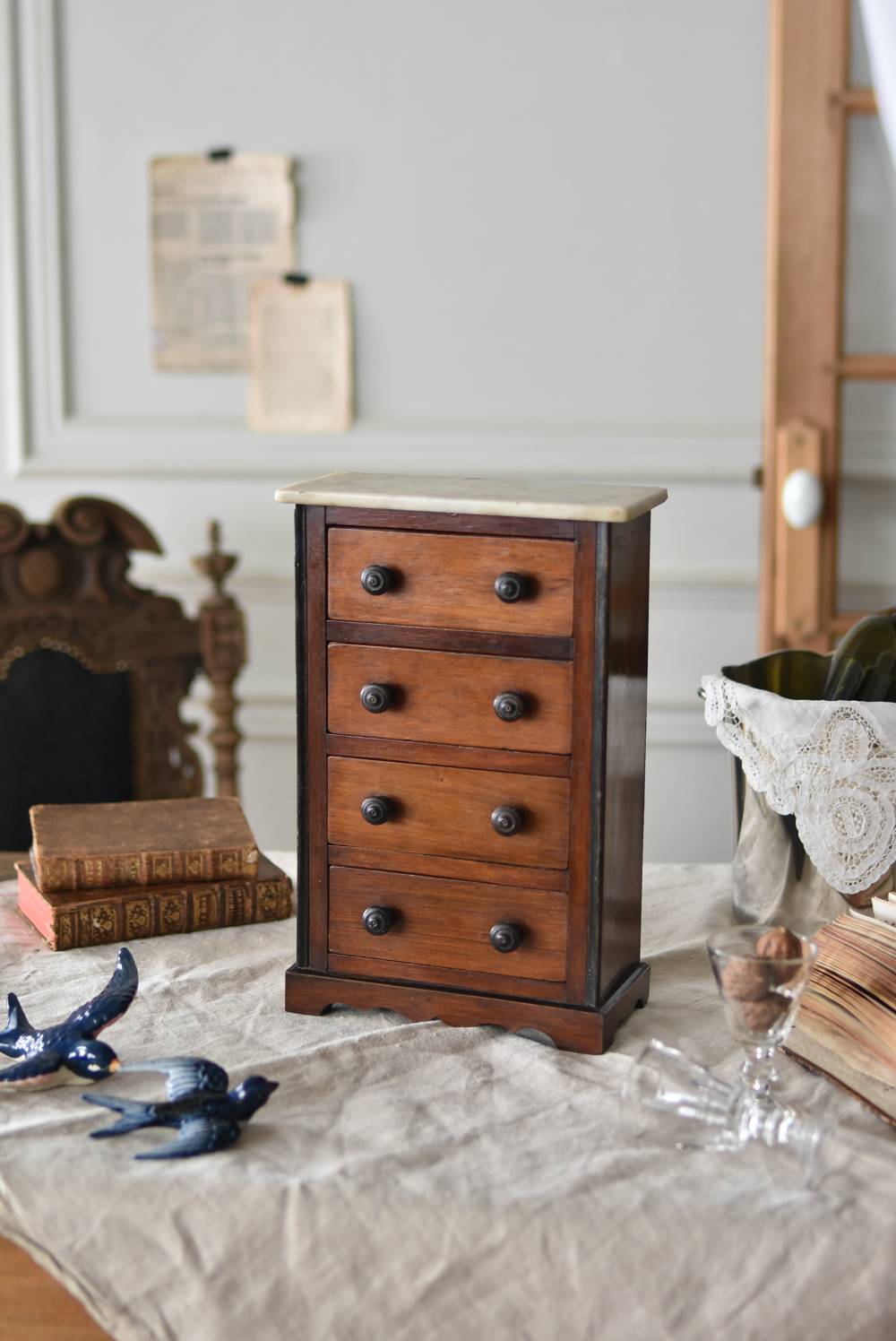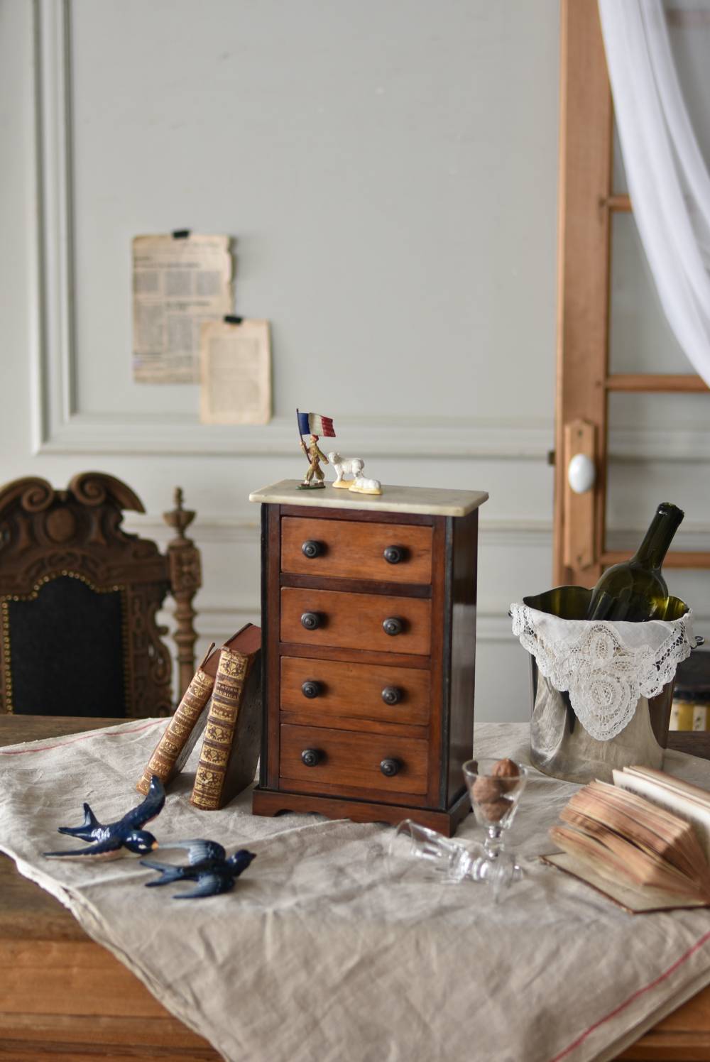 フランスの4段ミニチェスト。 トップにホワイトを基調としたマーブルストーン(大理石)があしらわれた小さいながらも高級感漂う佇まい。ブラウンカラーのボディにブラックカラーの木取手があしらわれたシックな姿で、天板とのコントラストが効いたかっこいい印象のデザインとなっています。小さな引き出しは4つ設けられており、細かなものを仕分けて収納できる機能的な一面も。 落ち着いた色味でまとまったクラシカルな装いで卓上ディスプレイをより素敵に演出してくれるアイテムです。 W 約21.5cm D 約11cm H 約32.7cm 引き出し内寸 W約14cm×D約6.2cm×H約4cm