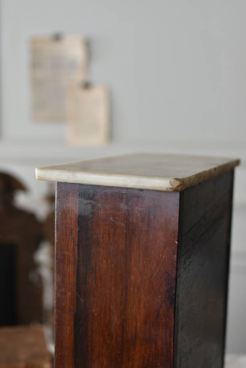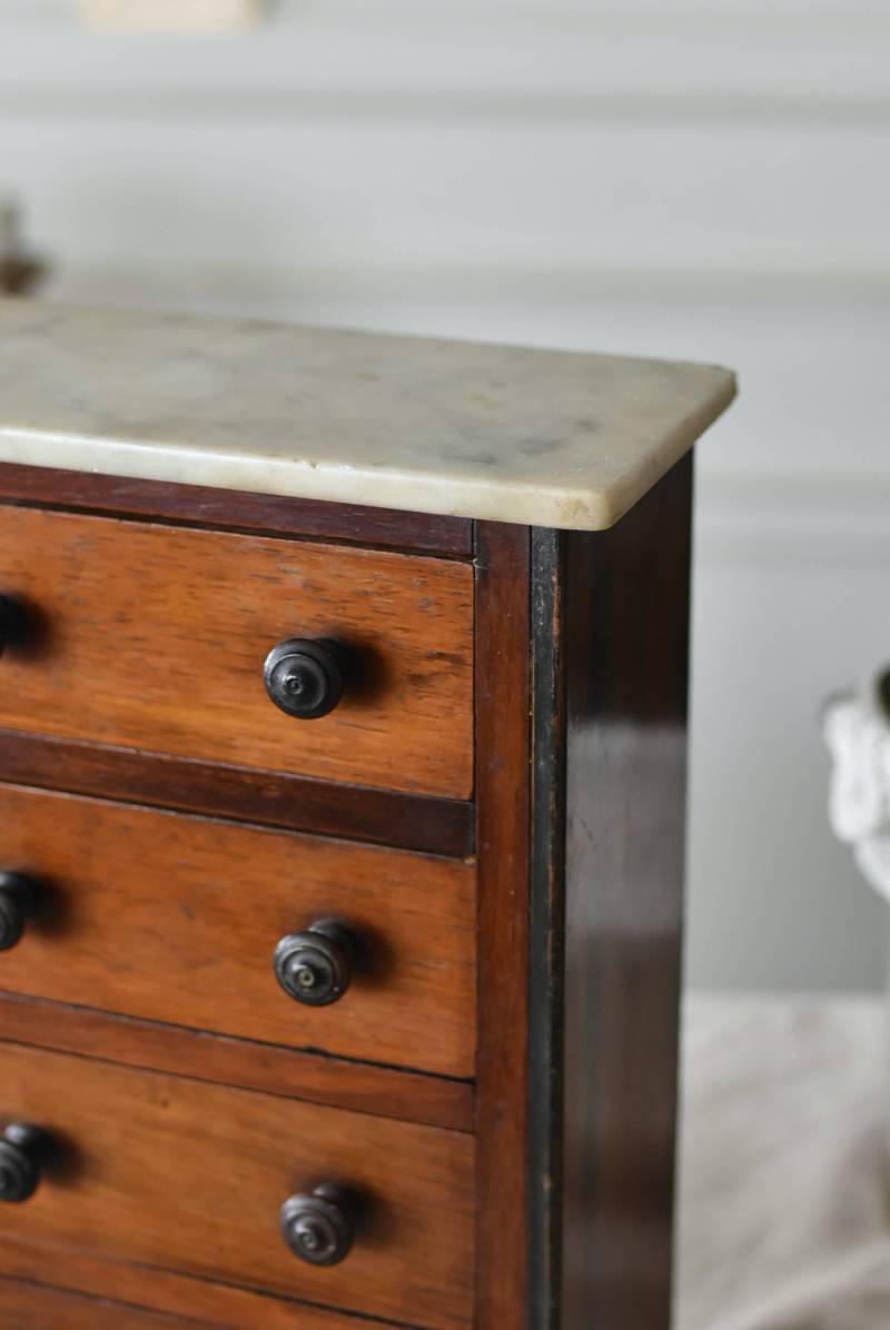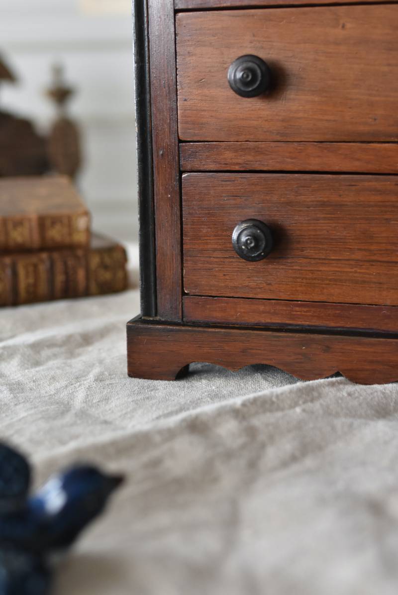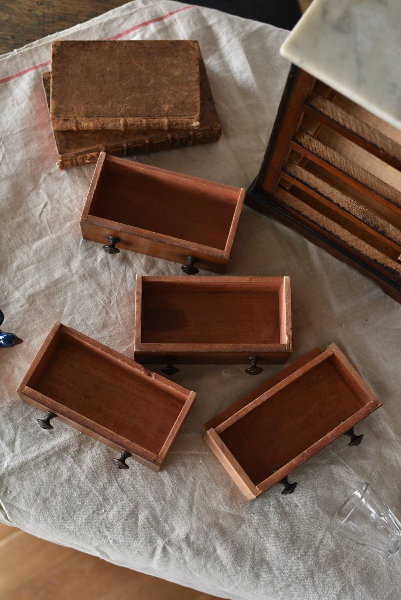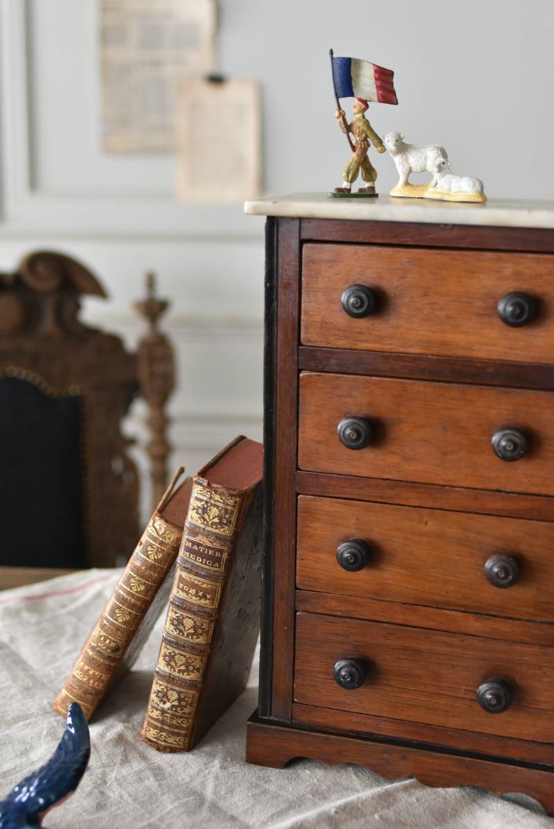 フランスの4段ミニチェスト。 トップにホワイトを基調としたマーブルストーン(大理石)があしらわれた小さいながらも高級感漂う佇まい。ブラウンカラーのボディにブラックカラーの木取手があしらわれたシックな姿で、天板とのコントラストが効いたかっこいい印象のデザインとなっています。小さな引き出しは4つ設けられており、細かなものを仕分けて収納できる機能的な一面も。 落ち着いた色味でまとまったクラシカルな装いで卓上ディスプレイをより素敵に演出してくれるアイテムです。 W 約21.5cm D 約11cm H 約32.7cm 引き出し内寸 W約14cm×D約6.2cm×H約4cm