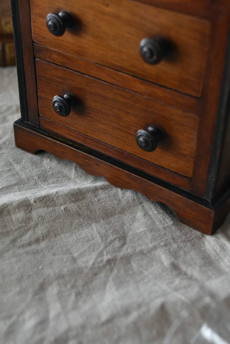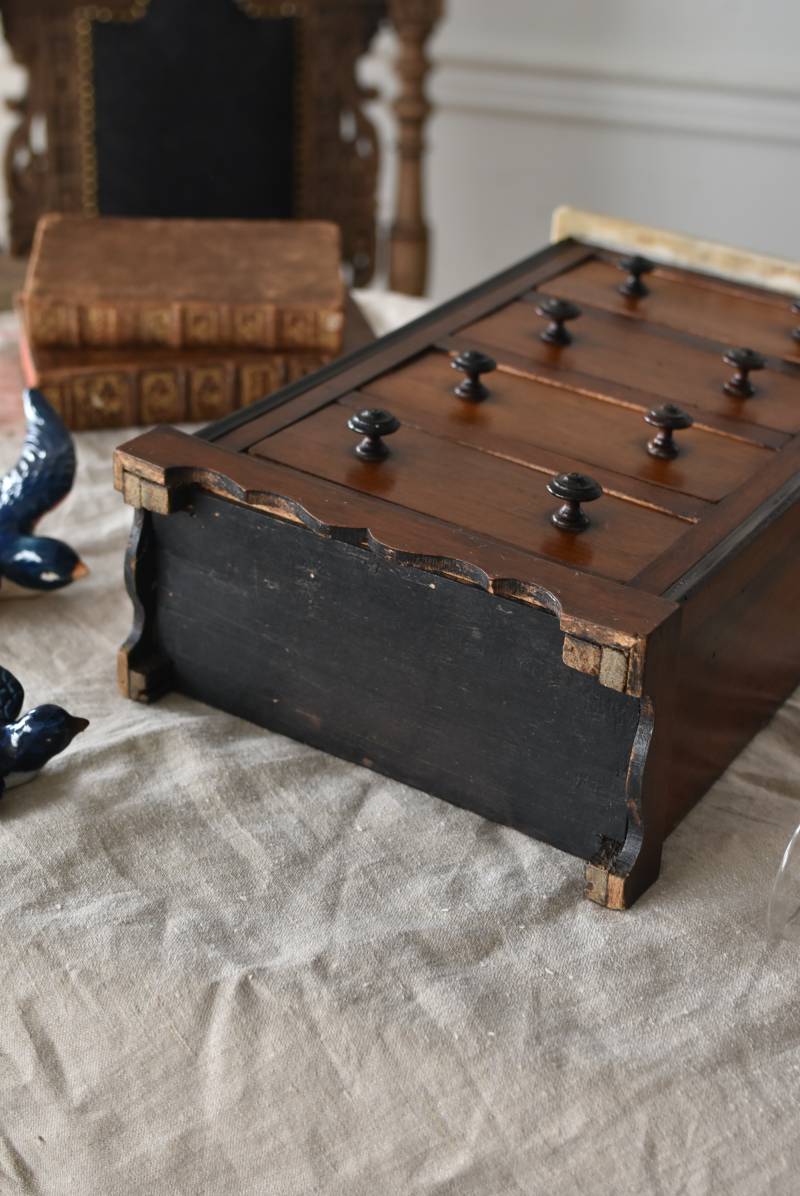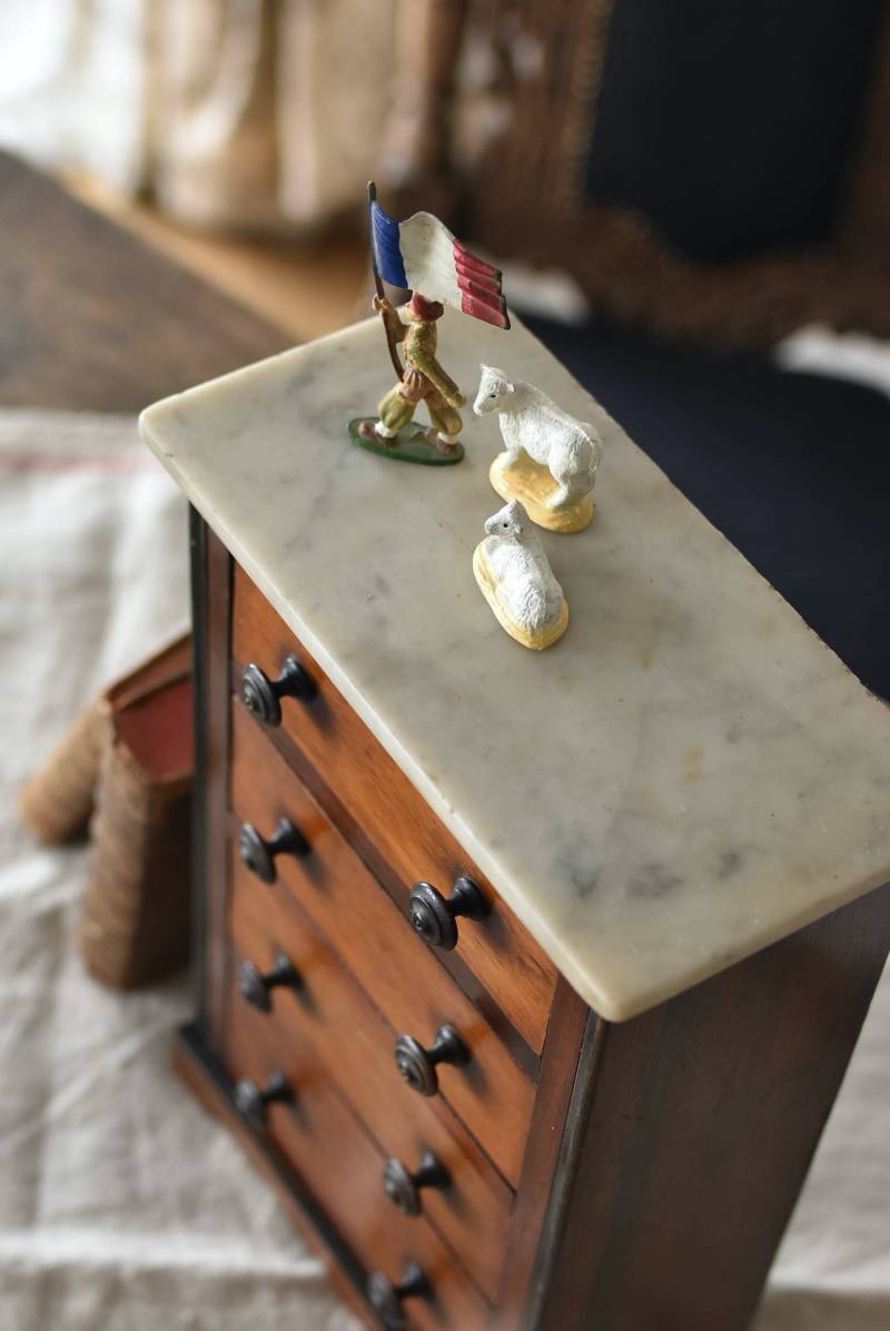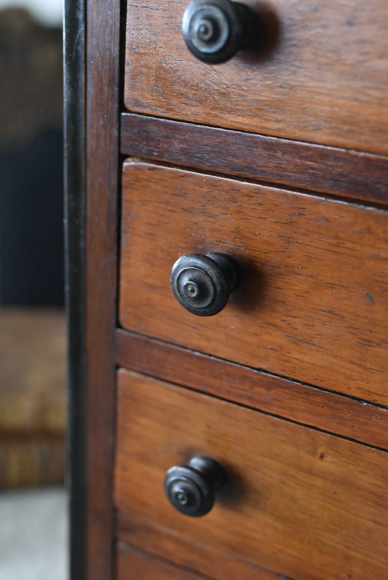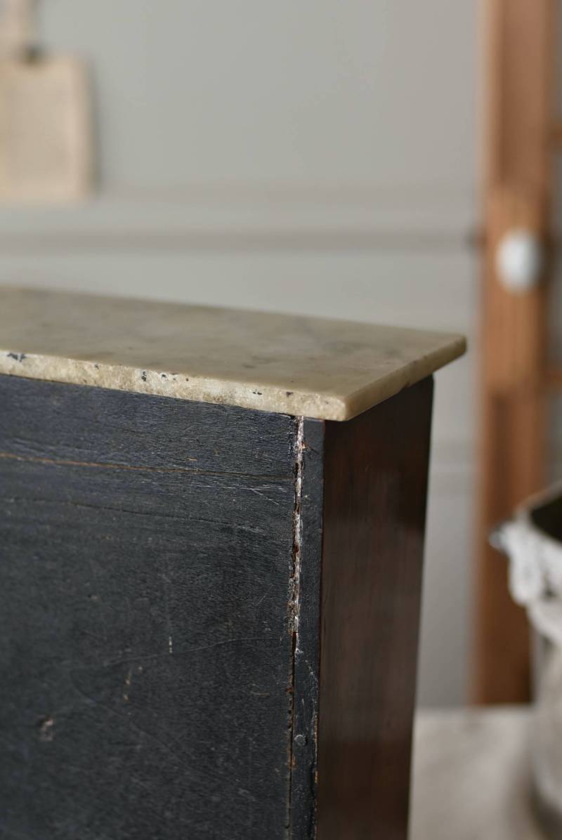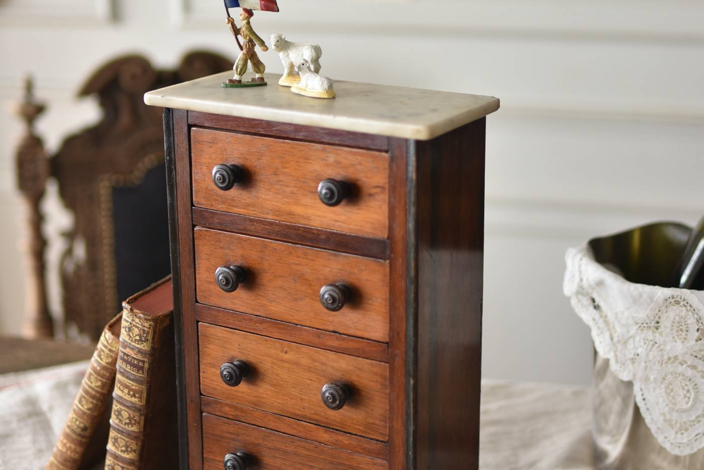 フランスの4段ミニチェスト。 トップにホワイトを基調としたマーブルストーン(大理石)があしらわれた小さいながらも高級感漂う佇まい。ブラウンカラーのボディにブラックカラーの木取手があしらわれたシックな姿で、天板とのコントラストが効いたかっこいい印象のデザインとなっています。小さな引き出しは4つ設けられており、細かなものを仕分けて収納できる機能的な一面も。 落ち着いた色味でまとまったクラシカルな装いで卓上ディスプレイをより素敵に演出してくれるアイテムです。 W 約21.5cm D 約11cm H 約32.7cm 引き出し内寸 W約14cm×D約6.2cm×H約4cm