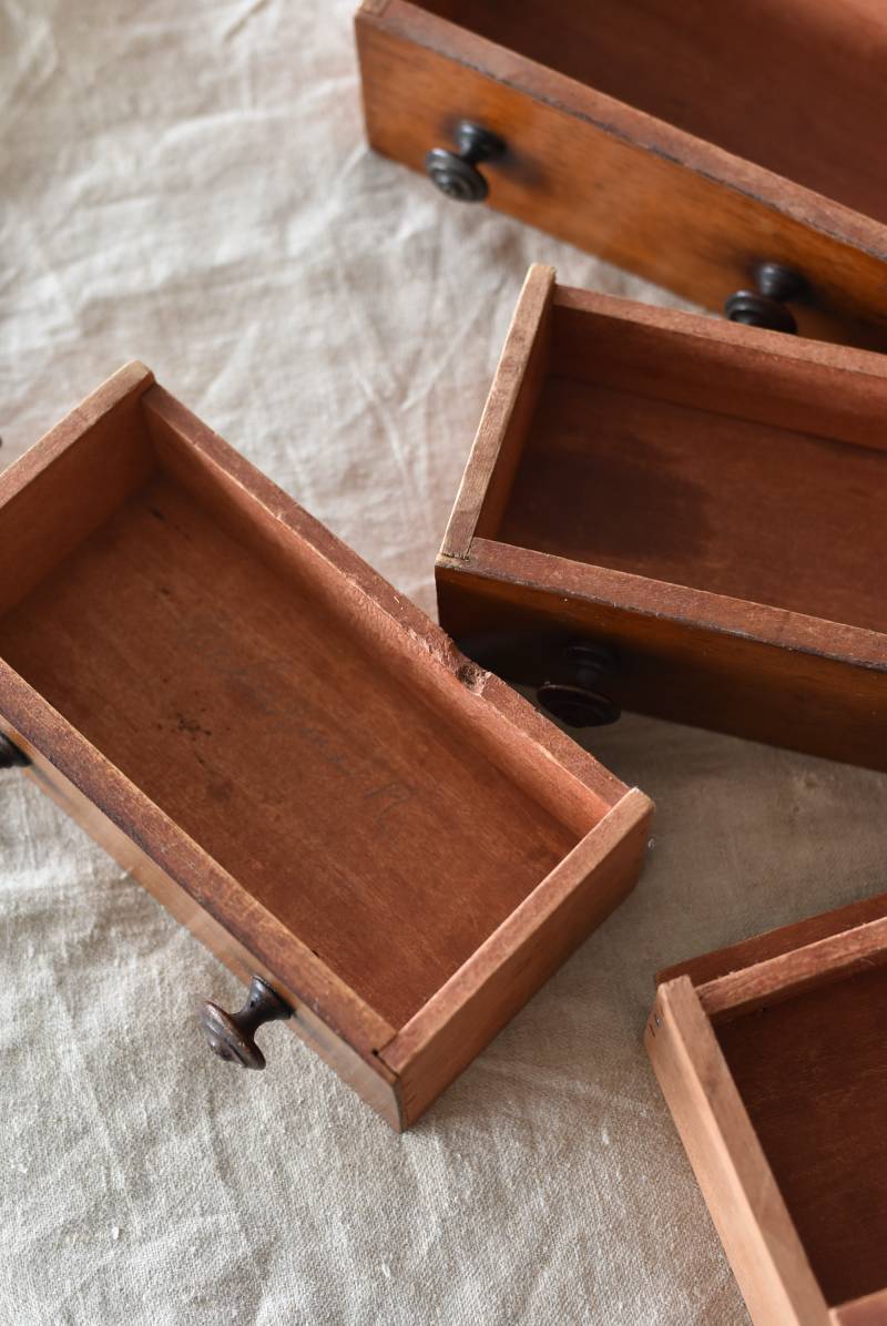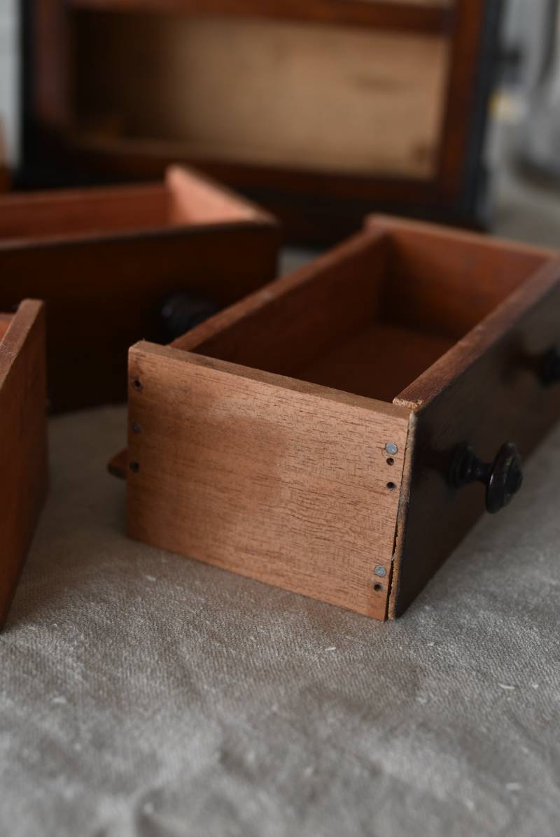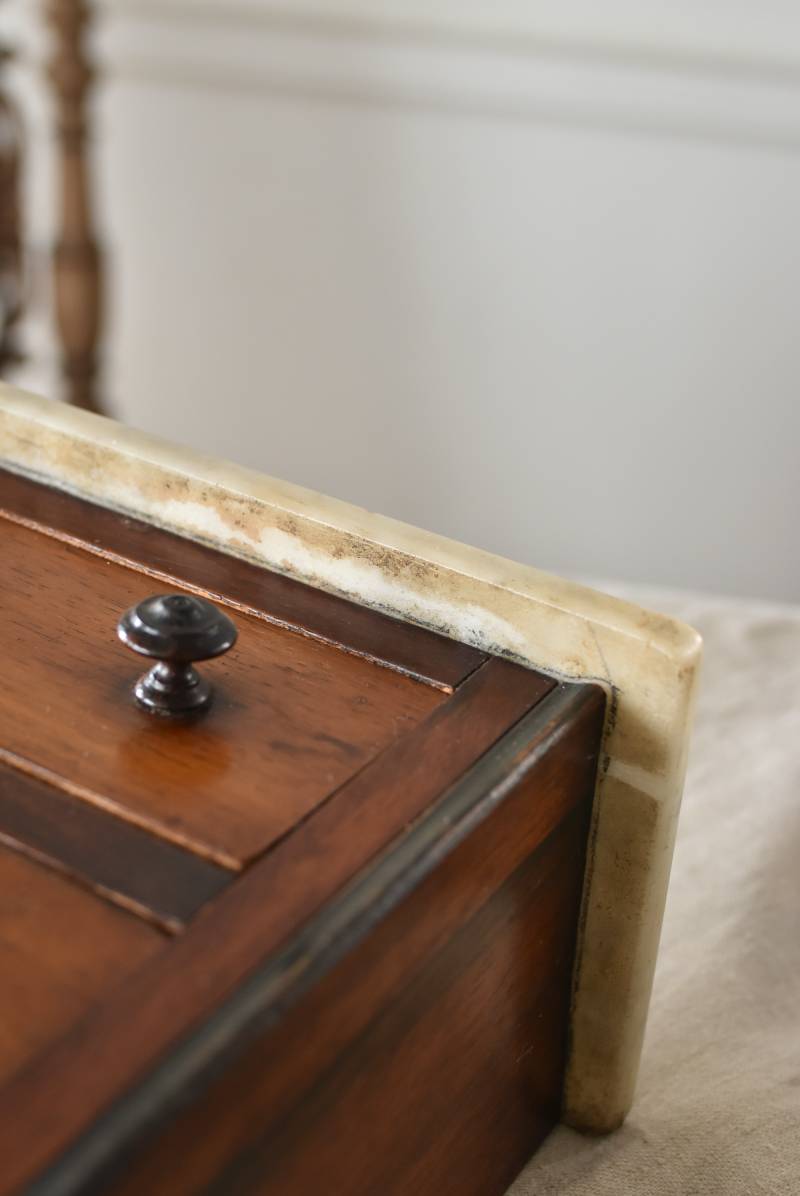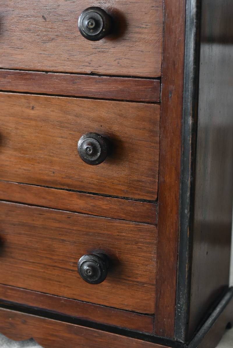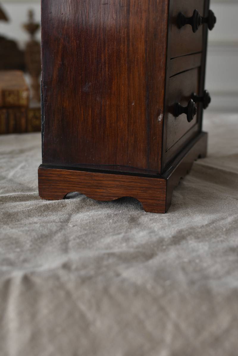 フランスの4段ミニチェスト。 トップにホワイトを基調としたマーブルストーン(大理石)があしらわれた小さいながらも高級感漂う佇まい。ブラウンカラーのボディにブラックカラーの木取手があしらわれたシックな姿で、天板とのコントラストが効いたかっこいい印象のデザインとなっています。小さな引き出しは4つ設けられており、細かなものを仕分けて収納できる機能的な一面も。 落ち着いた色味でまとまったクラシカルな装いで卓上ディスプレイをより素敵に演出してくれるアイテムです。 W 約21.5cm D 約11cm H 約32.7cm 引き出し内寸 W約14cm×D約6.2cm×H約4cm