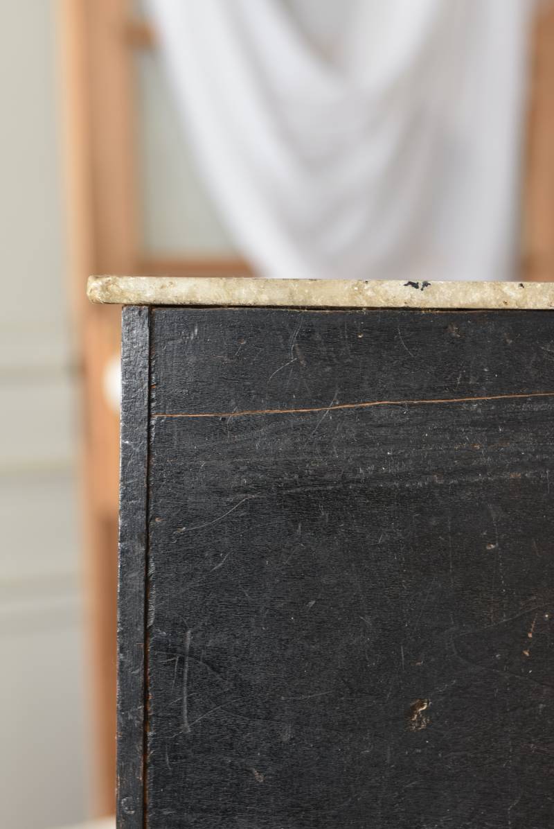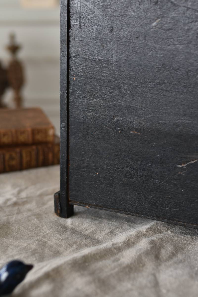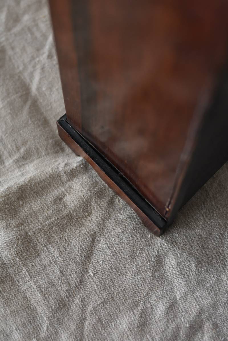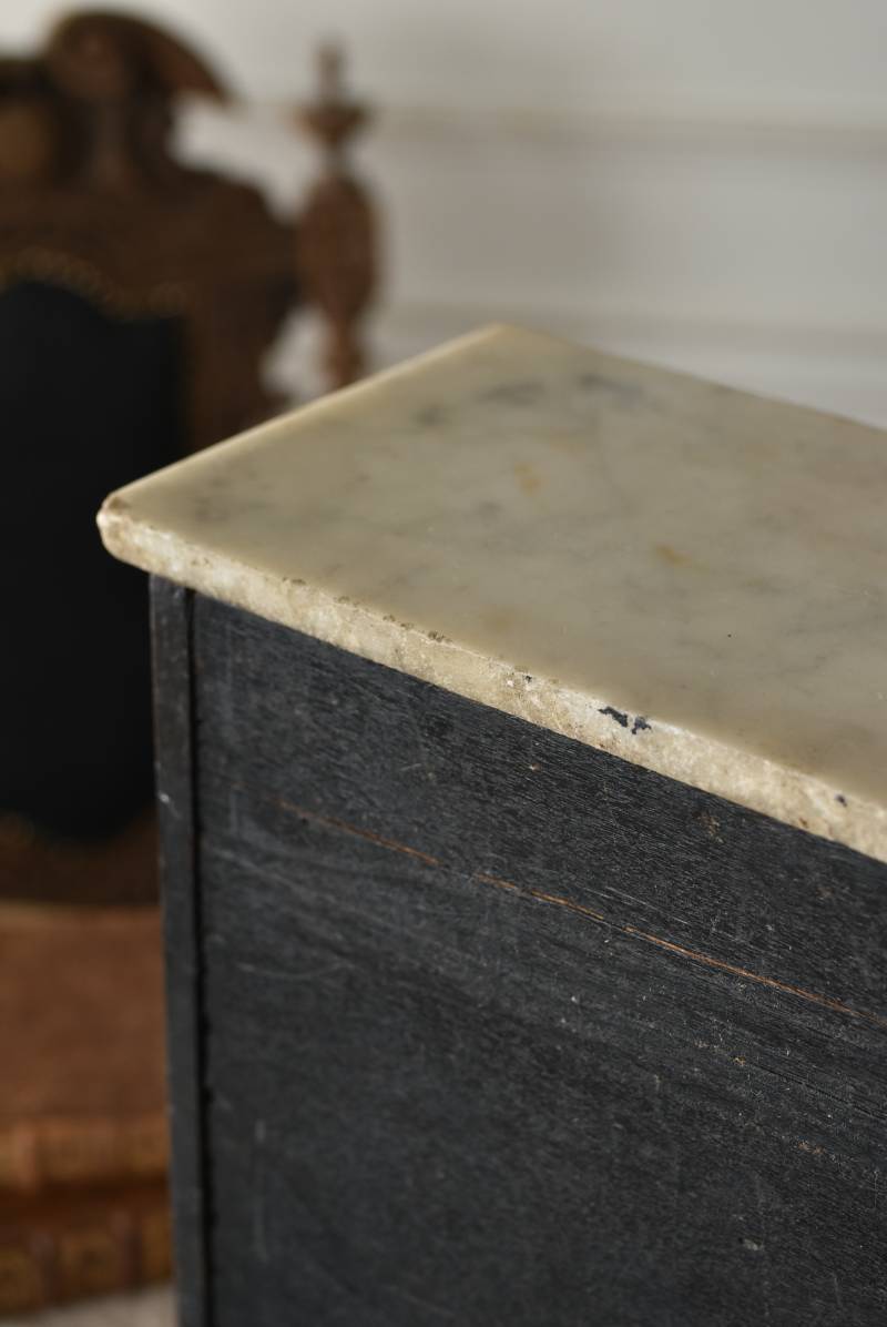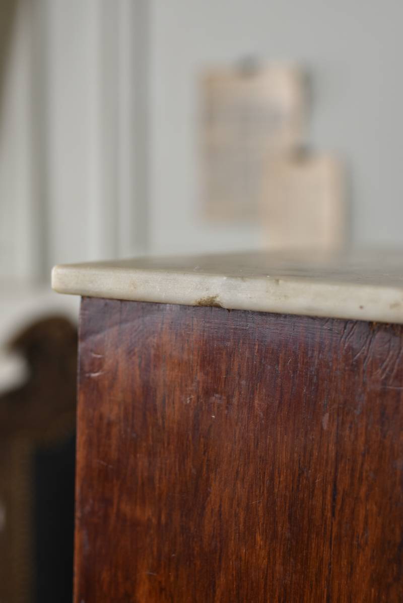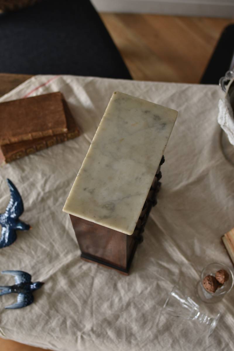 フランスの4段ミニチェスト。 トップにホワイトを基調としたマーブルストーン(大理石)があしらわれた小さいながらも高級感漂う佇まい。ブラウンカラーのボディにブラックカラーの木取手があしらわれたシックな姿で、天板とのコントラストが効いたかっこいい印象のデザインとなっています。小さな引き出しは4つ設けられており、細かなものを仕分けて収納できる機能的な一面も。 落ち着いた色味でまとまったクラシカルな装いで卓上ディスプレイをより素敵に演出してくれるアイテムです。 W 約21.5cm D 約11cm H 約32.7cm 引き出し内寸 W約14cm×D約6.2cm×H約4cm