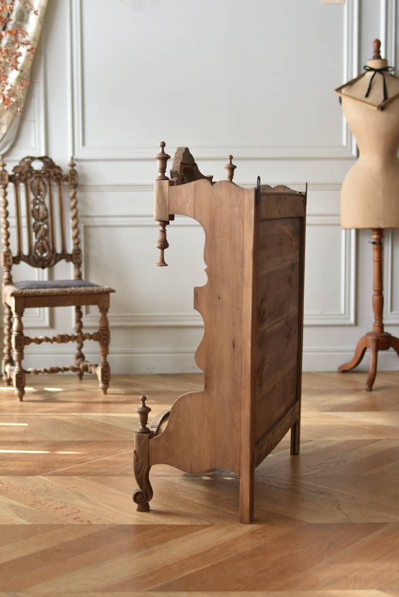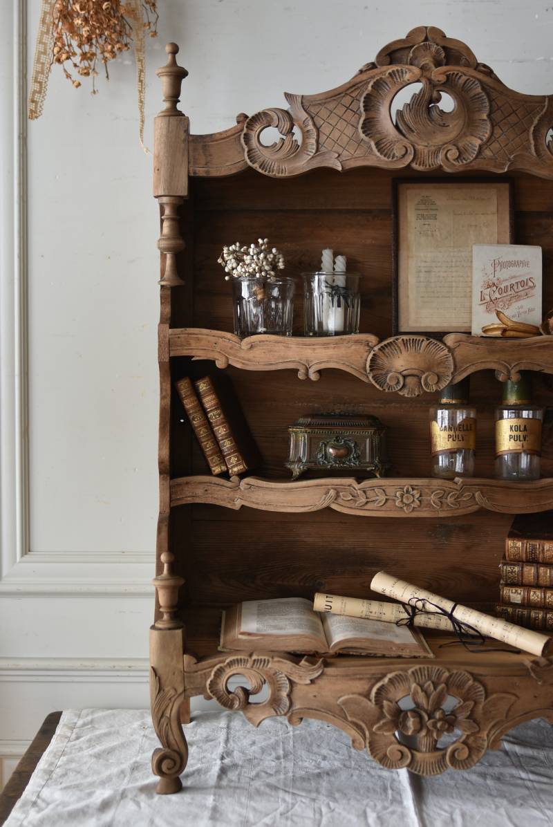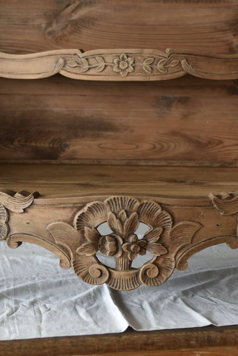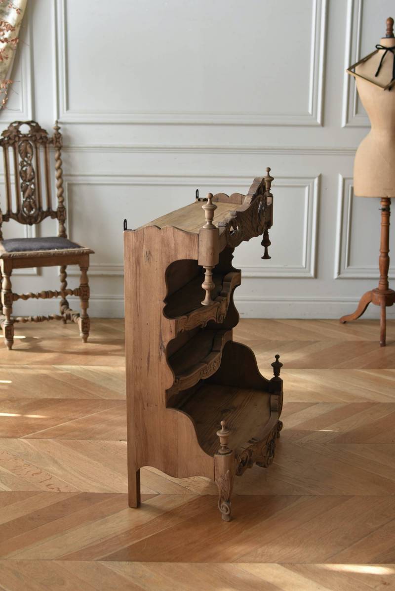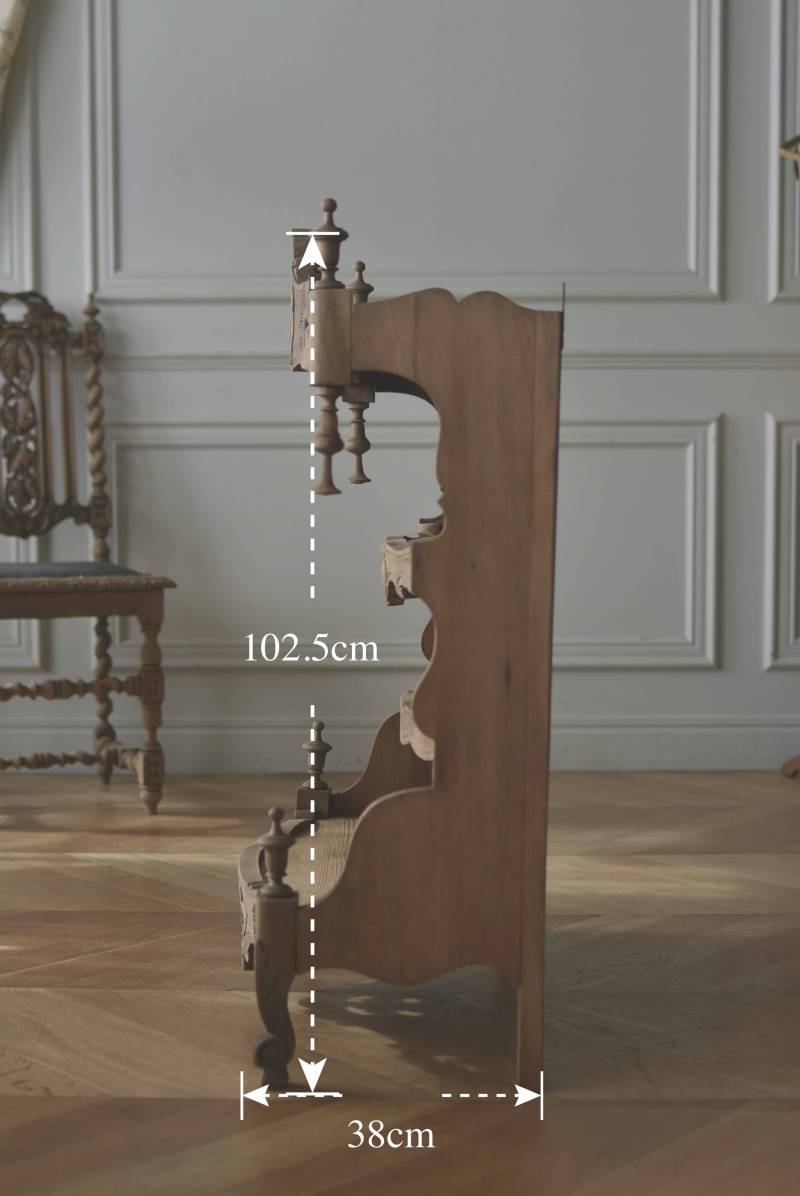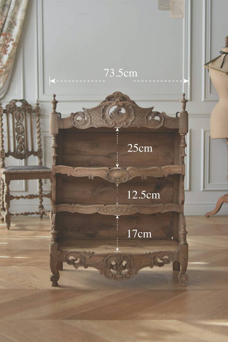 見目麗しいフランスのアンティークシェルフ。 剥離された木肌独自の色味と素朴な質感に温かみを感じられ、長い時をゆっくりと刻んだ趣豊かな風合いが深みのある佇まい。シェルや植物などの自然をモチーフとしたロカイユ装飾がふんだんにあしらわれた優雅な姿で、パッと目を惹くデコラティブなデザインです。それぞれ奥行きが異なる棚板が設けられており、上段には細かなものを、下段にはちょっぴり大きめのものを置いてみたりなどディスプレイをしっかりと楽しめそう。 ボディのしなやかな曲線と隅々までこだわった装飾性の高さが魅力で、置いておくだけでも絵になる芸術的なアイテムです。 W 約73.5cm D 約38cm H 約102.5cm 棚板間隔(上から) 約25cm/約12.5cm/約17cm 搬入経路について こちらの商品の配送について