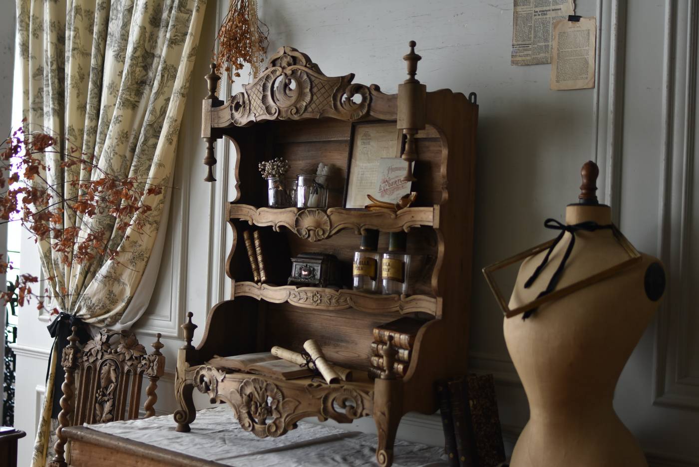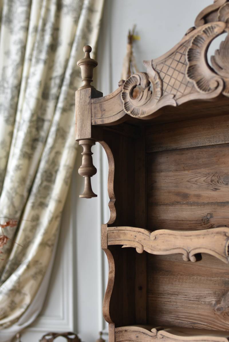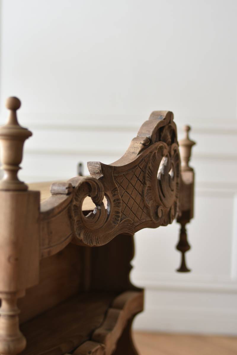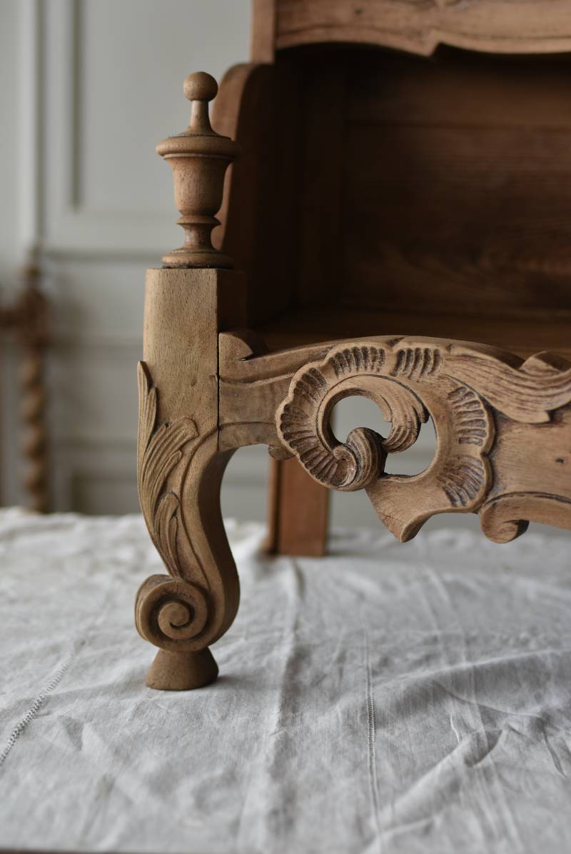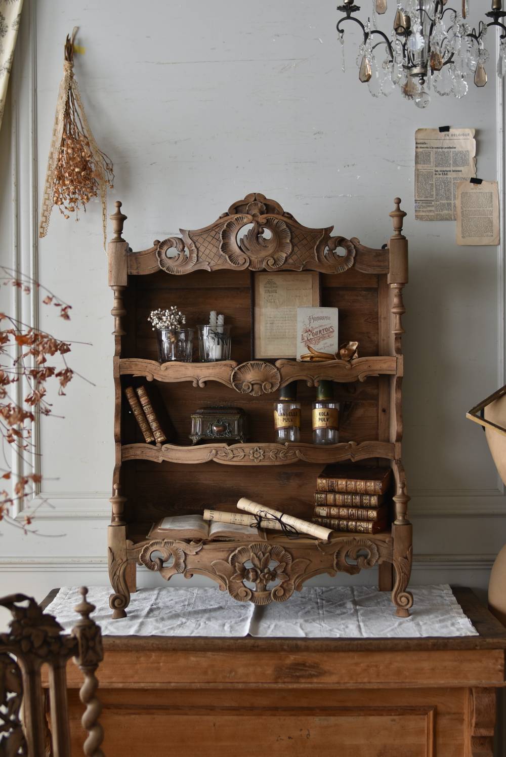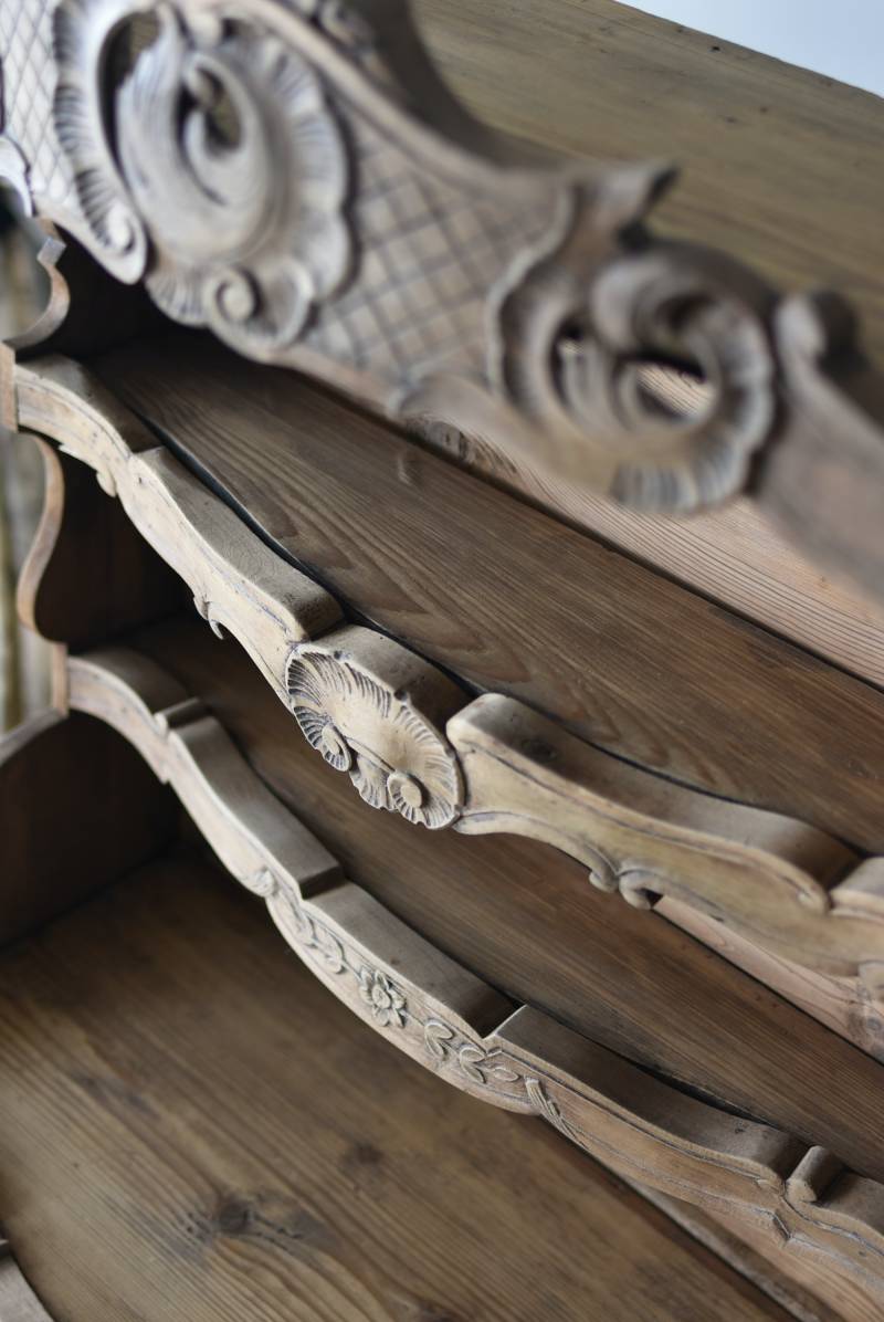 見目麗しいフランスのアンティークシェルフ。 剥離された木肌独自の色味と素朴な質感に温かみを感じられ、長い時をゆっくりと刻んだ趣豊かな風合いが深みのある佇まい。シェルや植物などの自然をモチーフとしたロカイユ装飾がふんだんにあしらわれた優雅な姿で、パッと目を惹くデコラティブなデザインです。それぞれ奥行きが異なる棚板が設けられており、上段には細かなものを、下段にはちょっぴり大きめのものを置いてみたりなどディスプレイをしっかりと楽しめそう。 ボディのしなやかな曲線と隅々までこだわった装飾性の高さが魅力で、置いておくだけでも絵になる芸術的なアイテムです。 W 約73.5cm D 約38cm H 約102.5cm 棚板間隔(上から) 約25cm/約12.5cm/約17cm 搬入経路について こちらの商品の配送について
