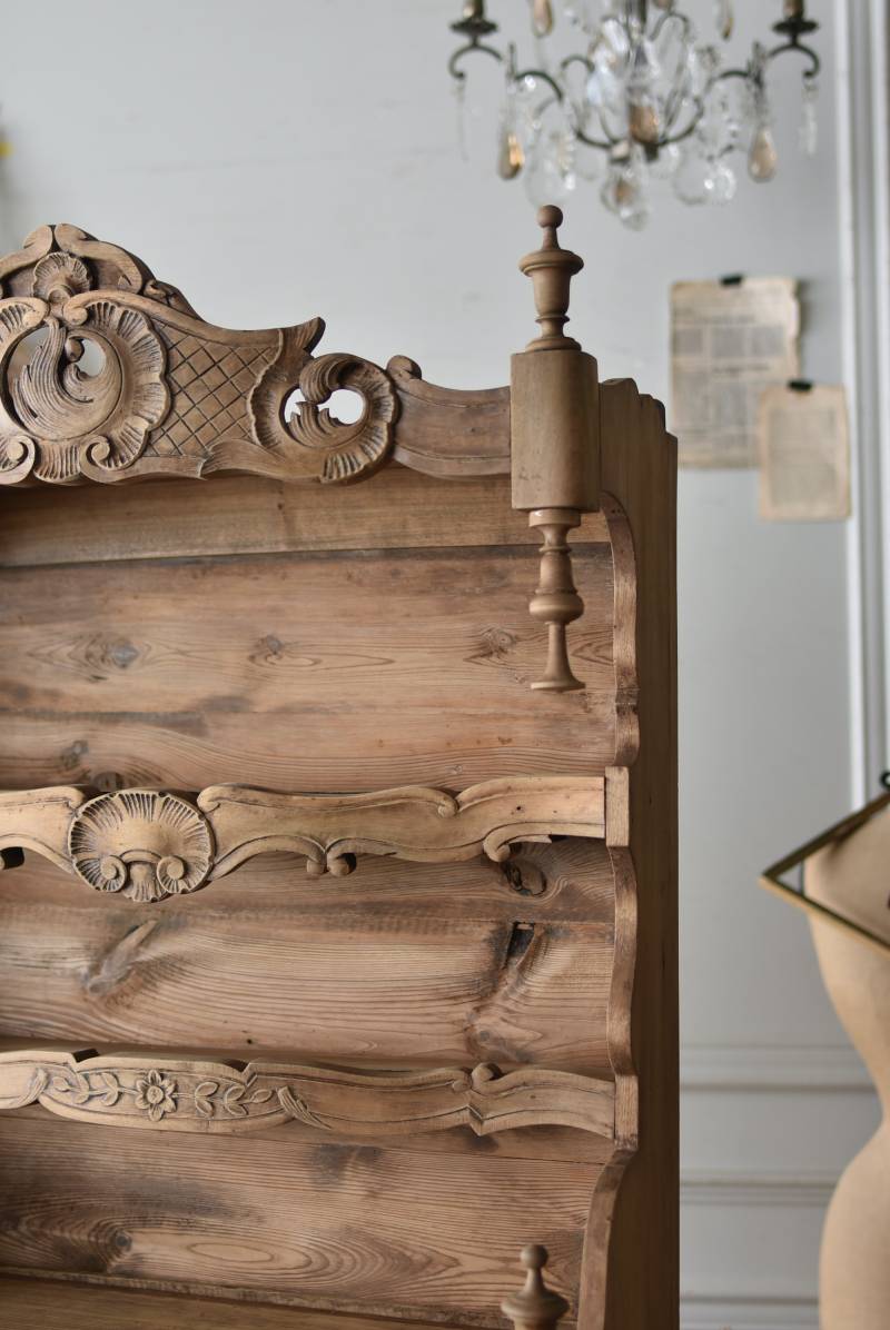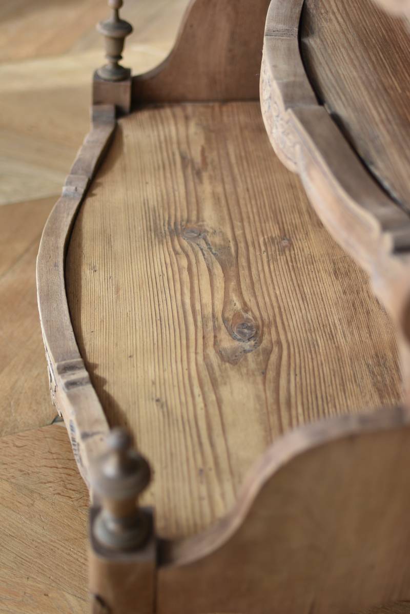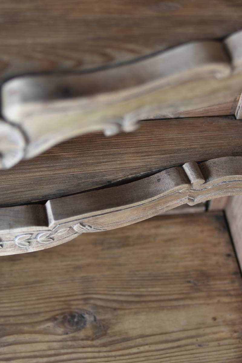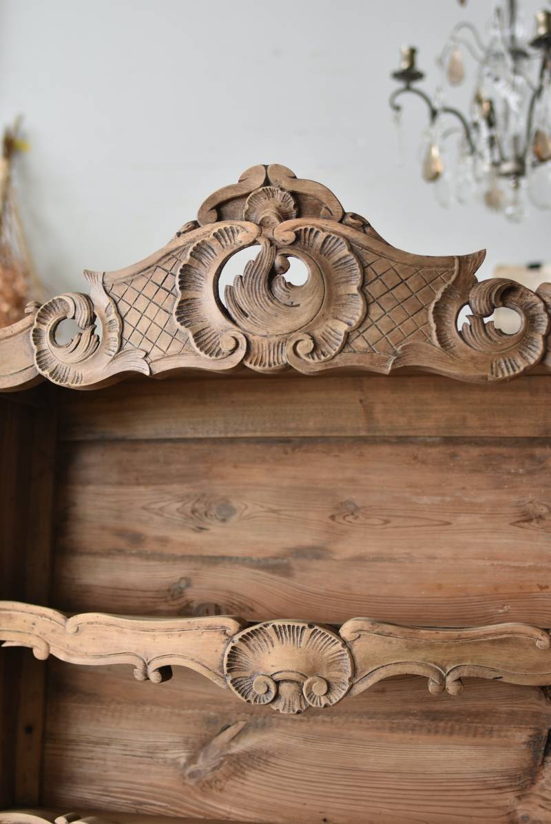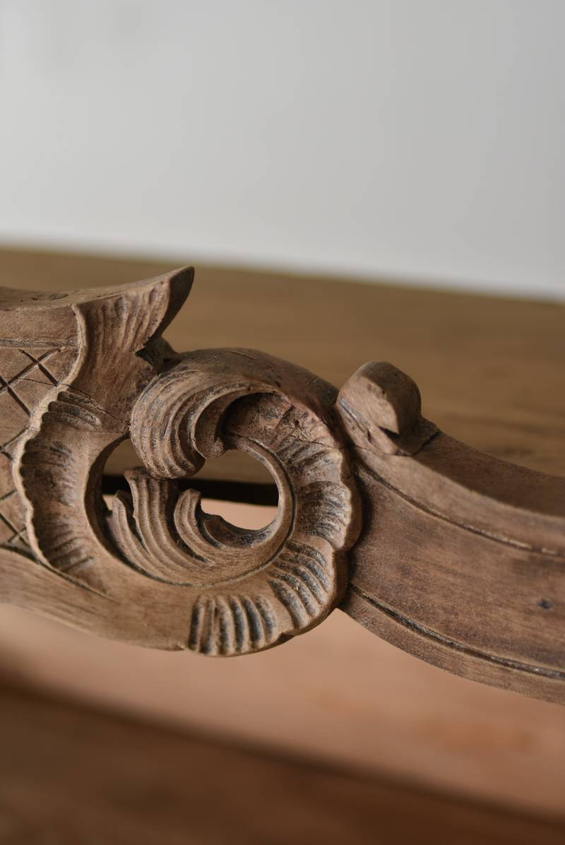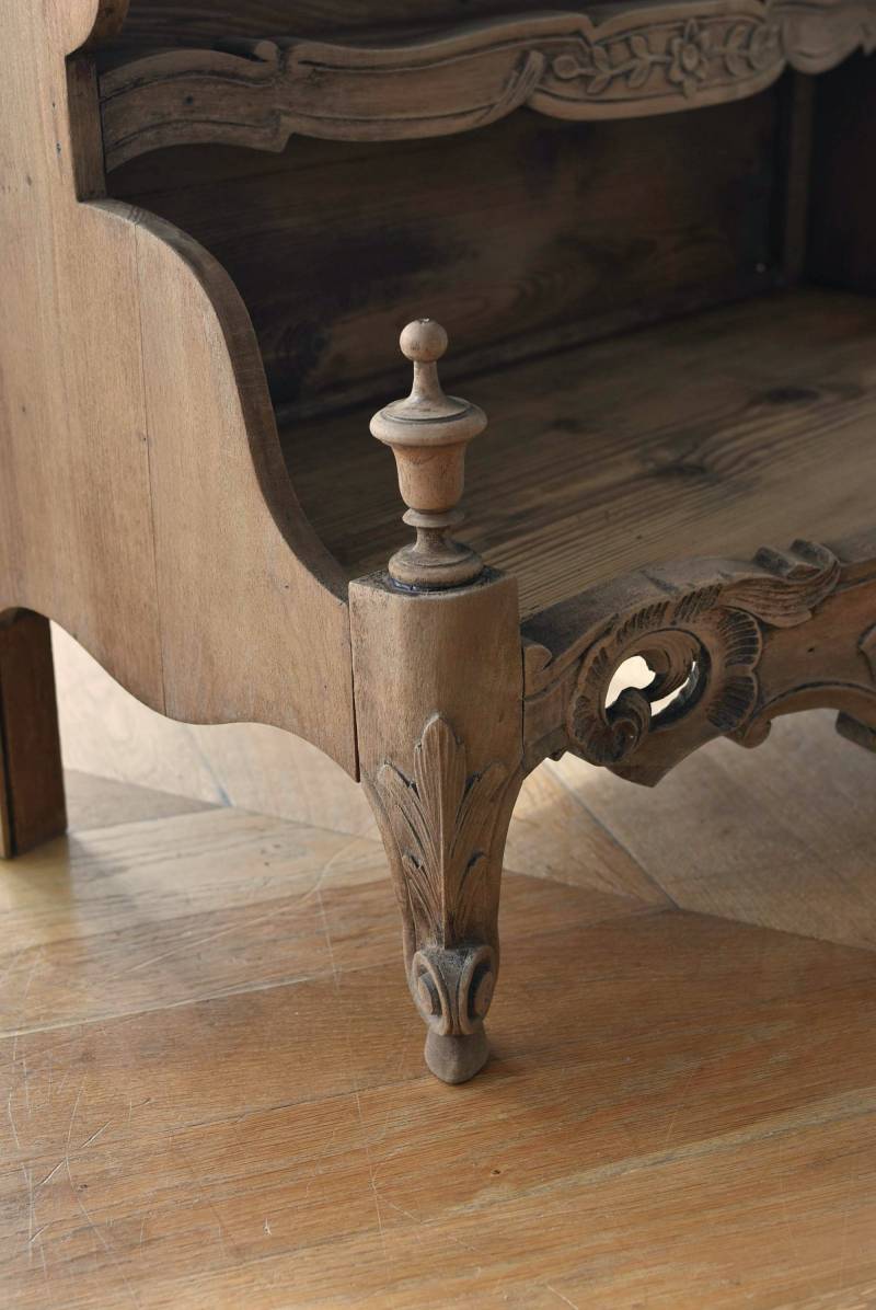 見目麗しいフランスのアンティークシェルフ。 剥離された木肌独自の色味と素朴な質感に温かみを感じられ、長い時をゆっくりと刻んだ趣豊かな風合いが深みのある佇まい。シェルや植物などの自然をモチーフとしたロカイユ装飾がふんだんにあしらわれた優雅な姿で、パッと目を惹くデコラティブなデザインです。それぞれ奥行きが異なる棚板が設けられており、上段には細かなものを、下段にはちょっぴり大きめのものを置いてみたりなどディスプレイをしっかりと楽しめそう。 ボディのしなやかな曲線と隅々までこだわった装飾性の高さが魅力で、置いておくだけでも絵になる芸術的なアイテムです。 W 約73.5cm D 約38cm H 約102.5cm 棚板間隔(上から) 約25cm/約12.5cm/約17cm 搬入経路について こちらの商品の配送について