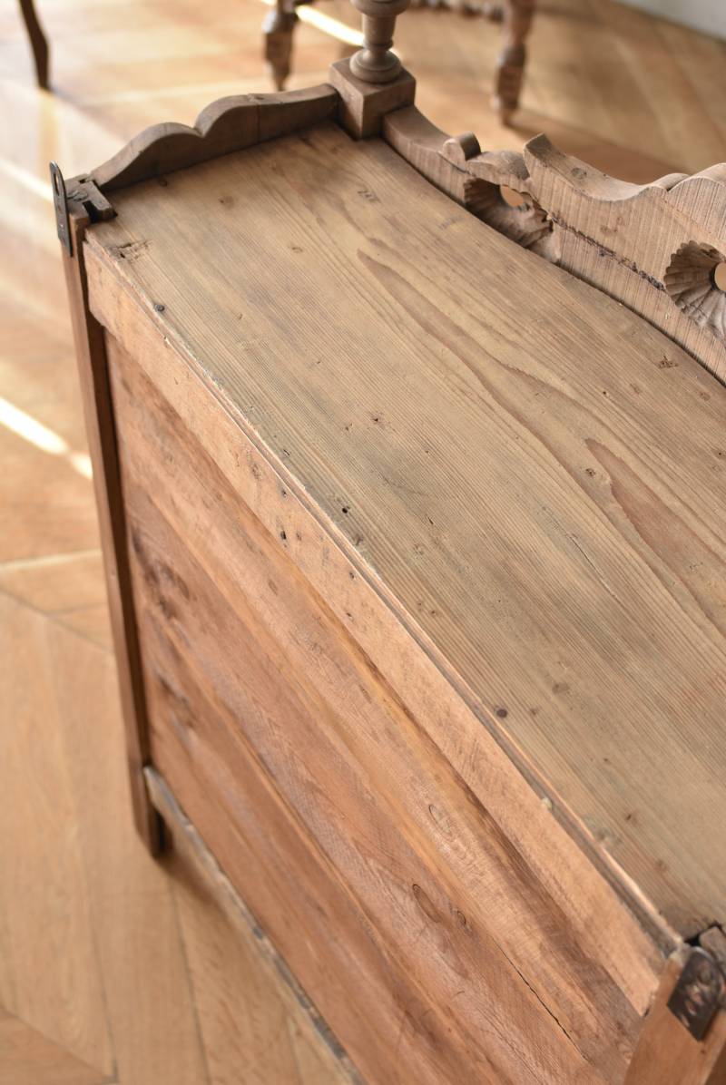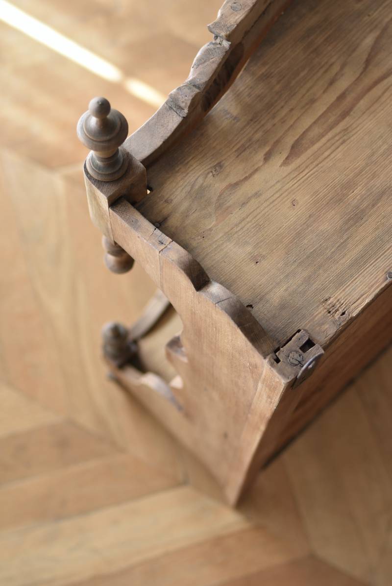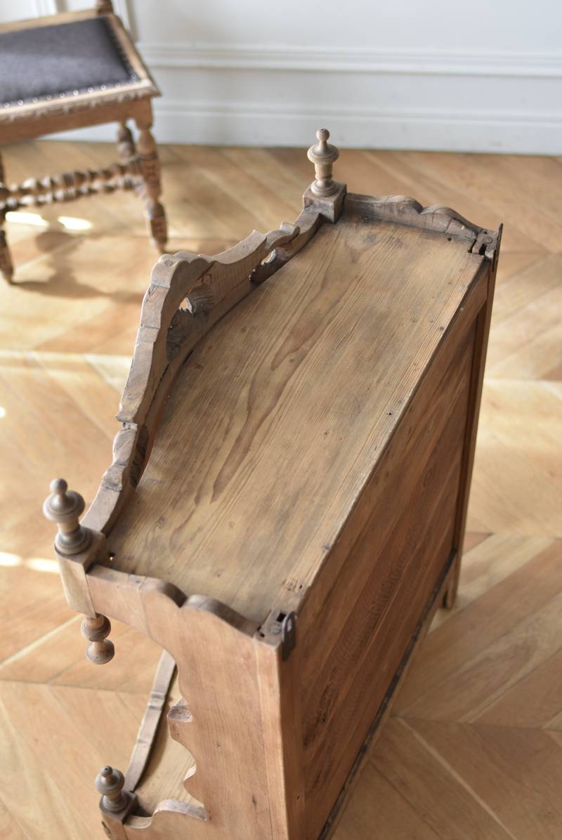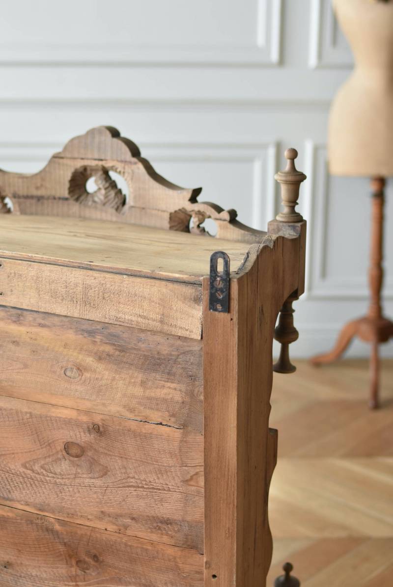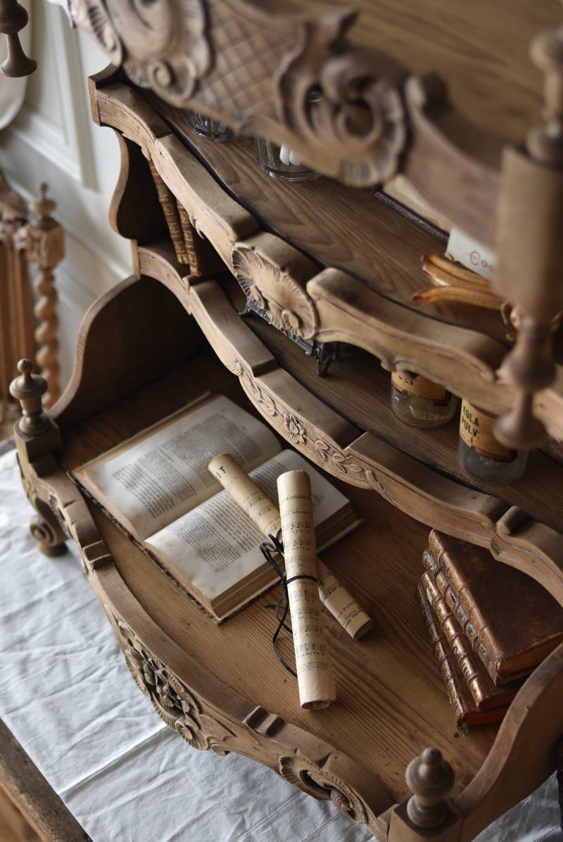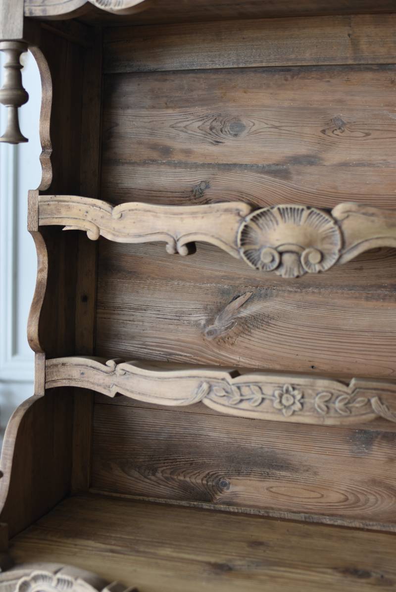 見目麗しいフランスのアンティークシェルフ。 剥離された木肌独自の色味と素朴な質感に温かみを感じられ、長い時をゆっくりと刻んだ趣豊かな風合いが深みのある佇まい。シェルや植物などの自然をモチーフとしたロカイユ装飾がふんだんにあしらわれた優雅な姿で、パッと目を惹くデコラティブなデザインです。それぞれ奥行きが異なる棚板が設けられており、上段には細かなものを、下段にはちょっぴり大きめのものを置いてみたりなどディスプレイをしっかりと楽しめそう。 ボディのしなやかな曲線と隅々までこだわった装飾性の高さが魅力で、置いておくだけでも絵になる芸術的なアイテムです。 W 約73.5cm D 約38cm H 約102.5cm 棚板間隔(上から) 約25cm/約12.5cm/約17cm 搬入経路について こちらの商品の配送について
