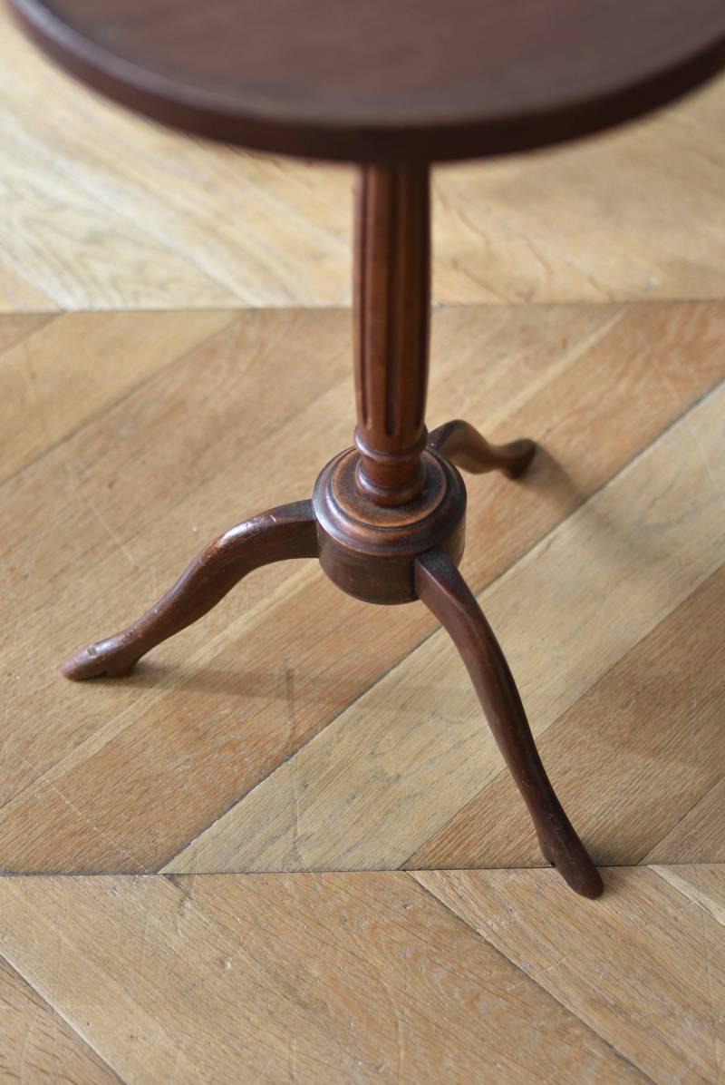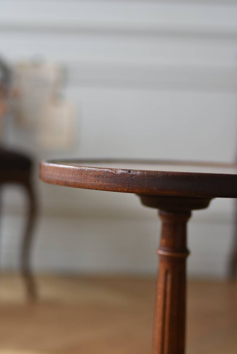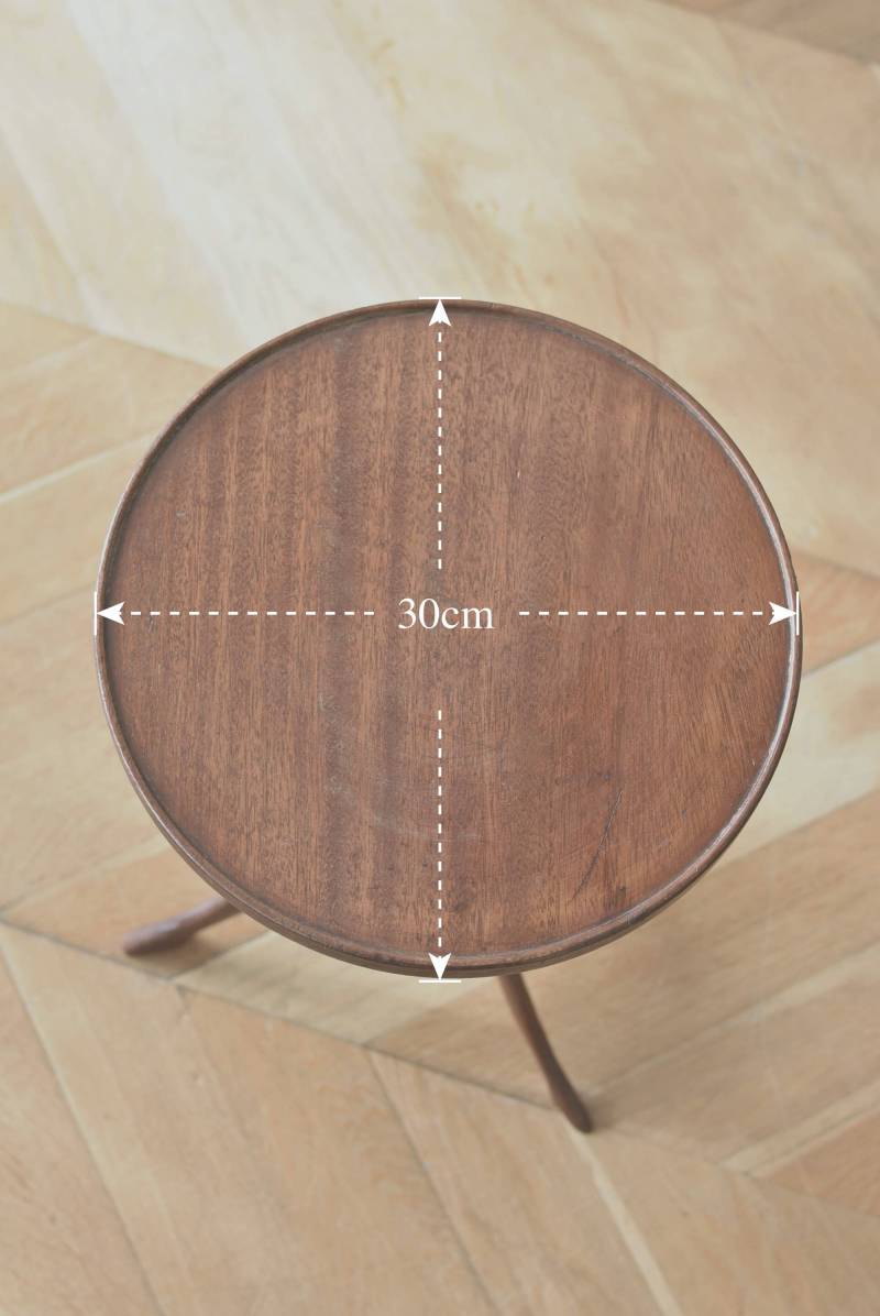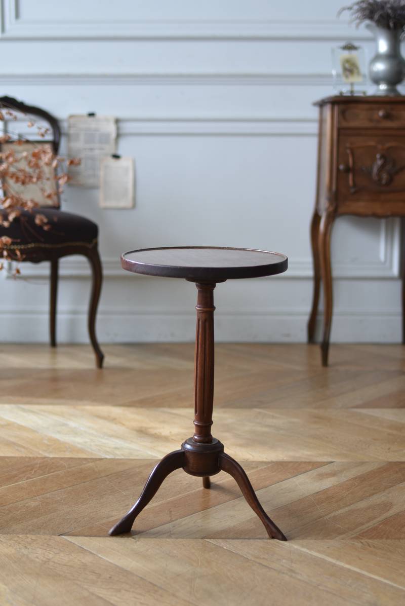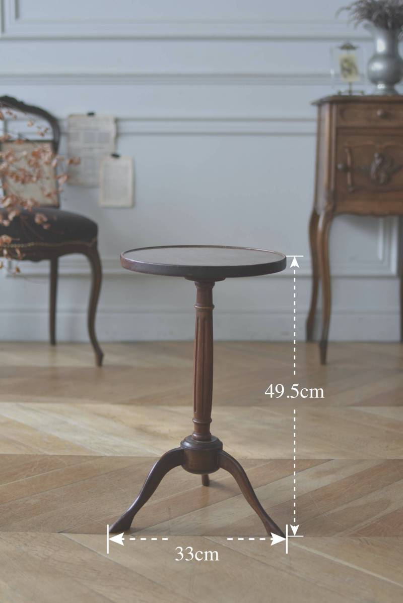 フランス・J & E PEROL製のラウンドサイドテーブル。 上品な艶感のあるこっくりとした木色で、ちょこんとした小ぶりなサイズ感が可愛らしい佇まい。ラウンド型の天板にぷくっと膨らみのある支柱ライン、そしてヒールを履いているかのような脚先のデザインが個性のある姿となっています。天板裏には"J. et E. PEROL"と刻印されたブロンズ製のタグが付けられています。 比較的軽量で女性一人でも持ち運びができるので模様替えもしやすく、ソファのサイドに置いてサブテーブルとしてや、花瓶などを飾る小さなディスプレイスペースとしても素敵なアイテムです。 天板直径 約30cm 脚元 約33cm×32cm H 約49.5cm