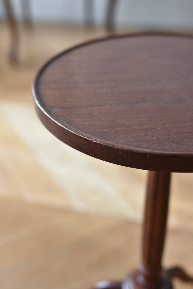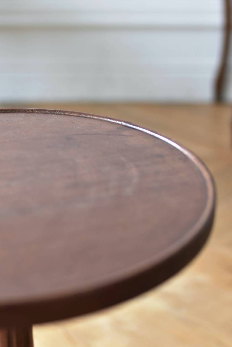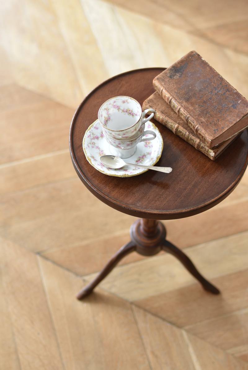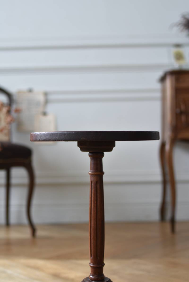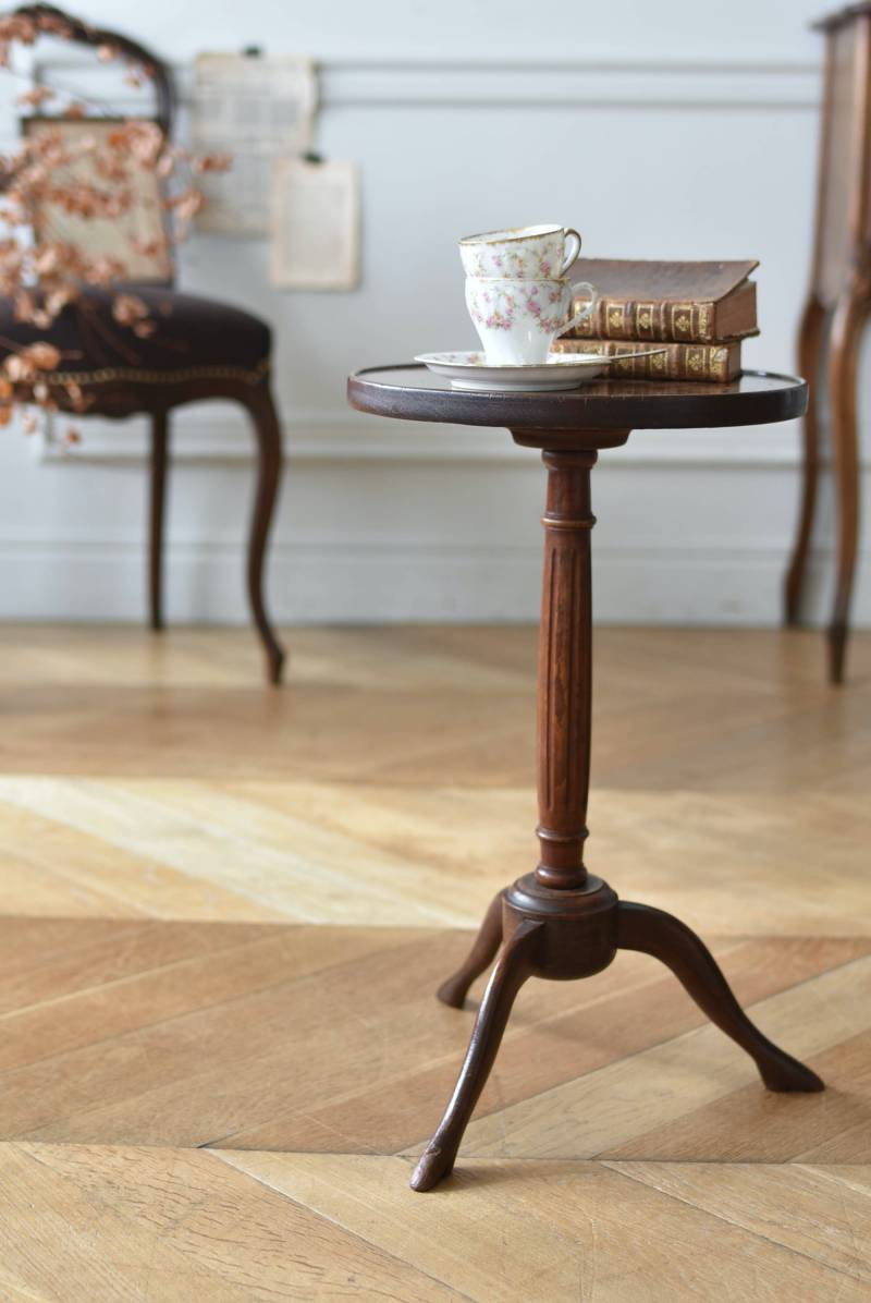 フランス・J & E PEROL製のラウンドサイドテーブル。 上品な艶感のあるこっくりとした木色で、ちょこんとした小ぶりなサイズ感が可愛らしい佇まい。ラウンド型の天板にぷくっと膨らみのある支柱ライン、そしてヒールを履いているかのような脚先のデザインが個性のある姿となっています。天板裏には"J. et E. PEROL"と刻印されたブロンズ製のタグが付けられています。 比較的軽量で女性一人でも持ち運びができるので模様替えもしやすく、ソファのサイドに置いてサブテーブルとしてや、花瓶などを飾る小さなディスプレイスペースとしても素敵なアイテムです。 天板直径 約30cm 脚元 約33cm×32cm H 約49.5cm