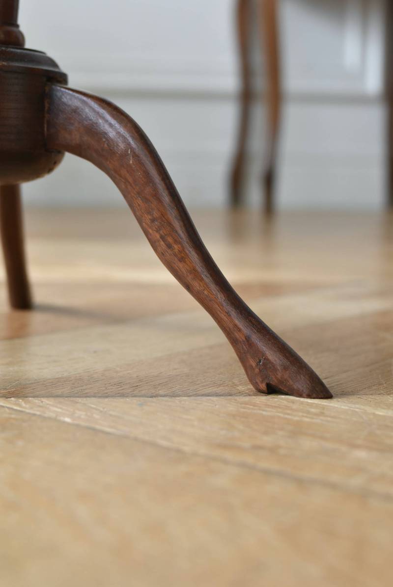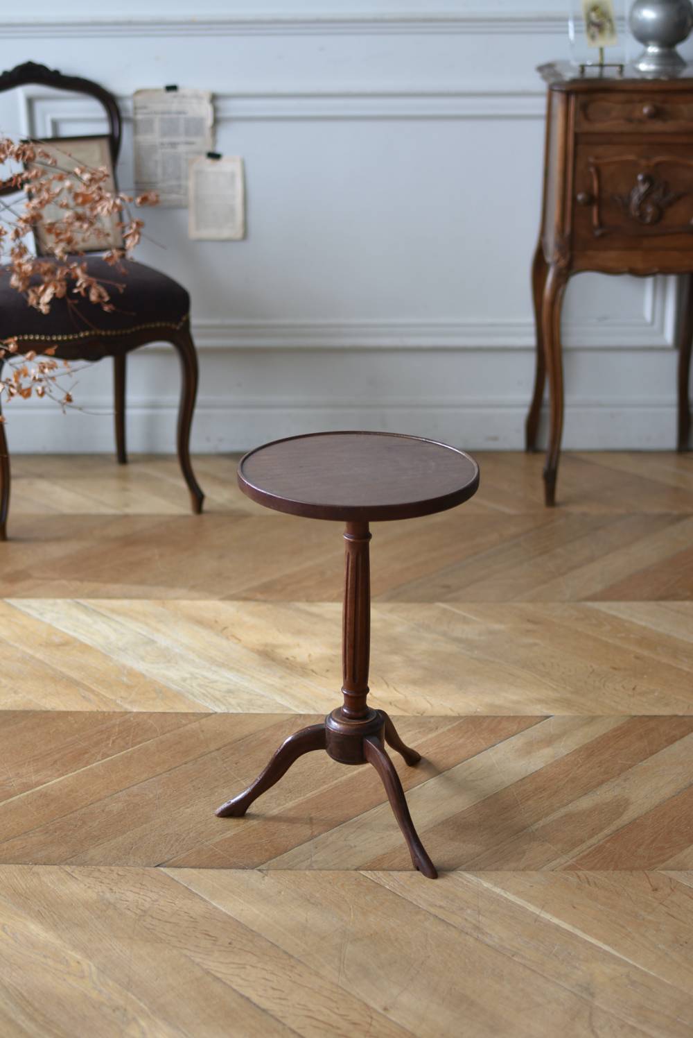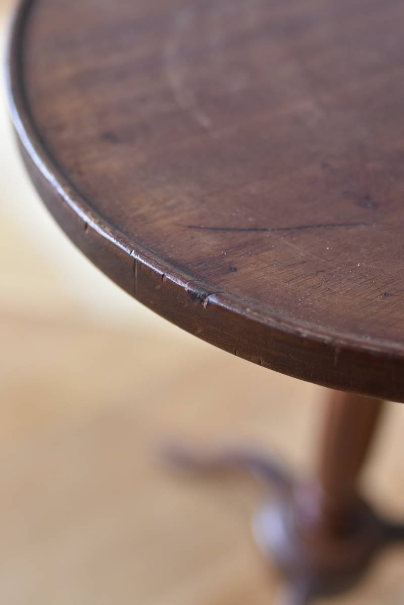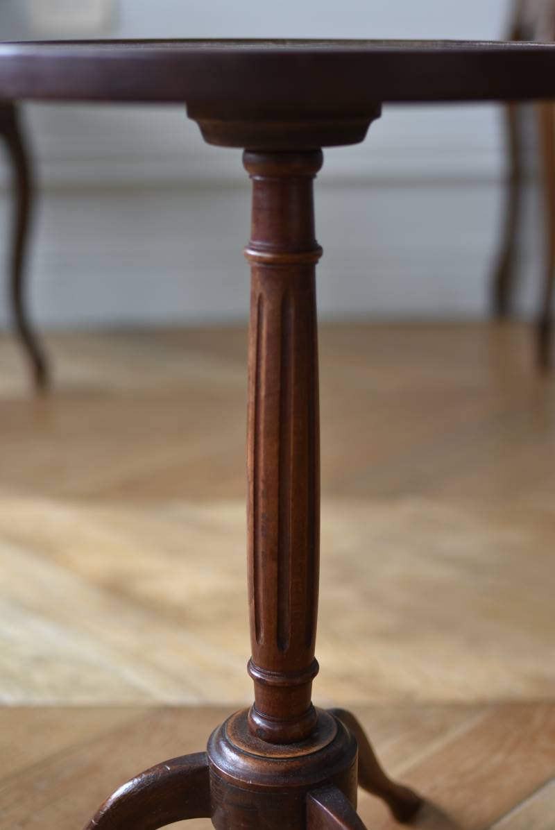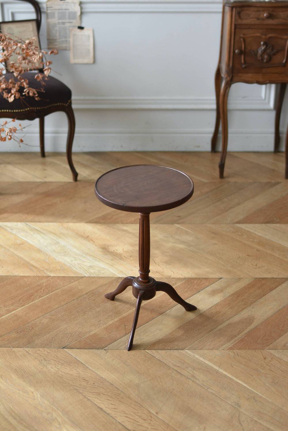 フランス・J & E PEROL製のラウンドサイドテーブル。 上品な艶感のあるこっくりとした木色で、ちょこんとした小ぶりなサイズ感が可愛らしい佇まい。ラウンド型の天板にぷくっと膨らみのある支柱ライン、そしてヒールを履いているかのような脚先のデザインが個性のある姿となっています。天板裏には"J. et E. PEROL"と刻印されたブロンズ製のタグが付けられています。 比較的軽量で女性一人でも持ち運びができるので模様替えもしやすく、ソファのサイドに置いてサブテーブルとしてや、花瓶などを飾る小さなディスプレイスペースとしても素敵なアイテムです。 天板直径 約30cm 脚元 約33cm×32cm H 約49.5cm