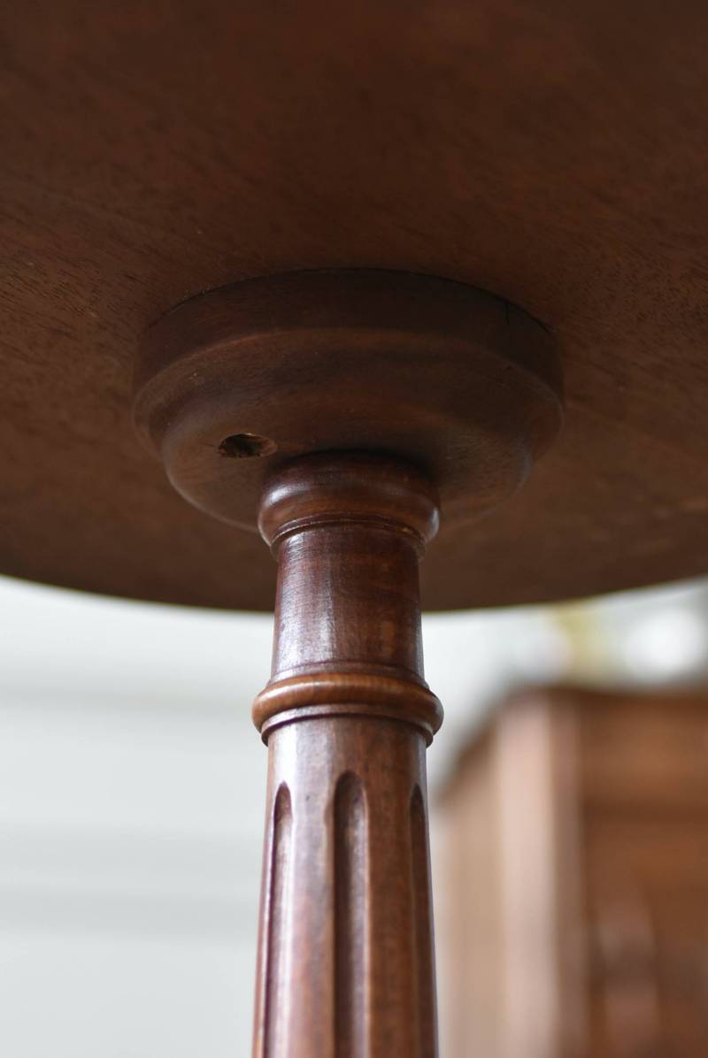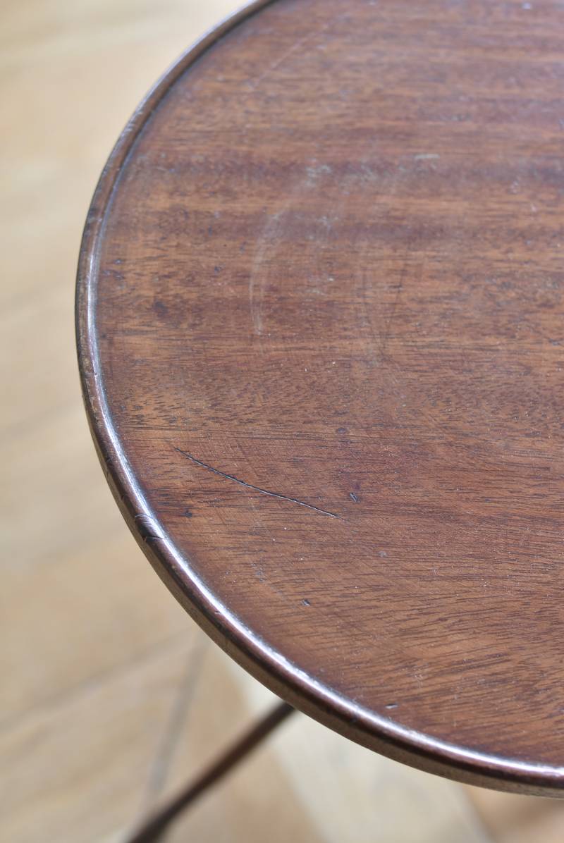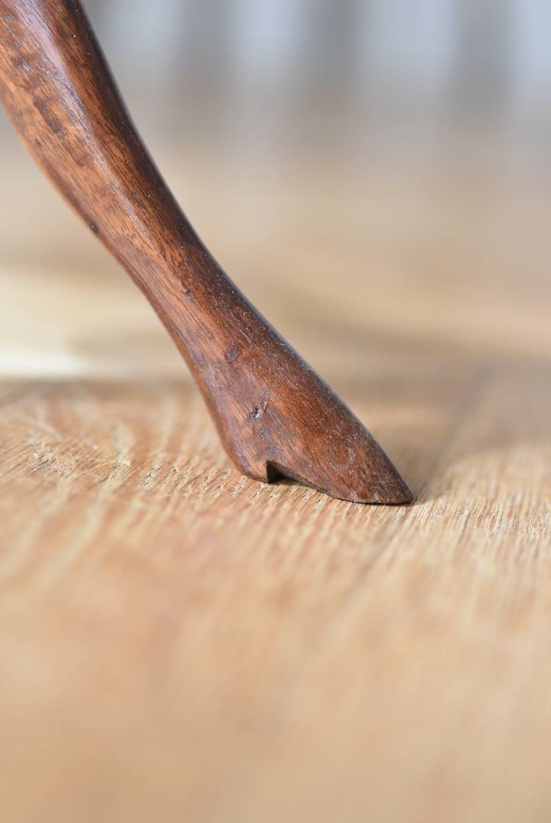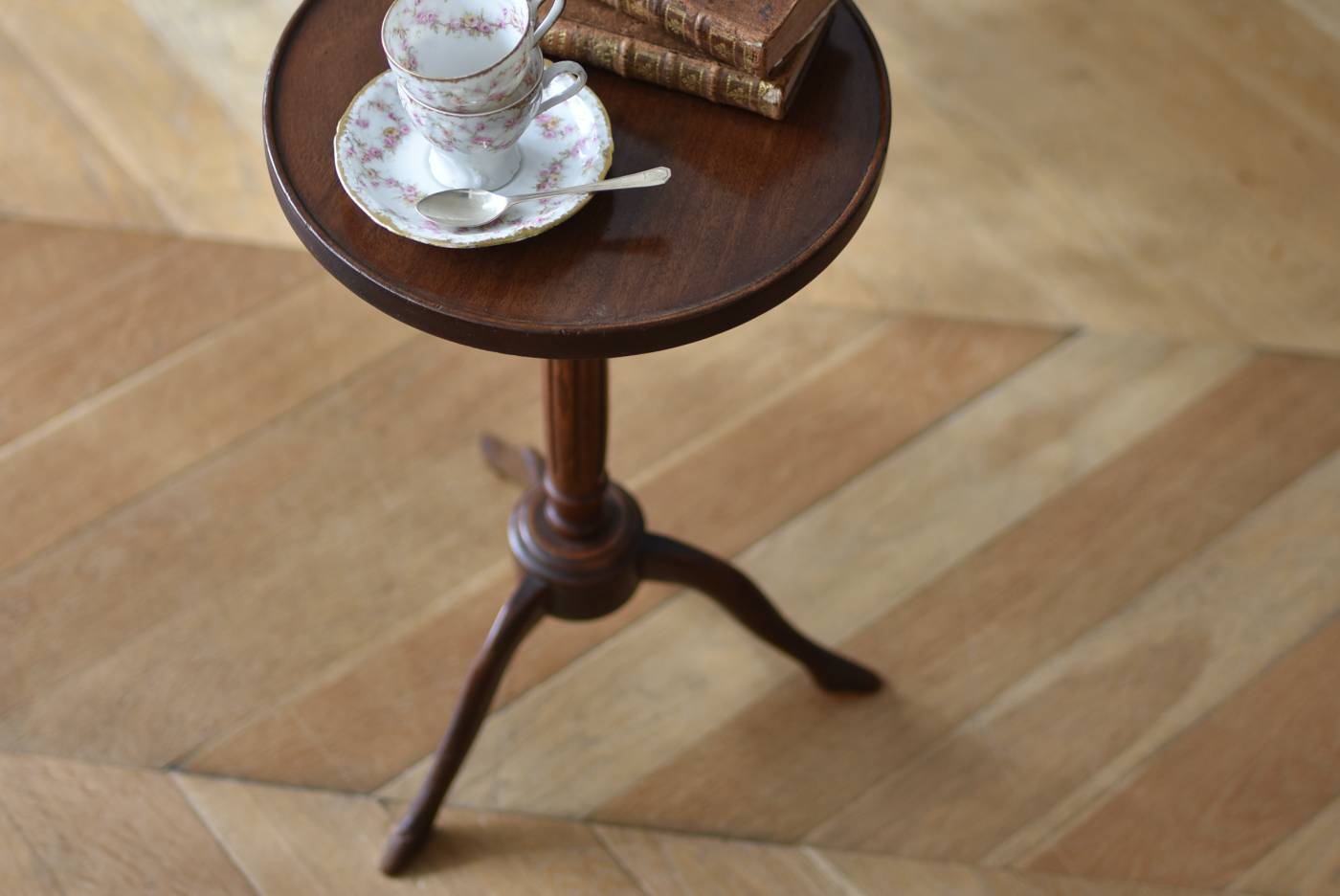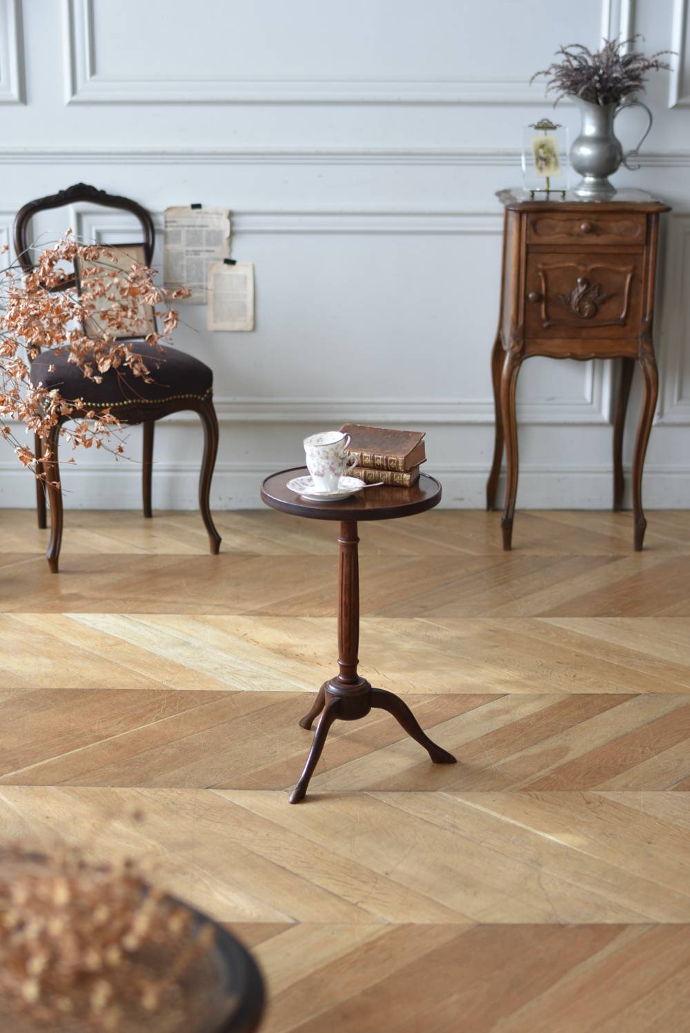 フランス・J & E PEROL製のラウンドサイドテーブル。 上品な艶感のあるこっくりとした木色で、ちょこんとした小ぶりなサイズ感が可愛らしい佇まい。ラウンド型の天板にぷくっと膨らみのある支柱ライン、そしてヒールを履いているかのような脚先のデザインが個性のある姿となっています。天板裏には"J. et E. PEROL"と刻印されたブロンズ製のタグが付けられています。 比較的軽量で女性一人でも持ち運びができるので模様替えもしやすく、ソファのサイドに置いてサブテーブルとしてや、花瓶などを飾る小さなディスプレイスペースとしても素敵なアイテムです。 天板直径 約30cm 脚元 約33cm×32cm H 約49.5cm