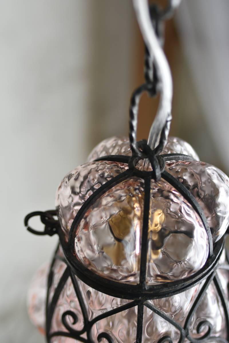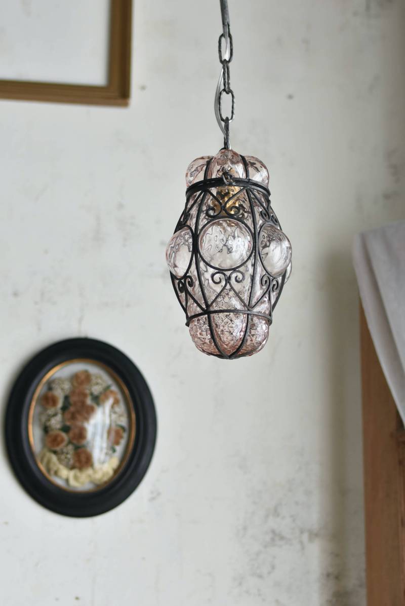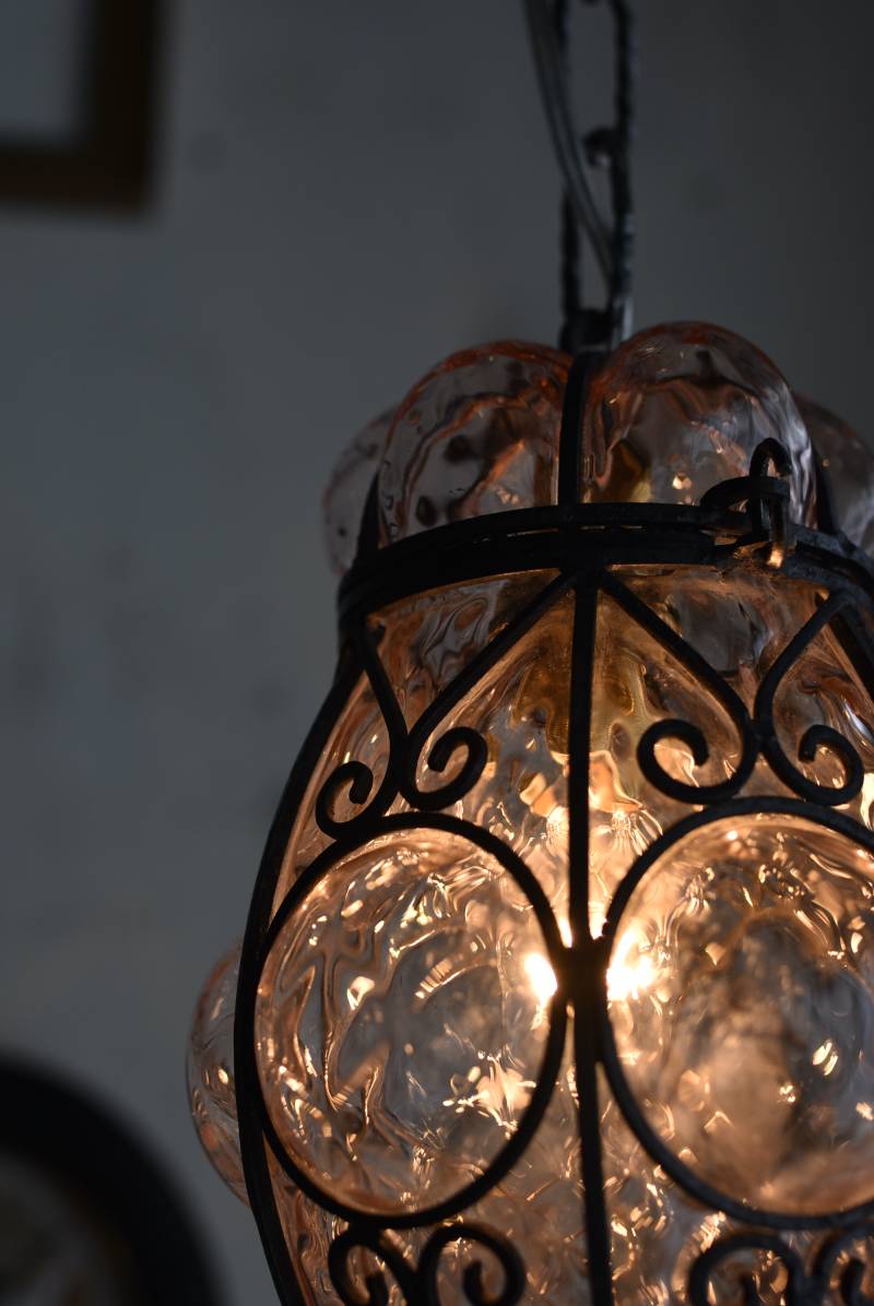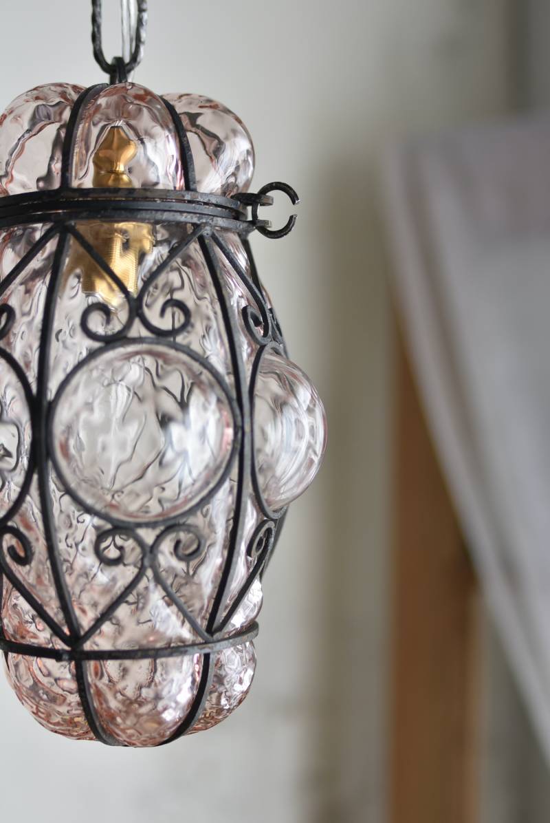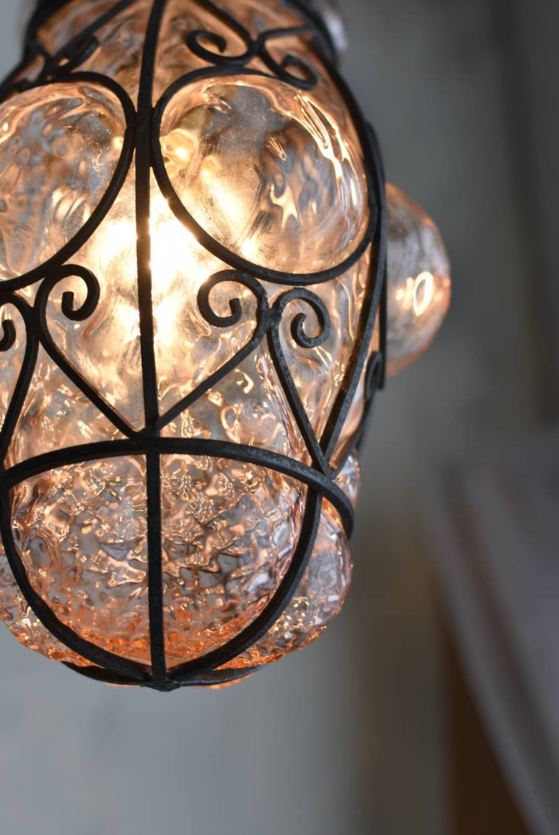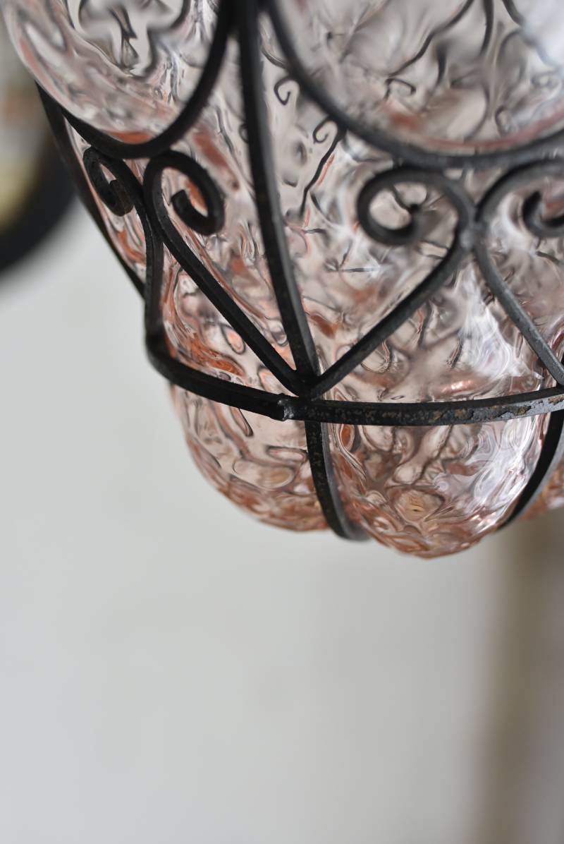こちらはイタリアのもの。ぷくぷくと膨らんだユニークなフォルムが特徴で、淡くクリアなピンクカラーがほんのり甘めな印象。くるんとまるまったアイアンフレームがピリッと雰囲気を引き締めてくれるデザインとなっています。明かりを灯すとガラスを通して揺らめくような表情が楽しめ、幻想的な空間作りに活躍してくれそう。