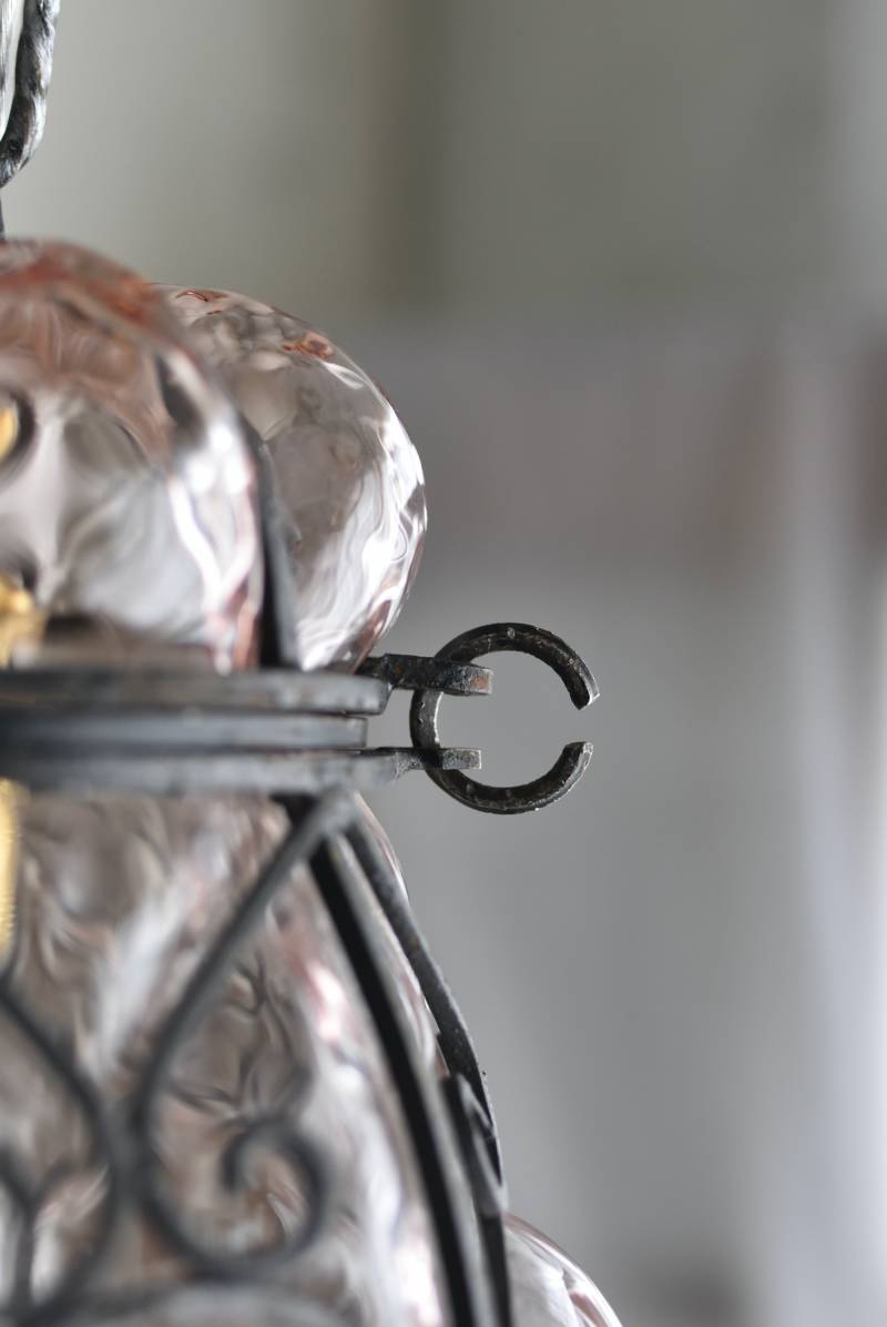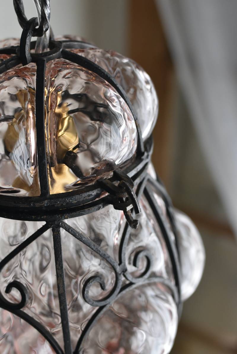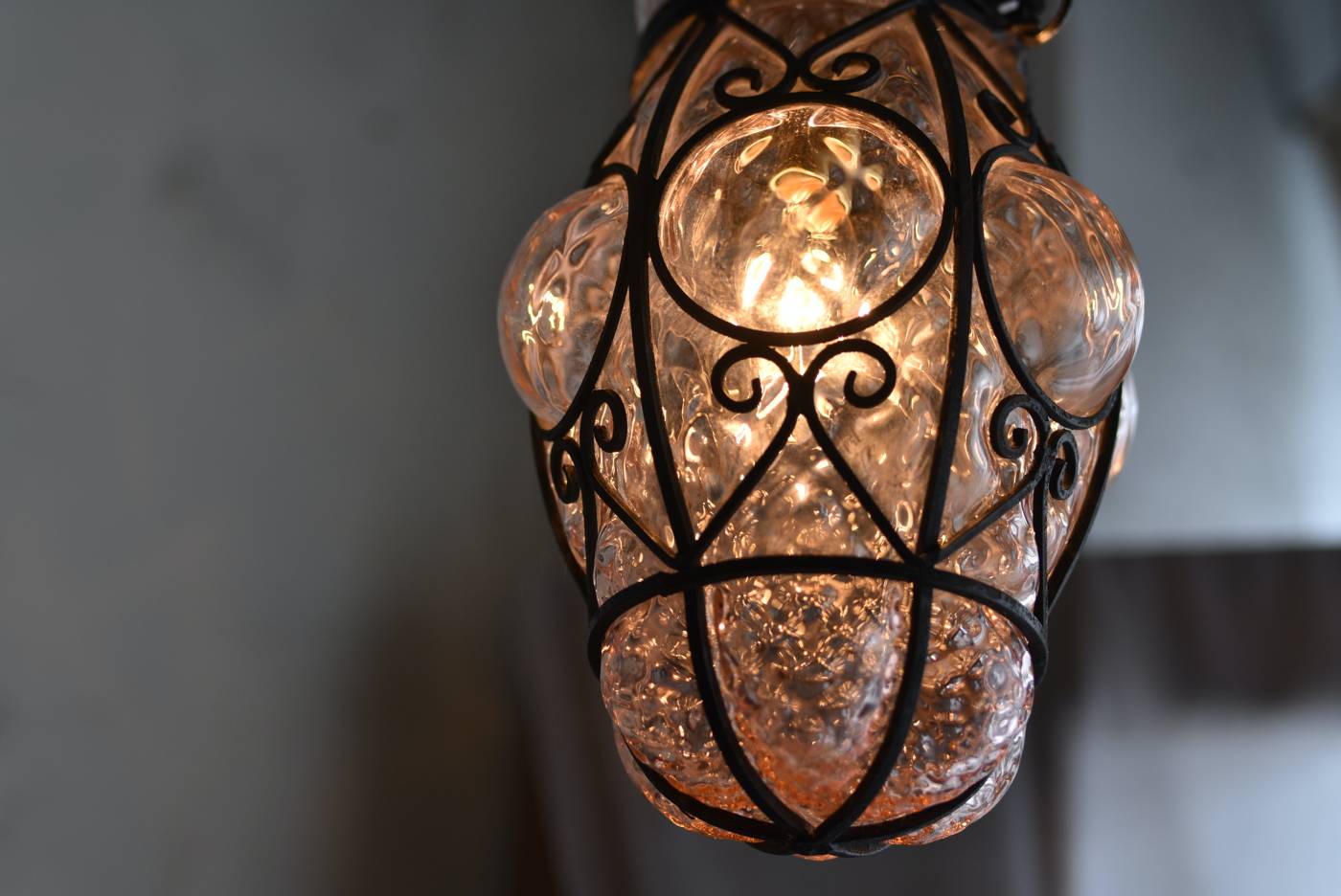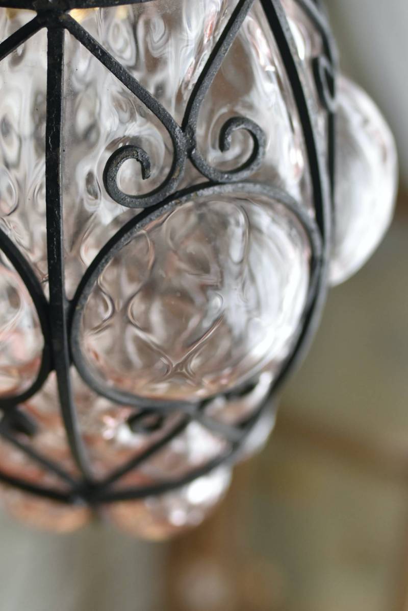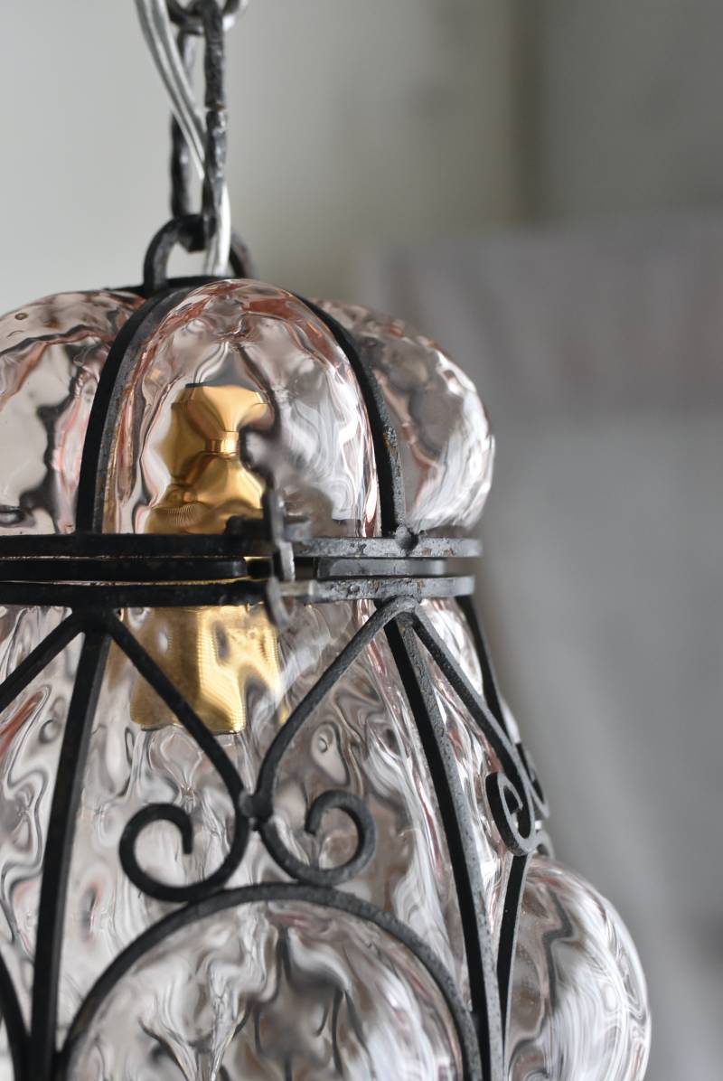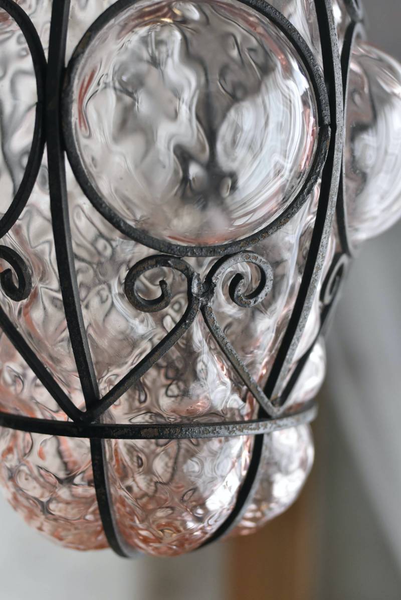 こちらはイタリアのもの。ぷくぷくと膨らんだユニークなフォルムが特徴で、淡くクリアなピンクカラーがほんのり甘めな印象。くるんとまるまったアイアンフレームがピリッと雰囲気を引き締めてくれるデザインとなっています。明かりを灯すとガラスを通して揺らめくような表情が楽しめ、幻想的な空間作りに活躍してくれそう。