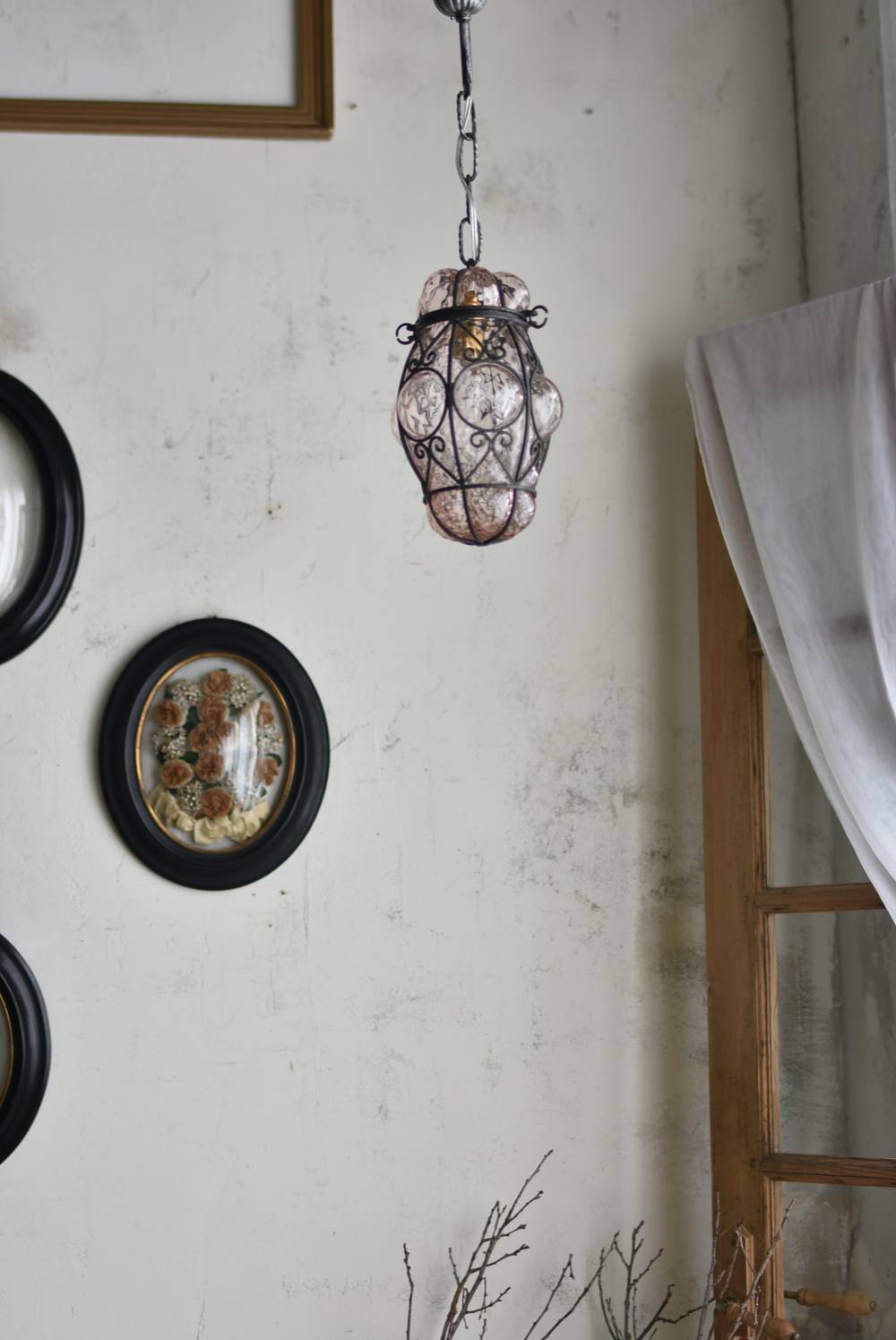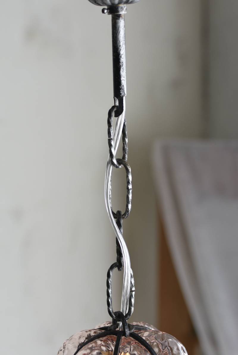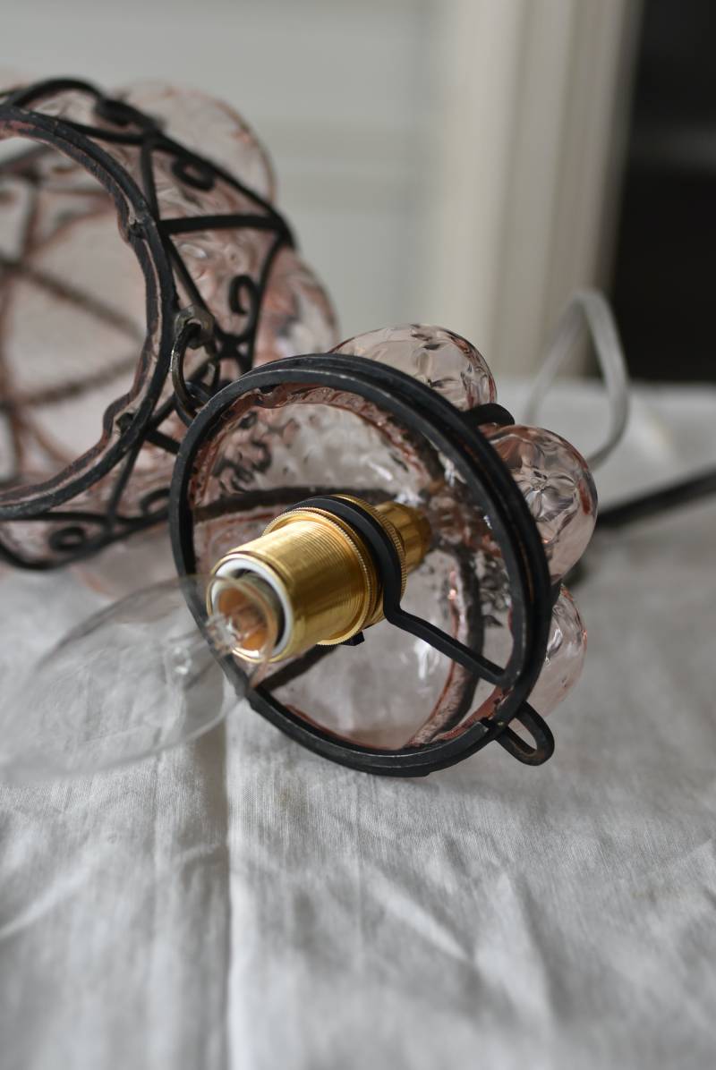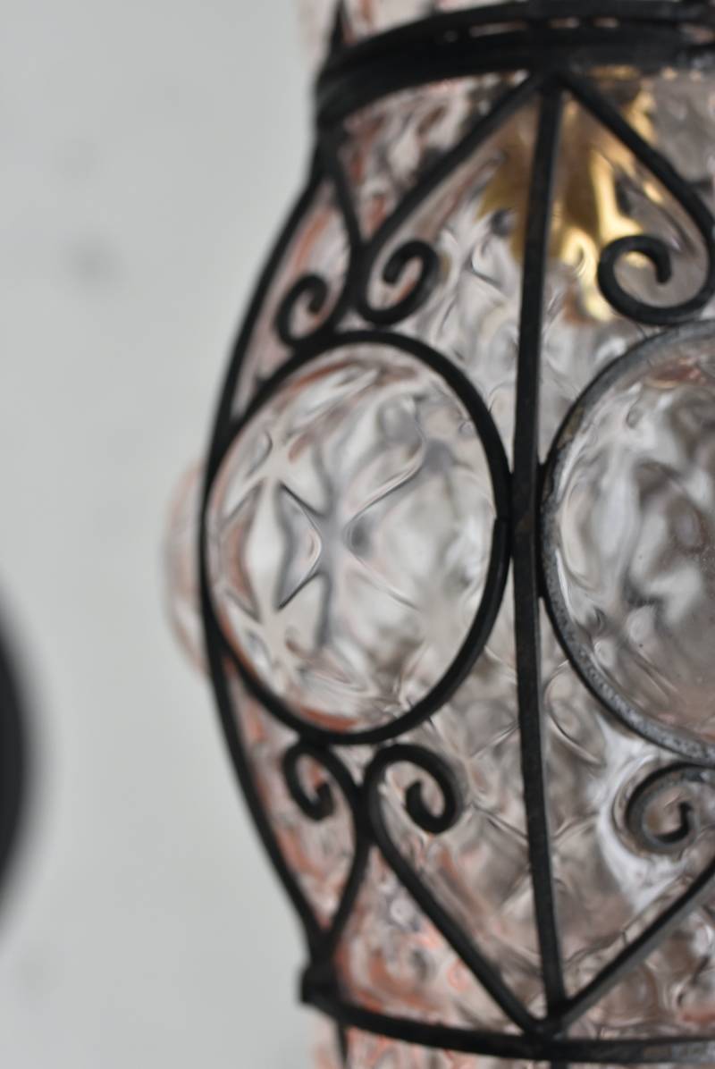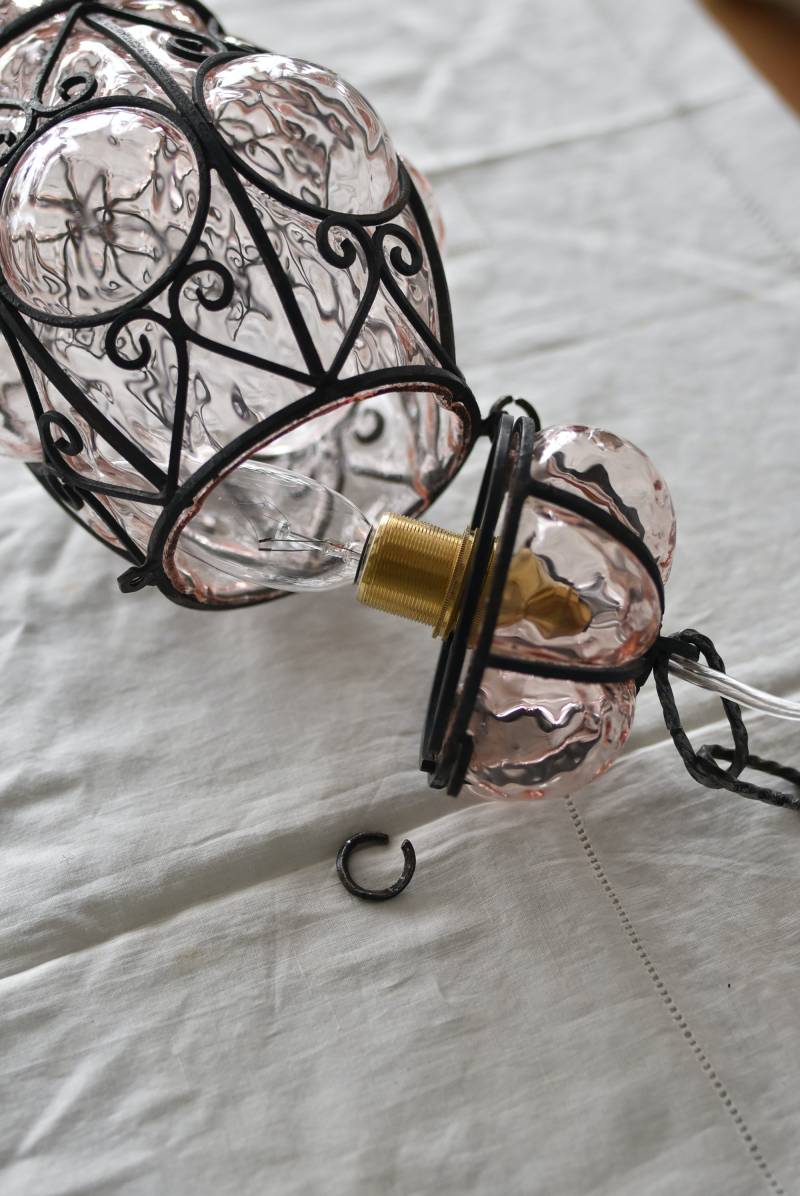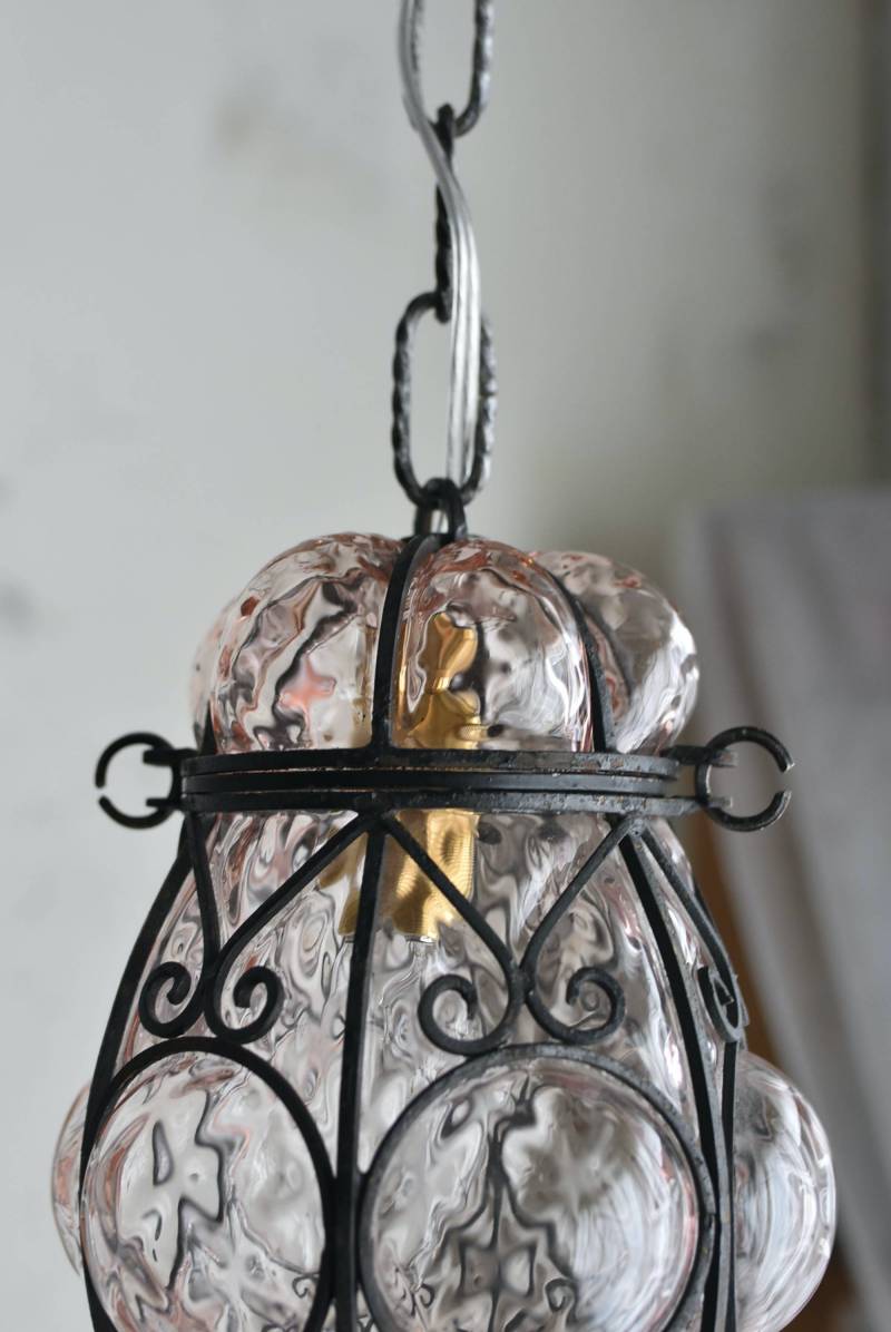 こちらはイタリアのもの。ぷくぷくと膨らんだユニークなフォルムが特徴で、淡くクリアなピンクカラーがほんのり甘めな印象。くるんとまるまったアイアンフレームがピリッと雰囲気を引き締めてくれるデザインとなっています。明かりを灯すとガラスを通して揺らめくような表情が楽しめ、幻想的な空間作りに活躍してくれそう。