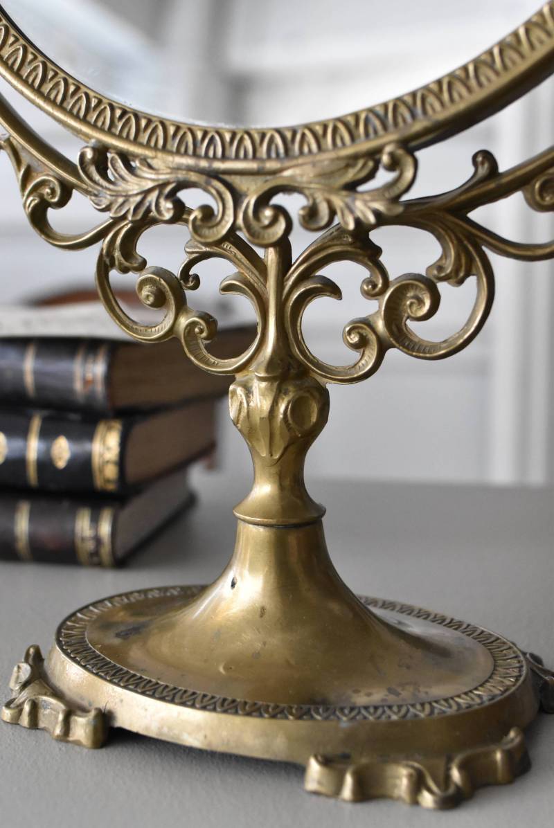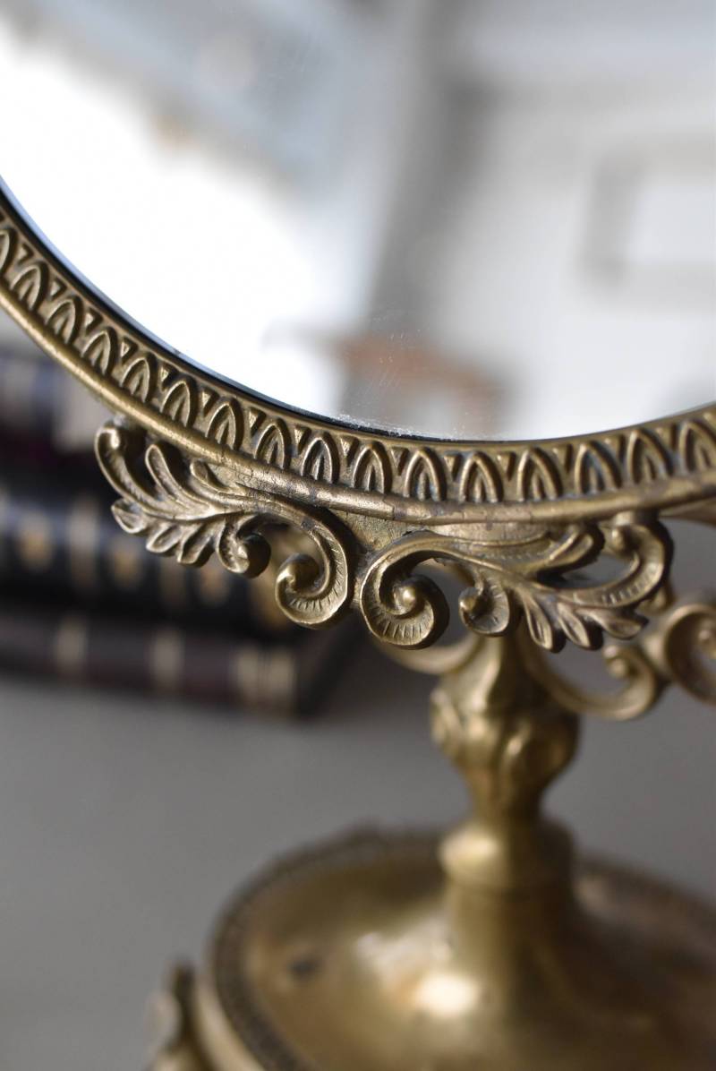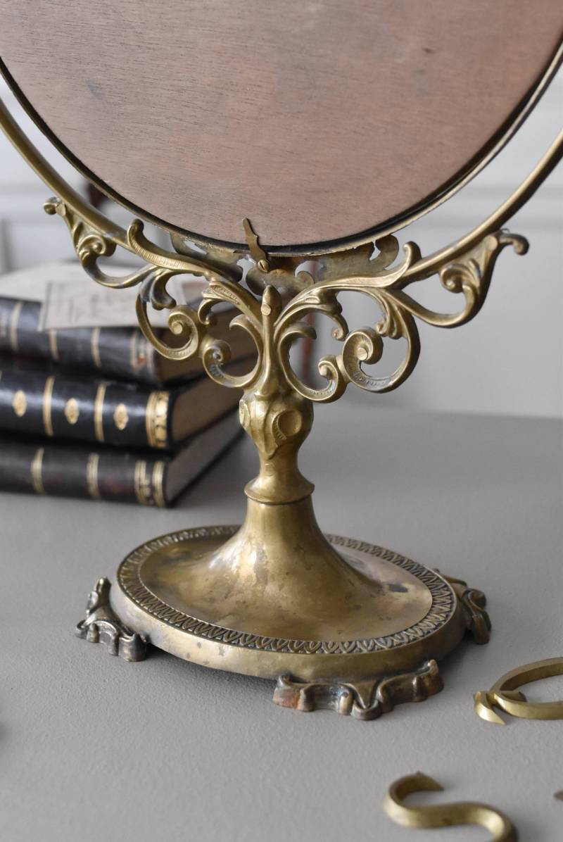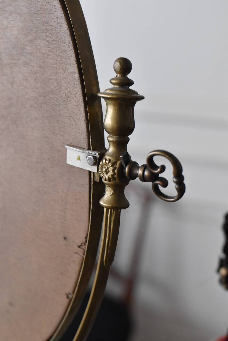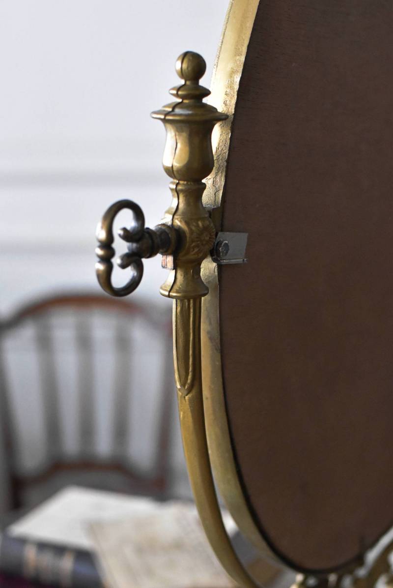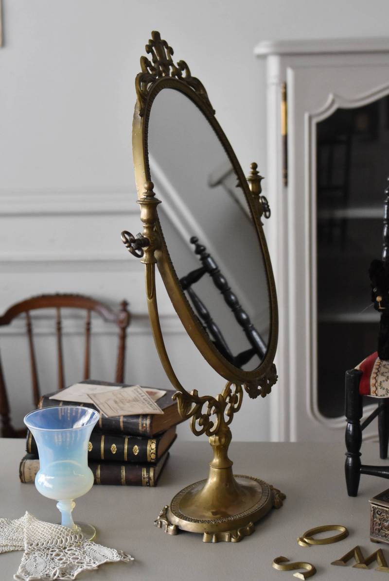 比較的大きめサイズのフレンチスタンドミラー。 すっきりとしたオーバル型になったミラー周りが豪華に彩られ、上下のくり抜かれた繊細な装飾や花びらモチーフのような連続模様で囲まれた可憐な雰囲気が漂います。真鍮ならではの経年による深みのある風合いが漂い、植物モチーフとなったラインの先がくるんと巻かれた流れるような姿は卓上を雰囲気を高めてくれそうです。 鏡面は新しく交換しています。両サイドのつまみを緩めるとミラーの角度を調節することが可能です。 W 約39cm D 約12cm H 約57cm 鏡面積 W約25.5cm×H約33cm